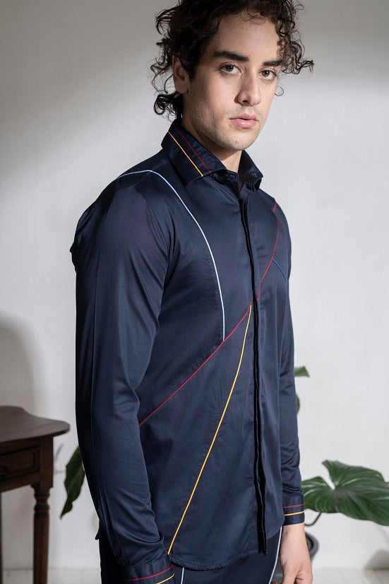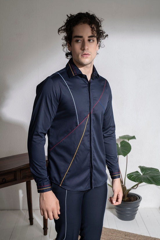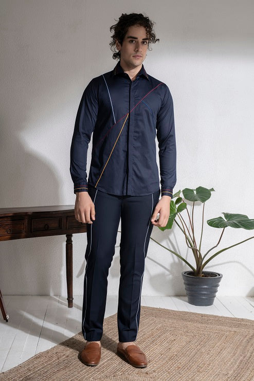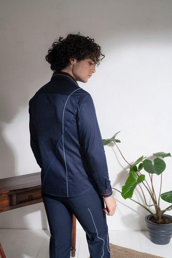 Featuring a blue shirt in cotton base with fabric piping. This contains one piece only.