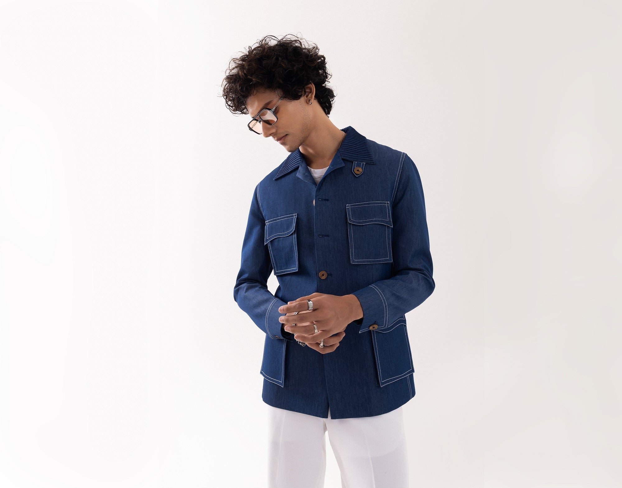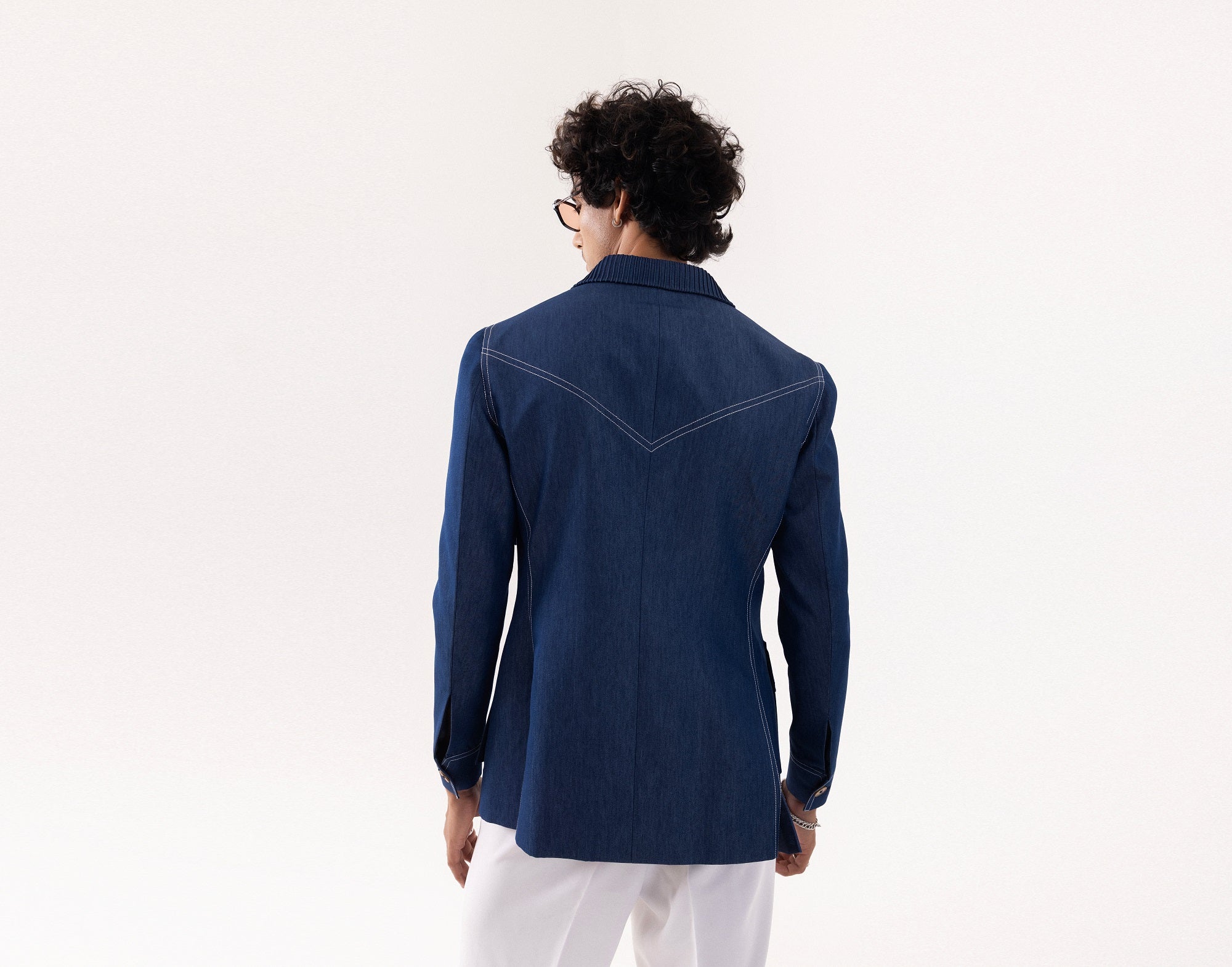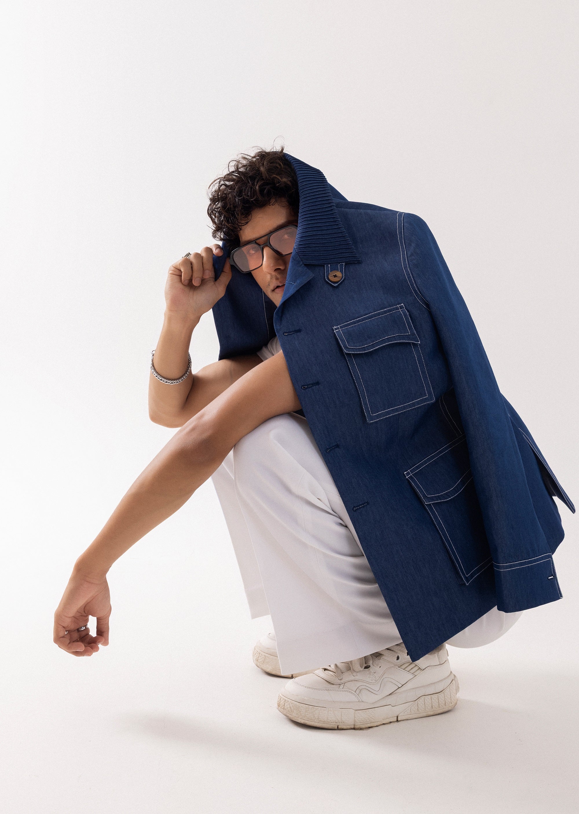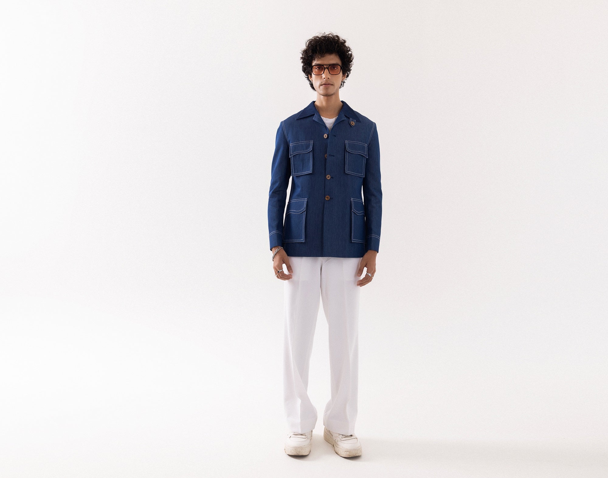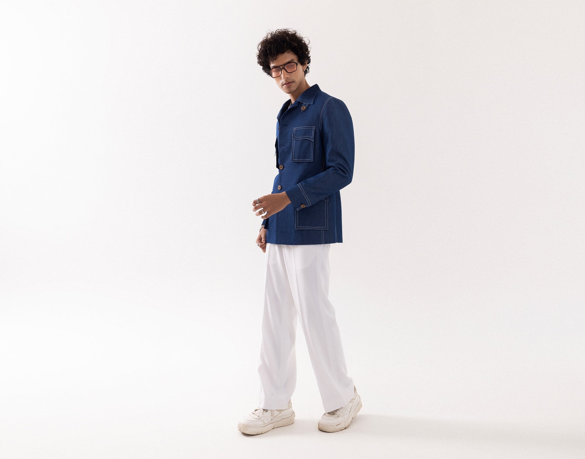 A denim fabric shacket, blending the structure of a jacket with the comfort of a shirt. Crafted from mid-weight denim, this versatile piece features contrast ivory stitchline detailing that adds a refined, tailored touch against the rugged texture of the denim. Designed for both utility and style, the shacket includes two front patch pockets with flaps, enhancing its workwear-inspired aesthetic while providing functional storage. The structured collar and button-down front complete the look, making it perfect for layering over a tee or under a heavier coat.