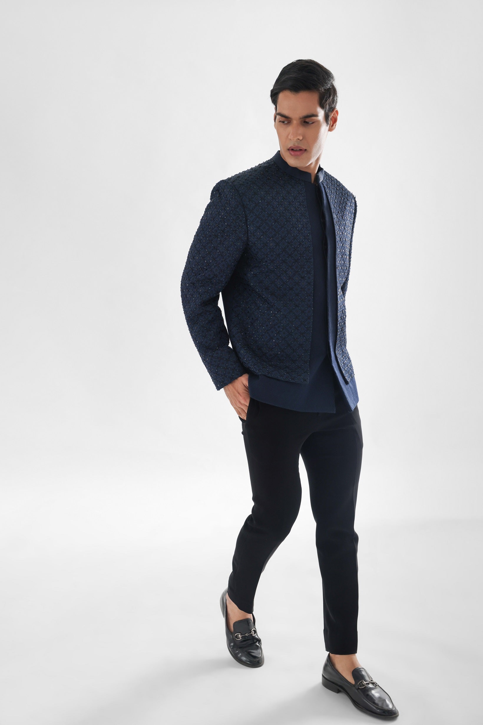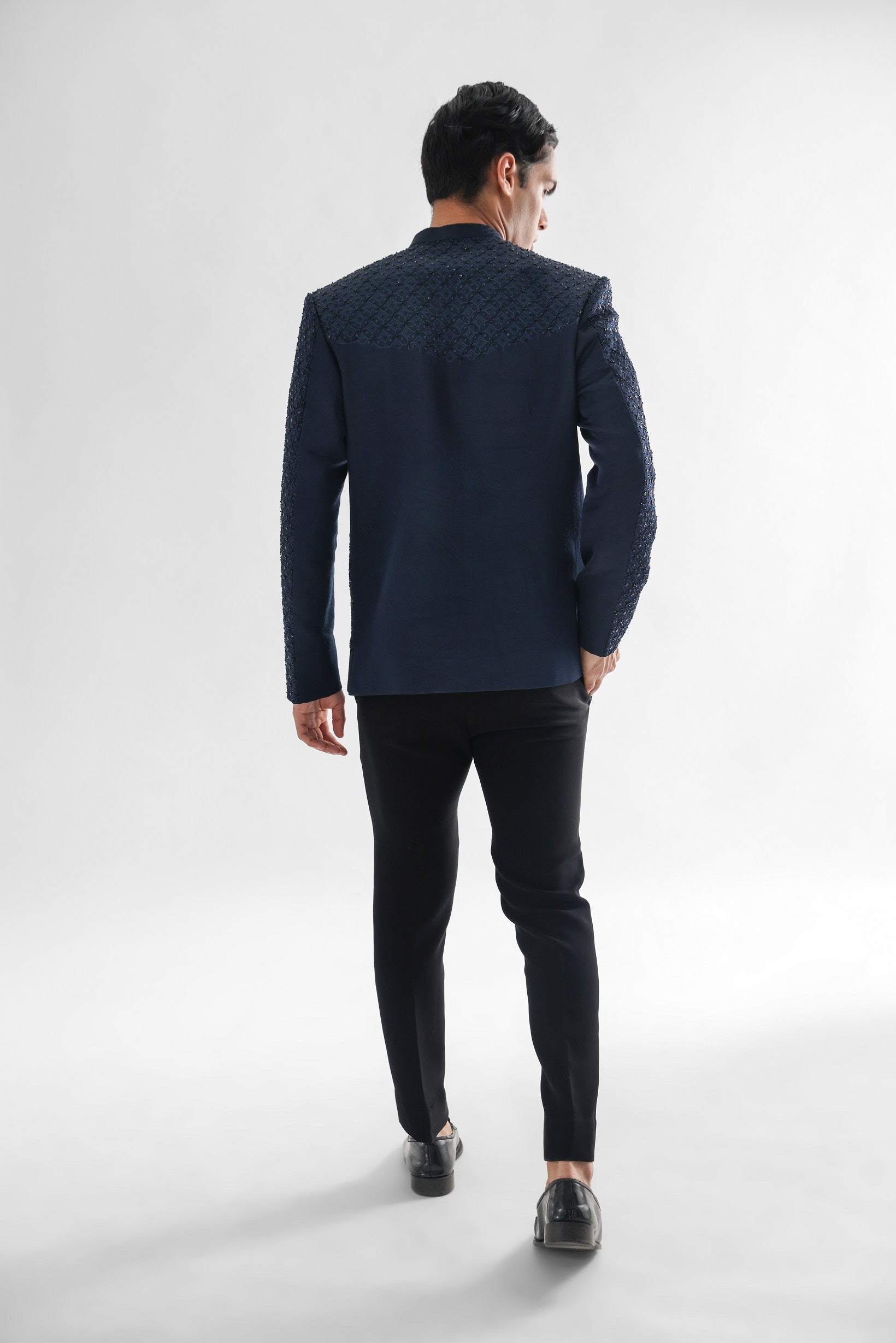 DOUBLE PANEL  FRENCHKNOT  EMBROIDERED  BANDHGALA HIGHLIGHTED WITH KATDANA PAIRED  WITH BLACK TROUSER.