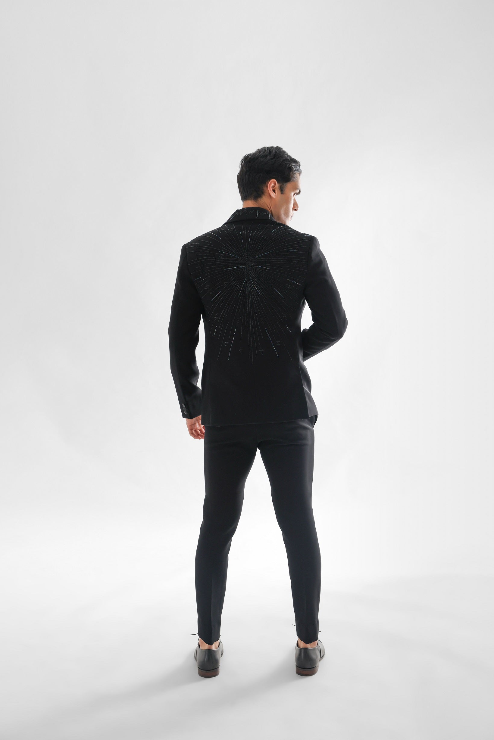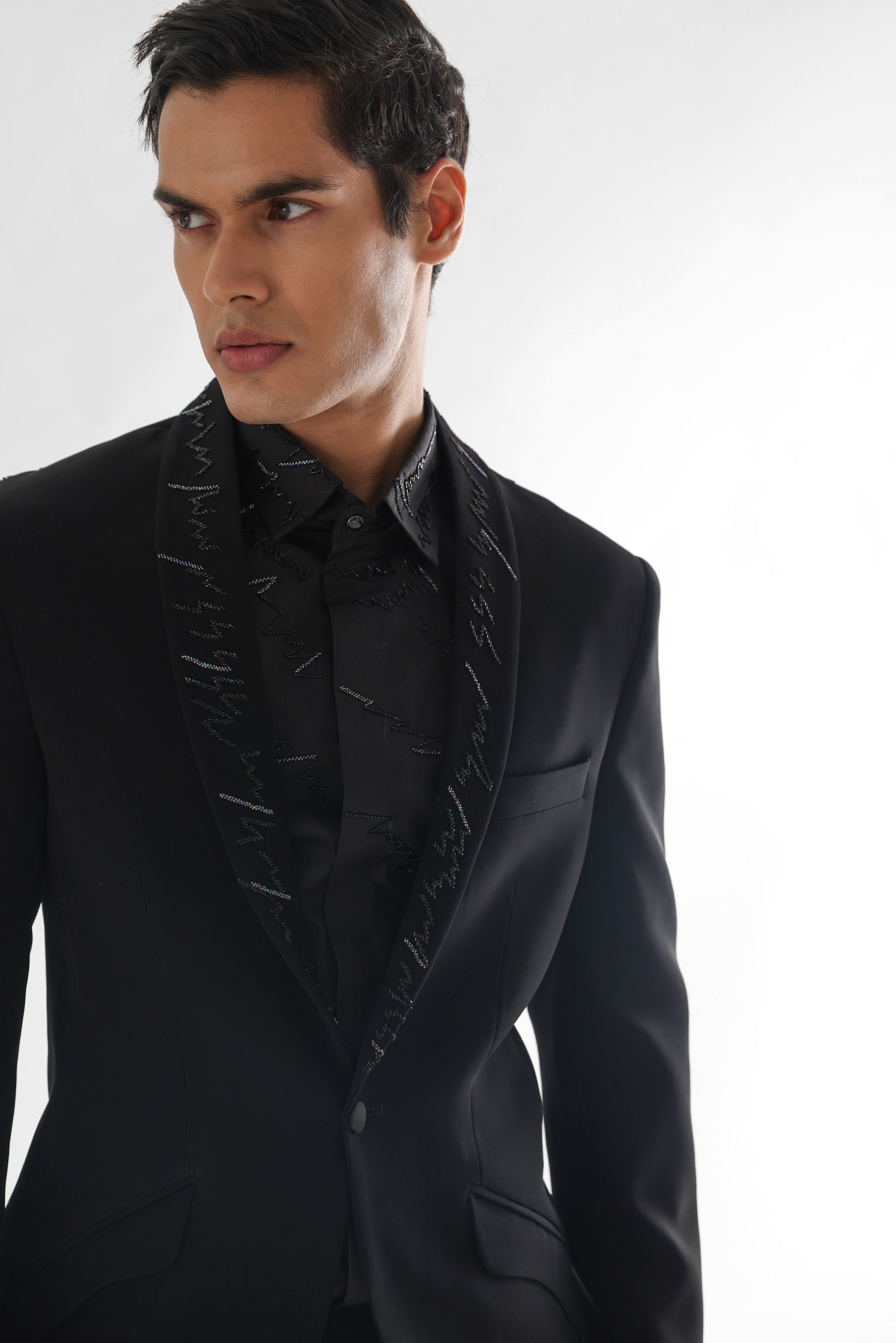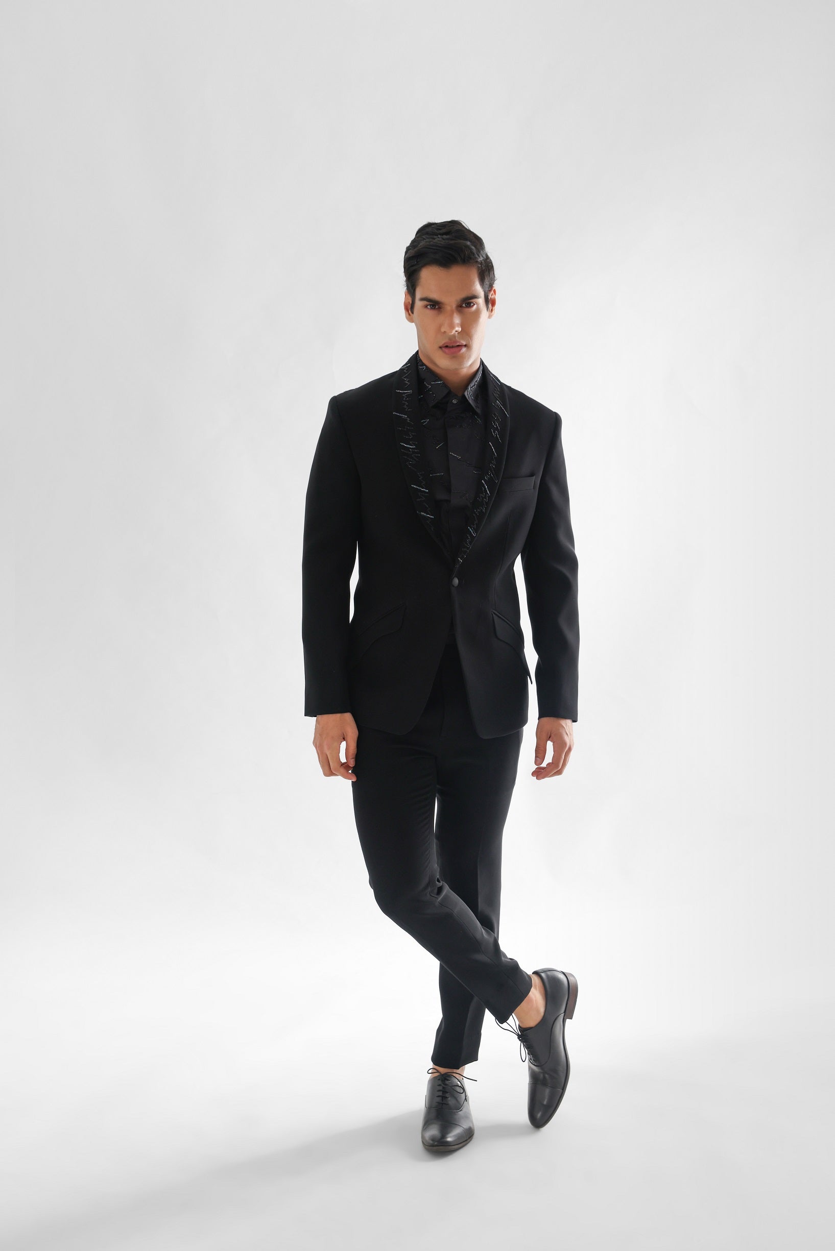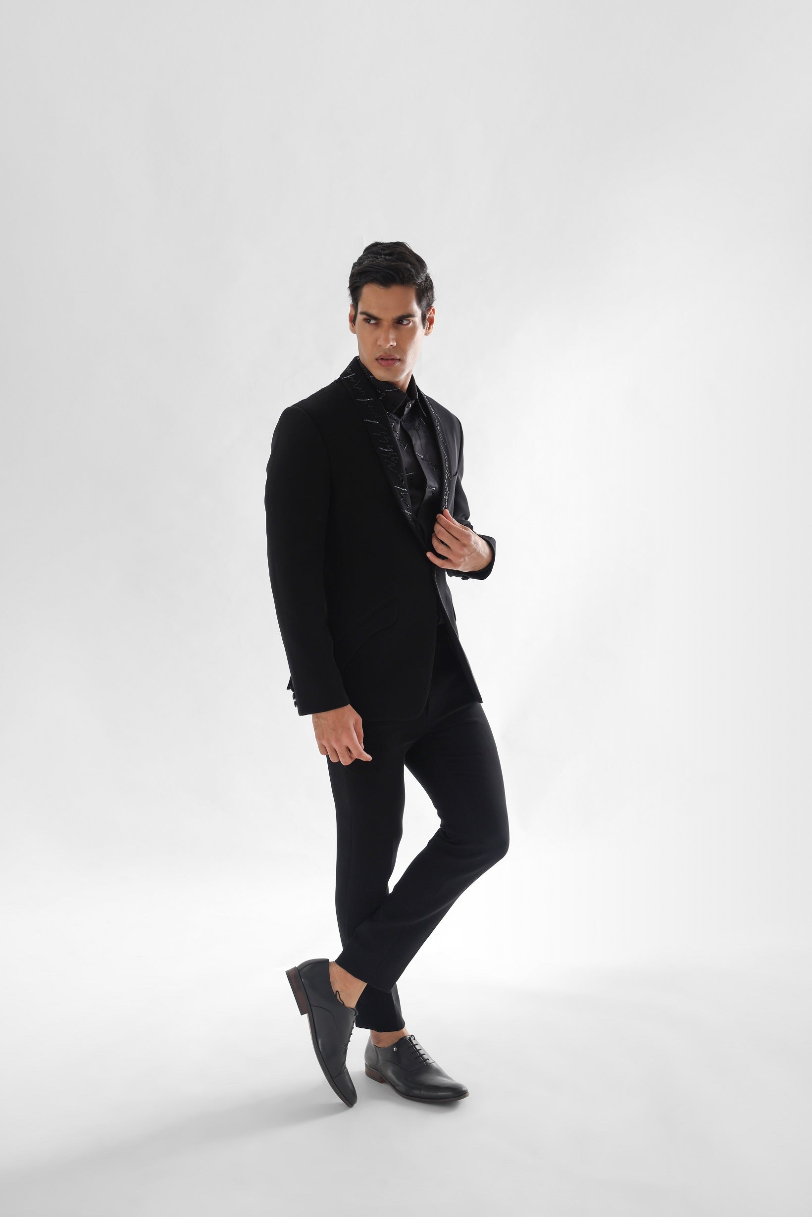 Jet Black Tuxedo set with Contemporary embroidery detail on thhe lapel and the back of the blazer. Paired wit slim fit trouser. THIS SET INCLUDES TUXEDO AND TROUSER. PLEASE NOTE: SHIRTS ARE NOT INCLUDED IN THE SET.