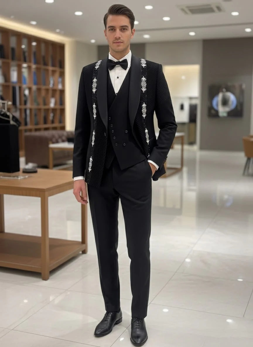 Make a powerful style statement with this Men’s 3-Piece Black Tuxedo Suit, crafted for luxury occasions and refined elegance. Designed with a modern slim-fit silhouette, this tuxedo features a sharply tailored jacket accented with elegant embroidered detailing along the front panels, adding a distinctive and premium touch. The set includes a matching waistcoat and trousers, creating a polished, coordinated look ideal for black-tie events, weddings, receptions, and formal evenings. The satin shawl lapel enhances its classic tuxedo appeal, while the structured tailoring ensures a confident, flattering fit.