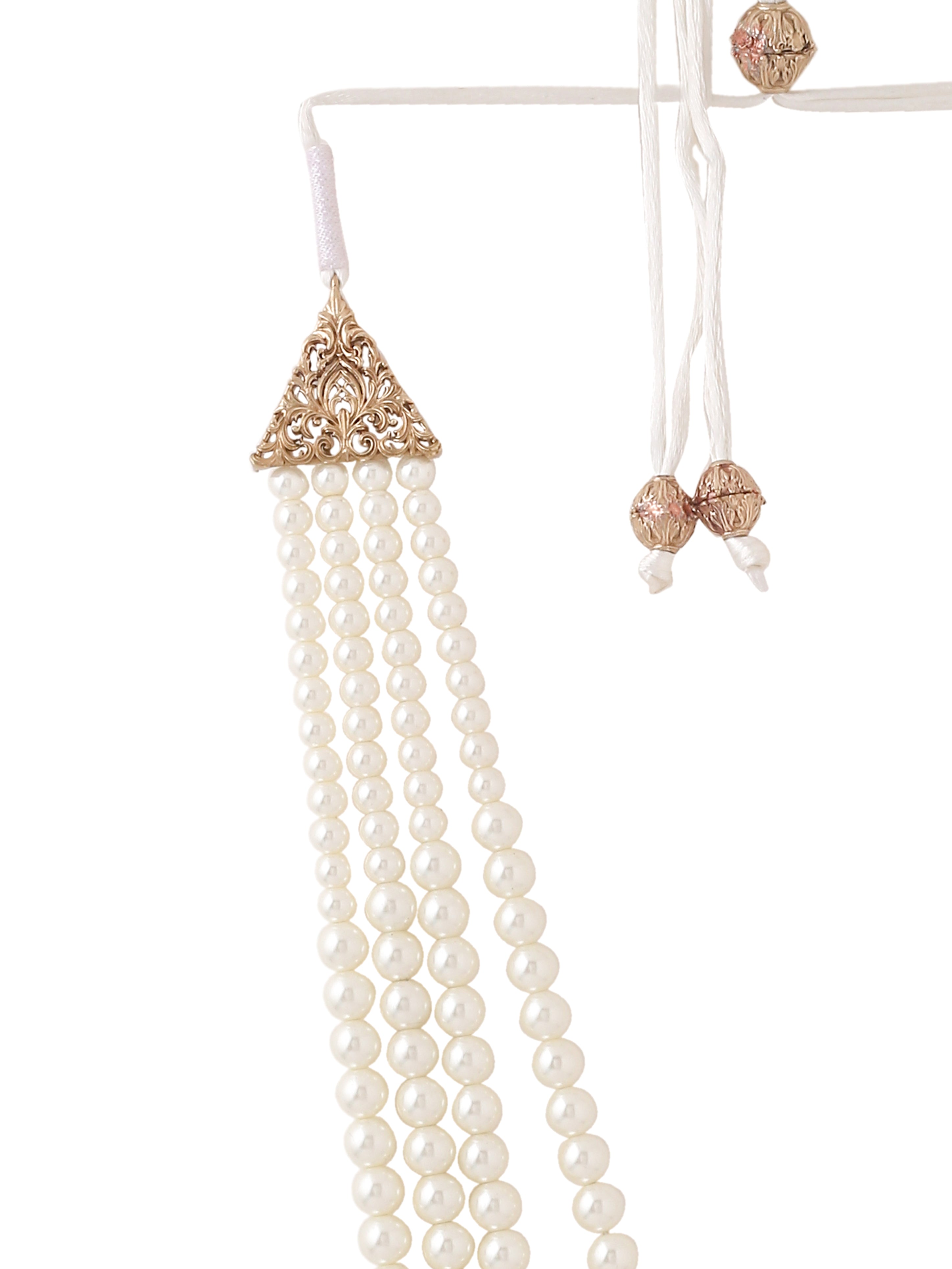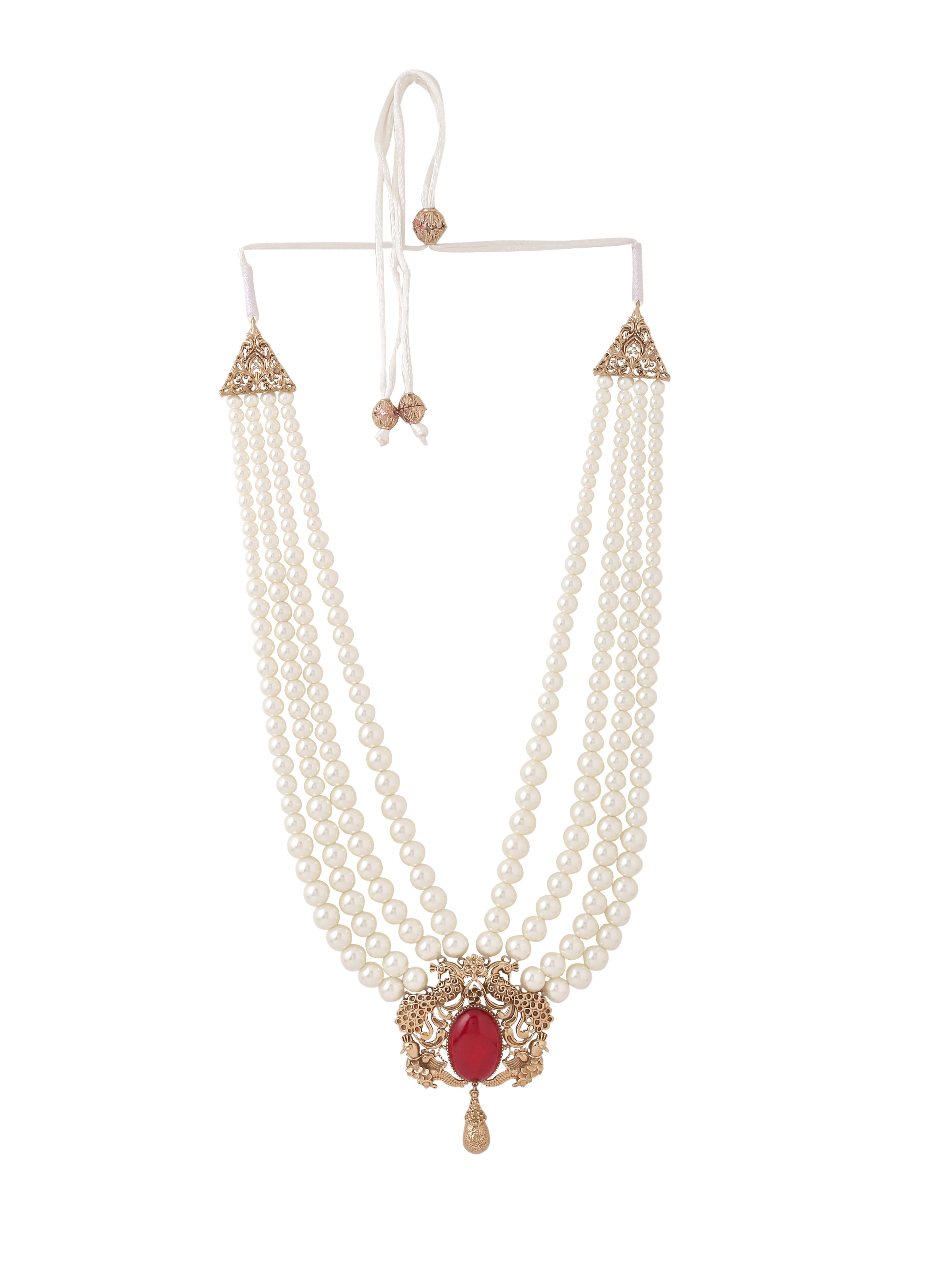 The Peacock White Mala features two peacocks and a striking red gemstone. Its design highlights fine detailing, offering a versatile accent that effortlessly complements your attire.