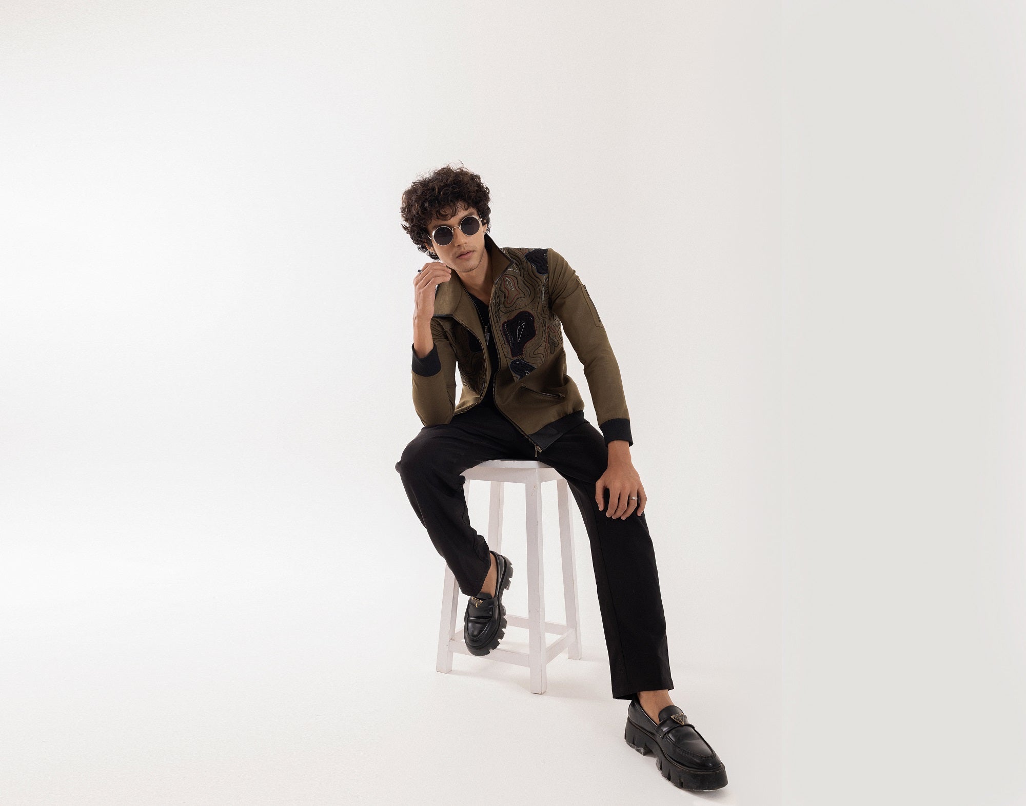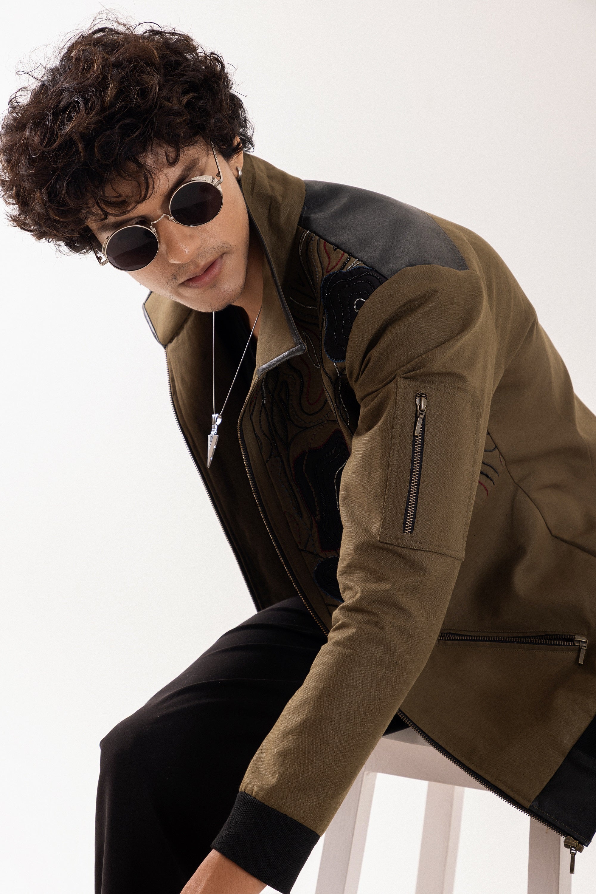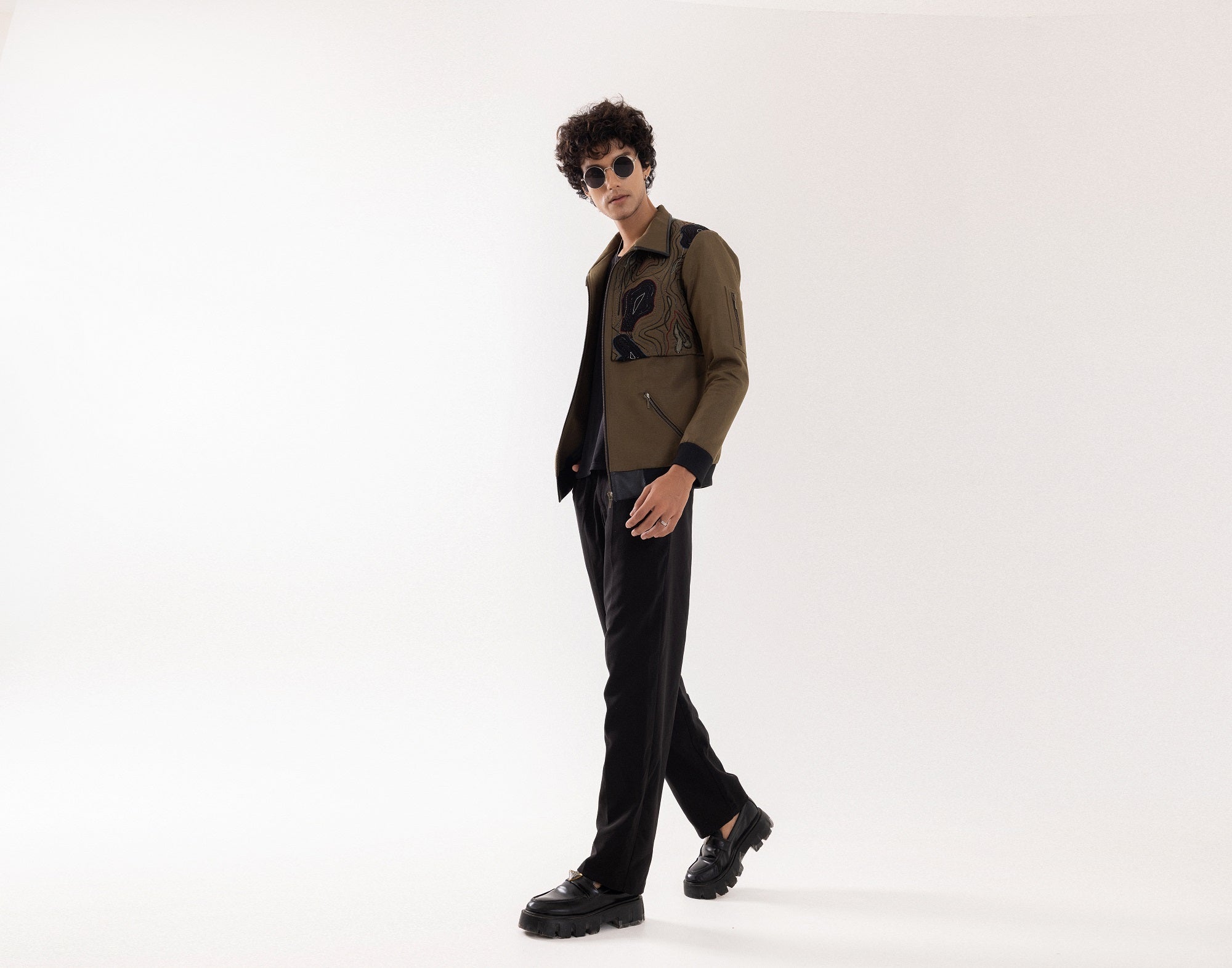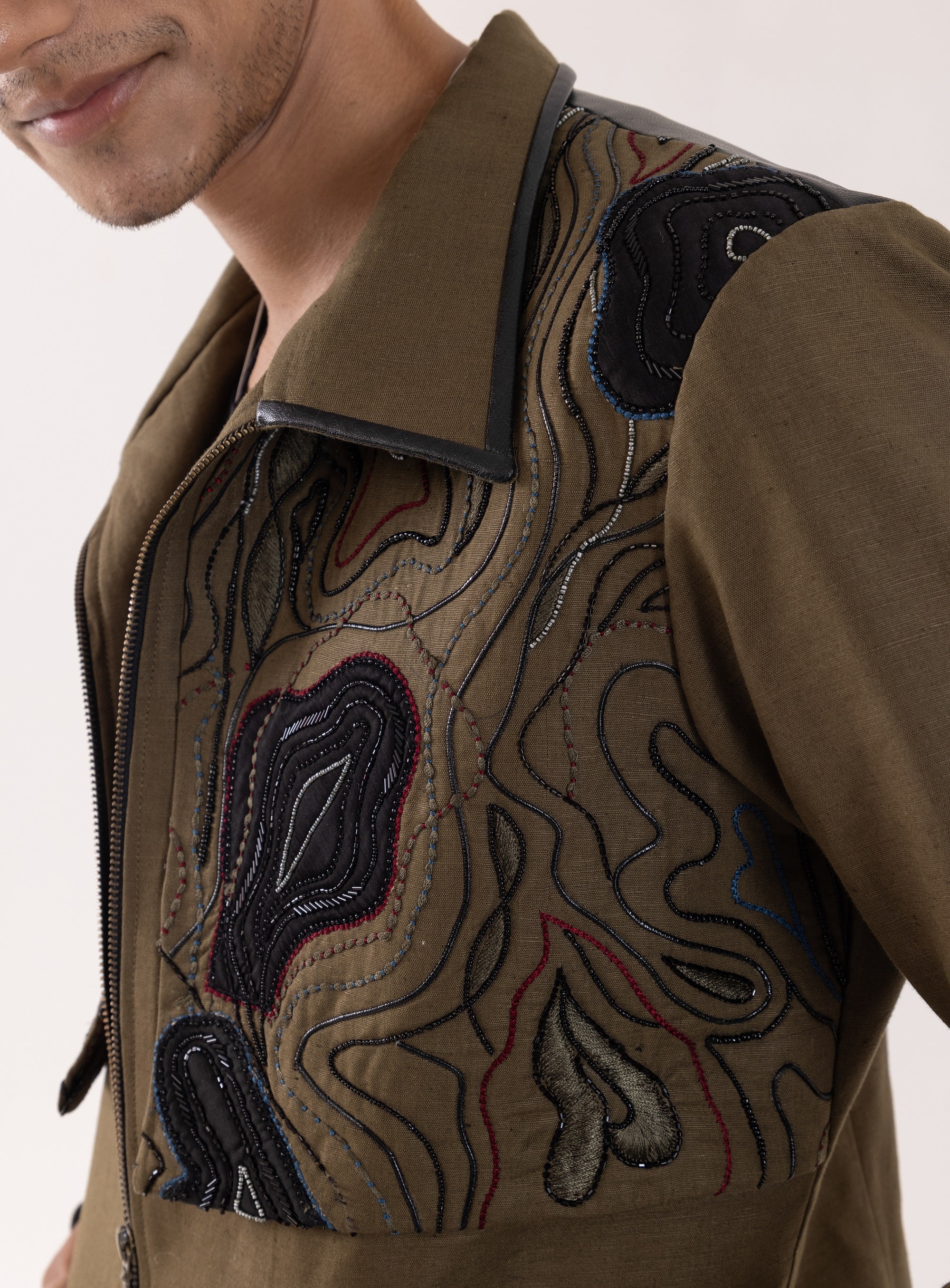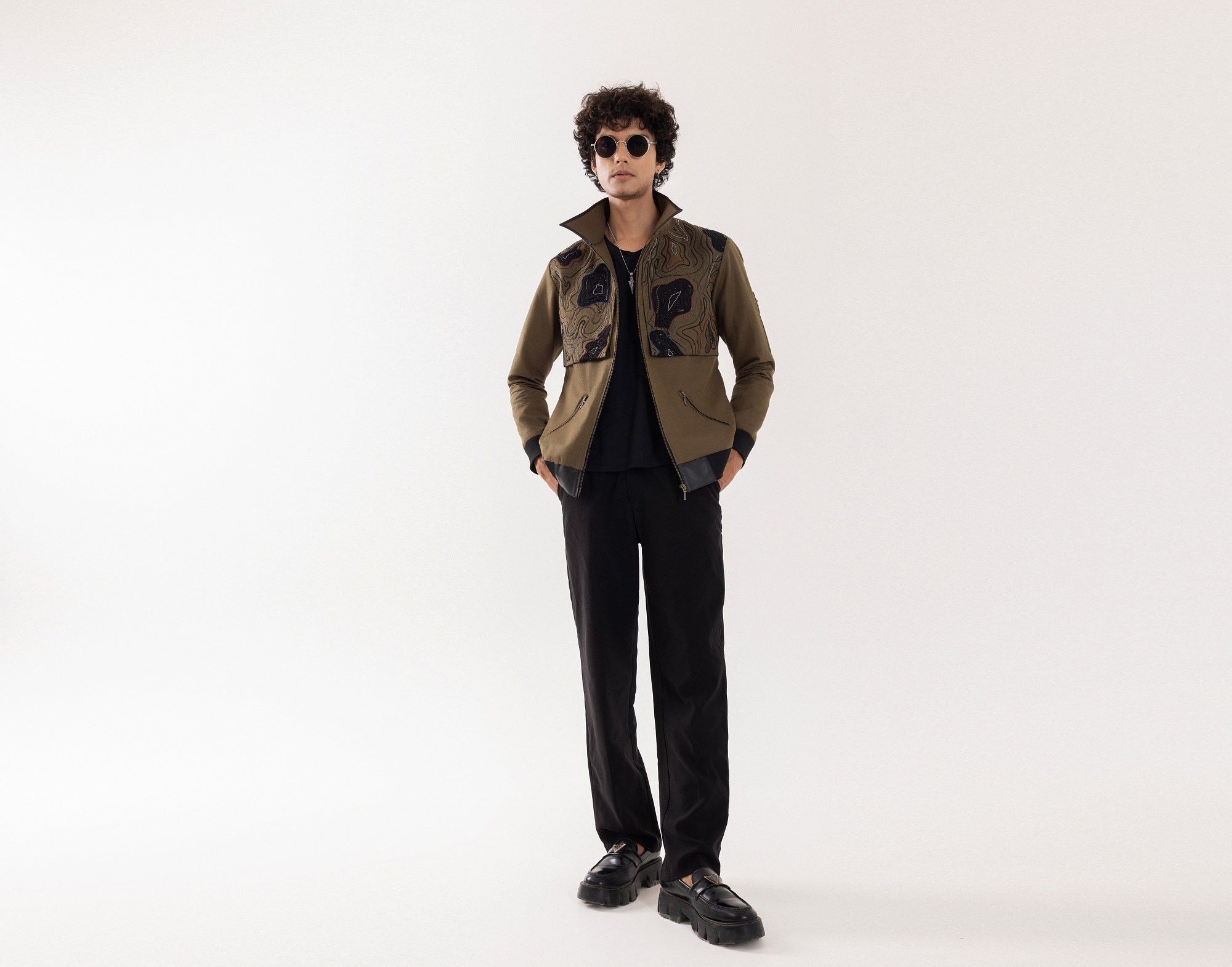 This olive green bomber jacket features a distinctive extended panel adorned with striking black patchwork, adding depth and contrast to the design. The panel is richly embellished with sleek leather cords and beads arranged in abstract patterns, creating a dynamic interplay of texture and form. Combining rugged elegance with artisanal detail, this jacket makes a bold statement while maintaining versatile, contemporary appeal.
