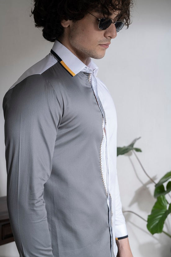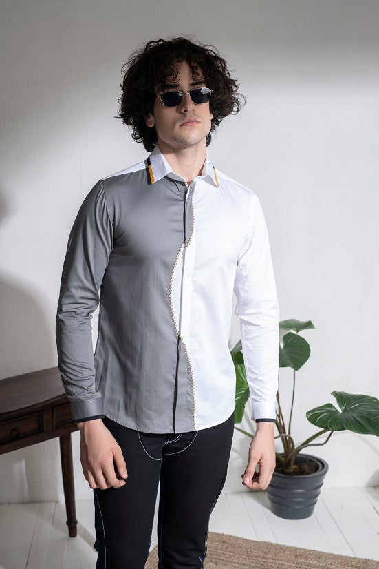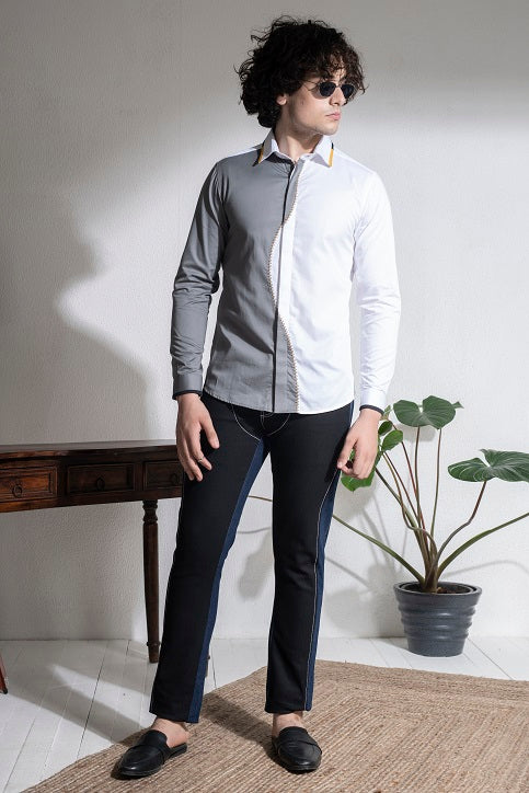 Featuring a white and black shirt in cotton base with zig-zag stitch line. This contains one piece only.