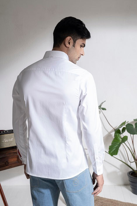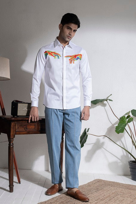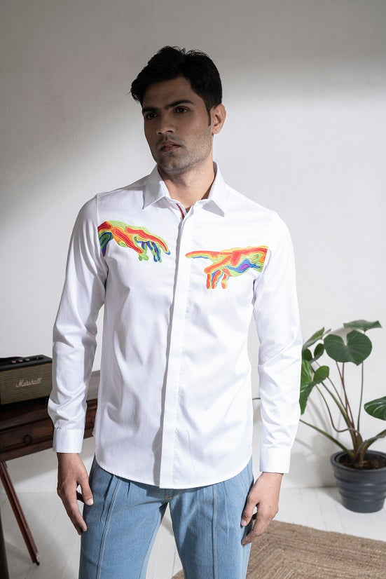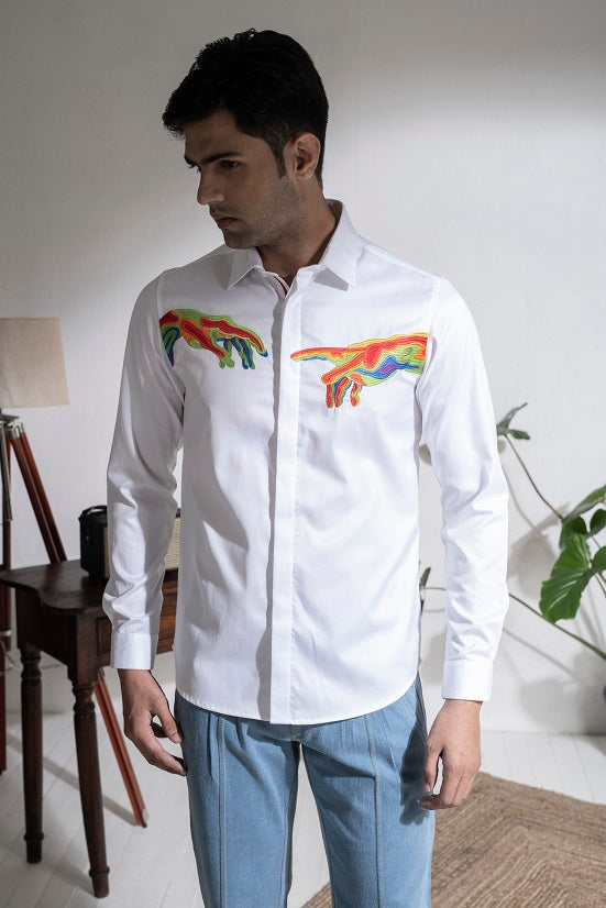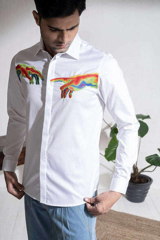 Featuring a white shirt in cotton base with multi-coloured embroidery . This contains one piece only.