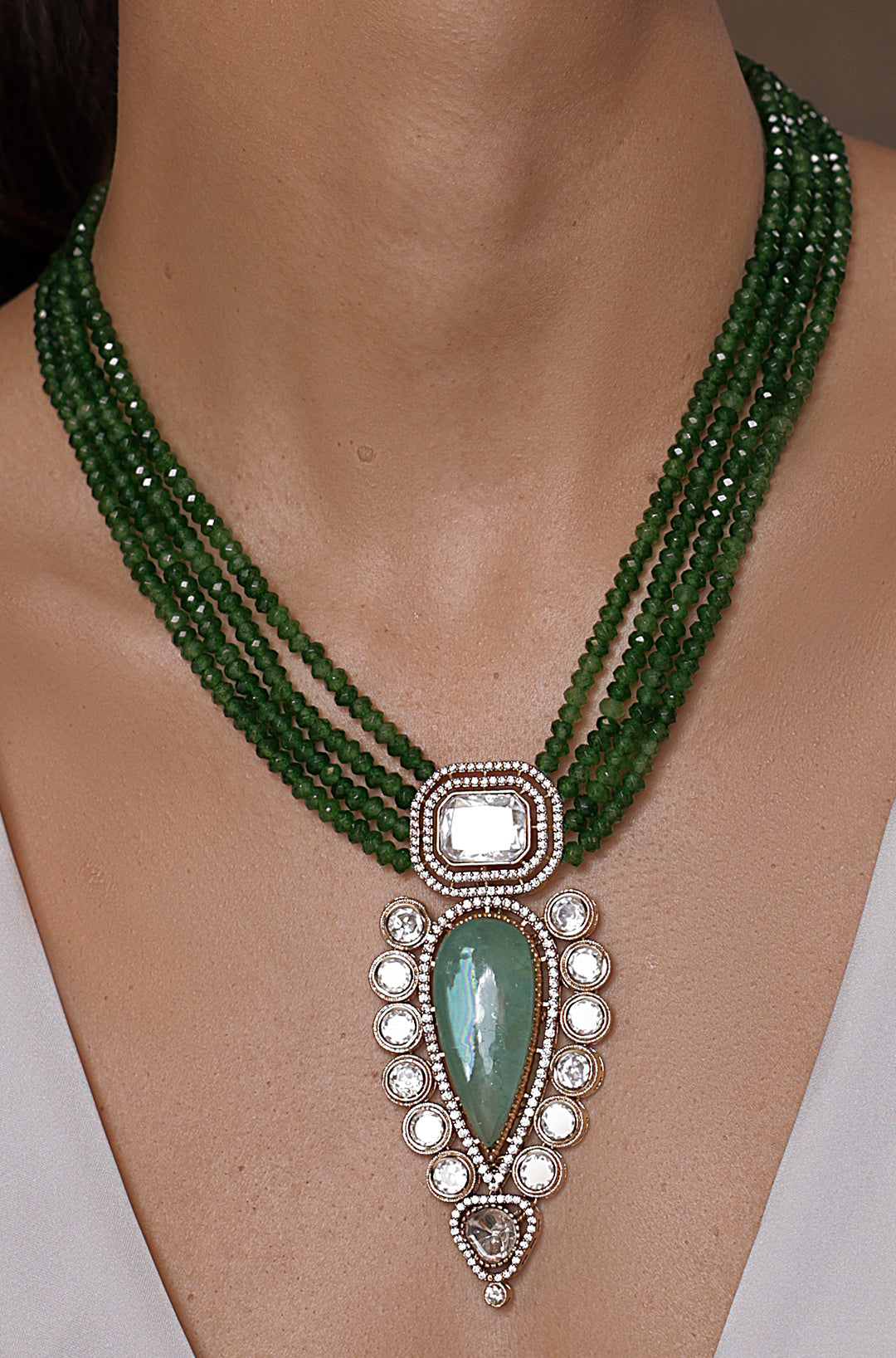Adorn Yourself With This Exquisite Necklace Featuring Deep Green Stones And Polki Accents. Its Design Fuses Traditional Elegance With A Touch Of Contemporary Grace, Ideal For Festive Events