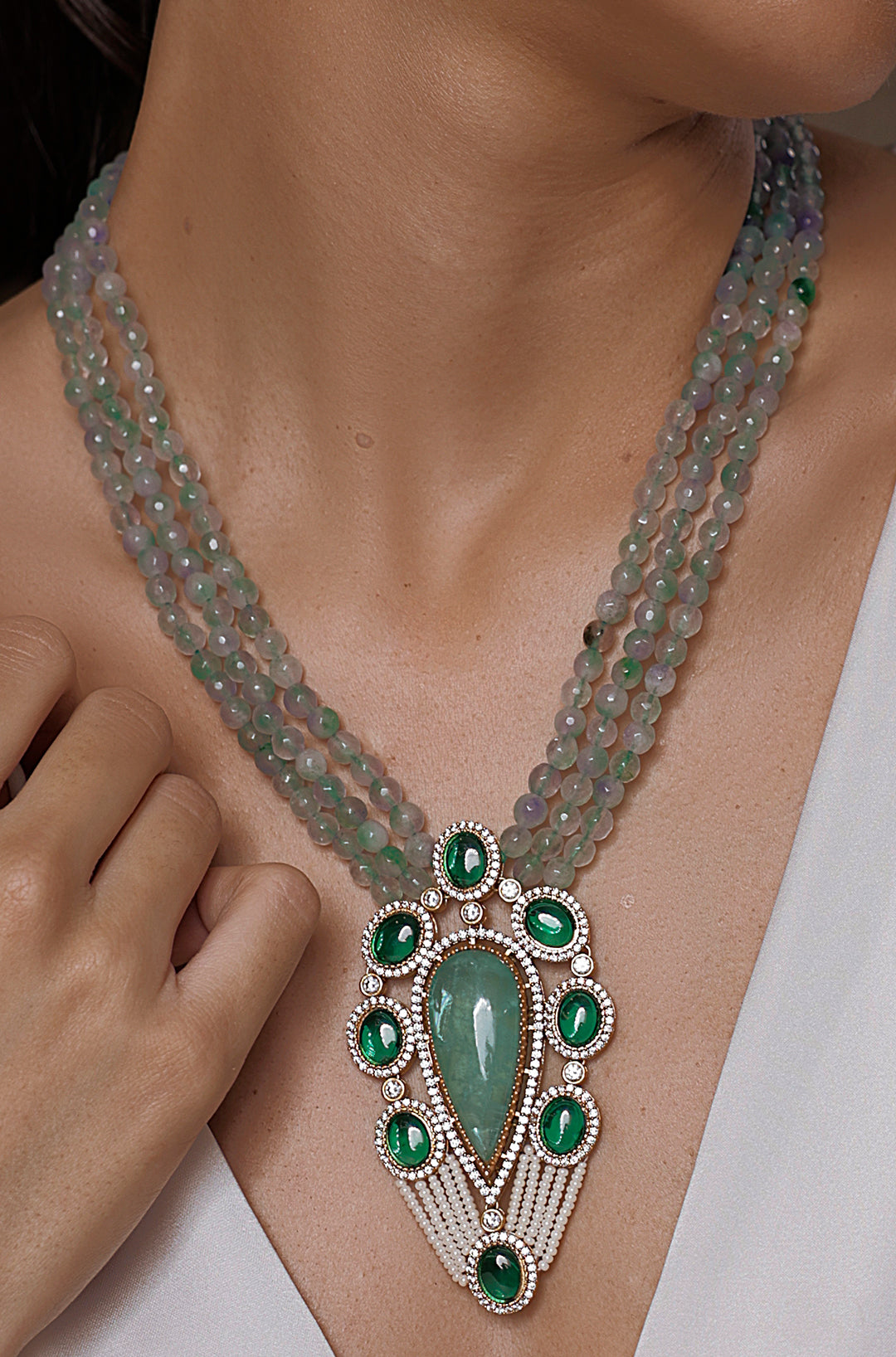This Necklace Creates A Striking V-Shape When Worn, Adorned With Vibrant Green Polki Stones And Colorful Accents. The Design Merges Dynamic Form With Traditional Beauty, Perfect For Making A Statement.
