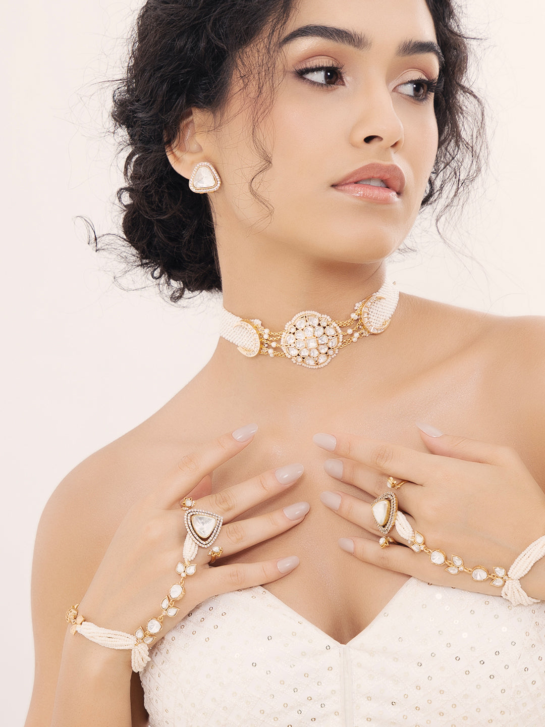 | A sophisticated choker necklace featuring polki pearls and white stones. |
