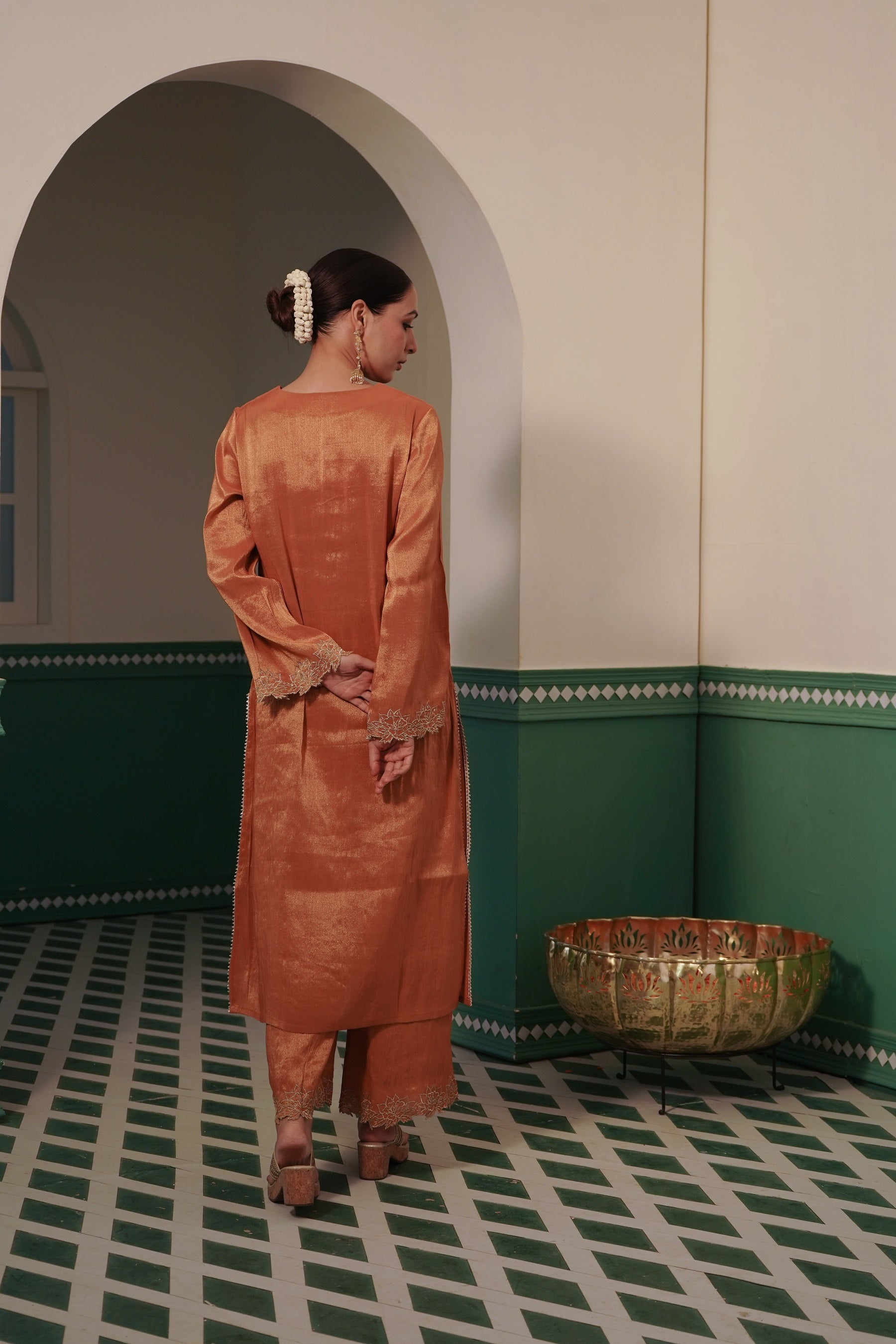 -Kurta in Amber Tissue Fabric with slits adding movement.