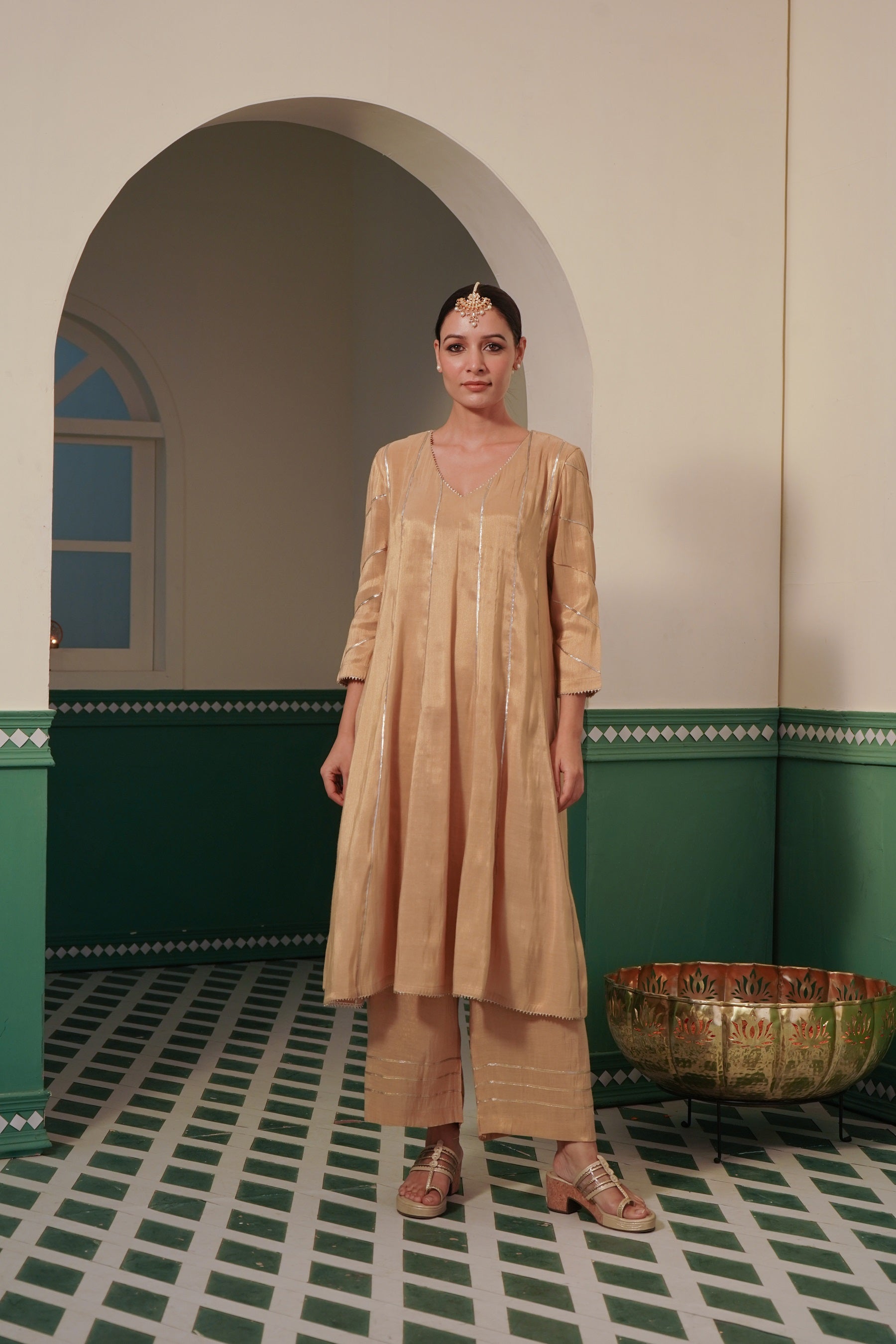 -Anarkali Kurta in Gold Tissue Fabric with multiple panels.