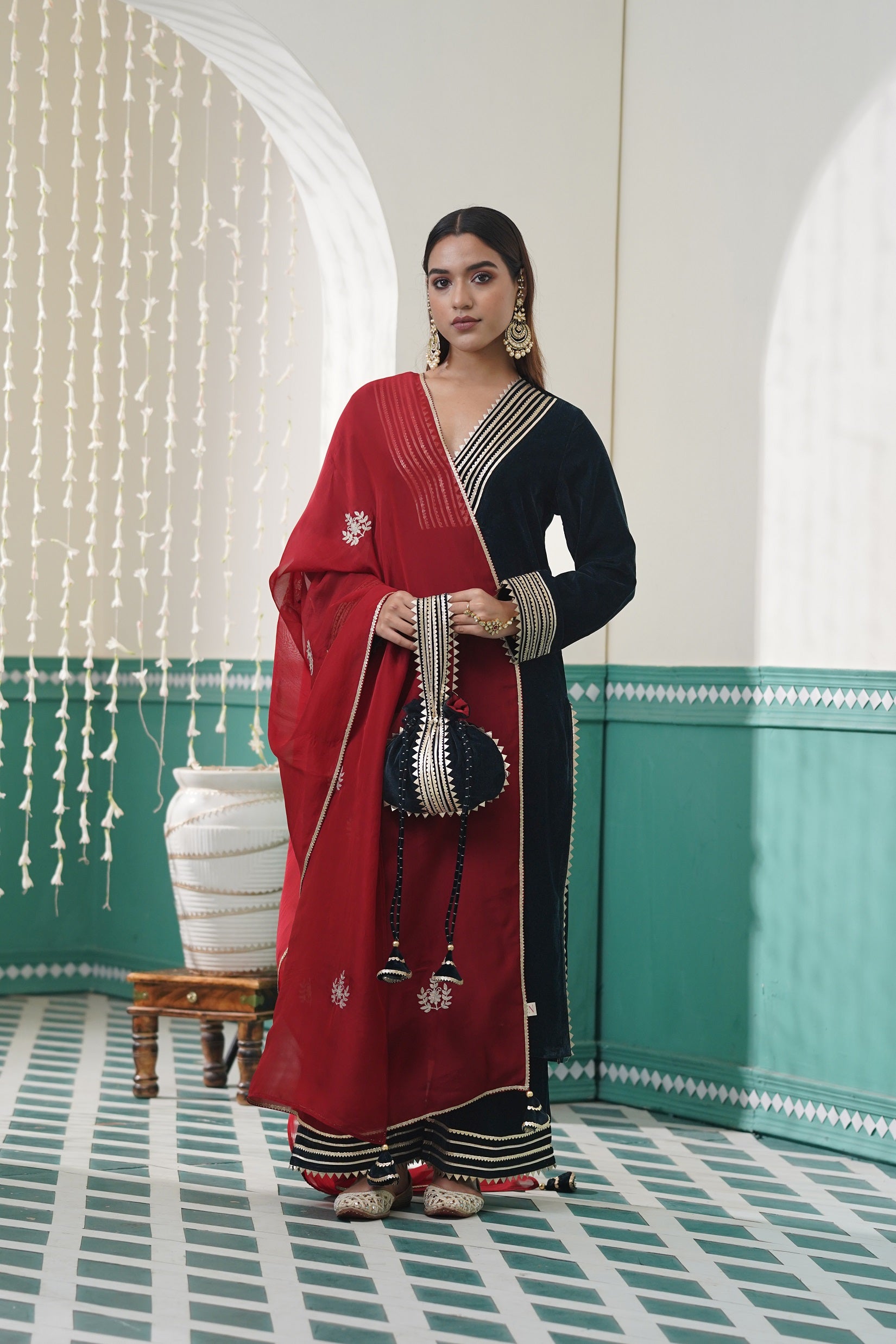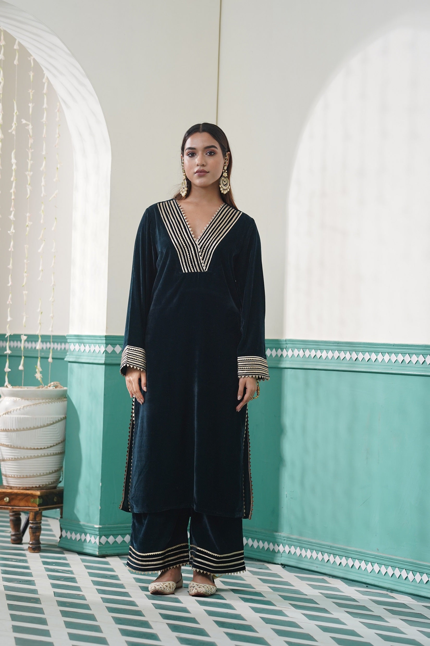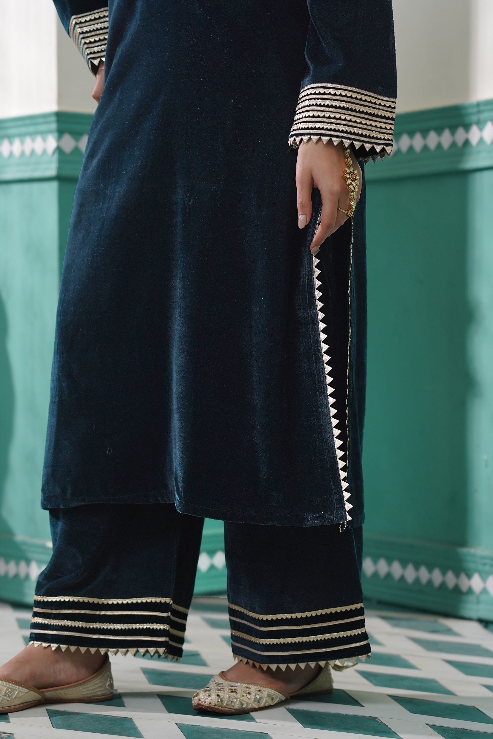 -Pair it with wide legged pant in shadow green velvet fabric with gota lace embellishment.