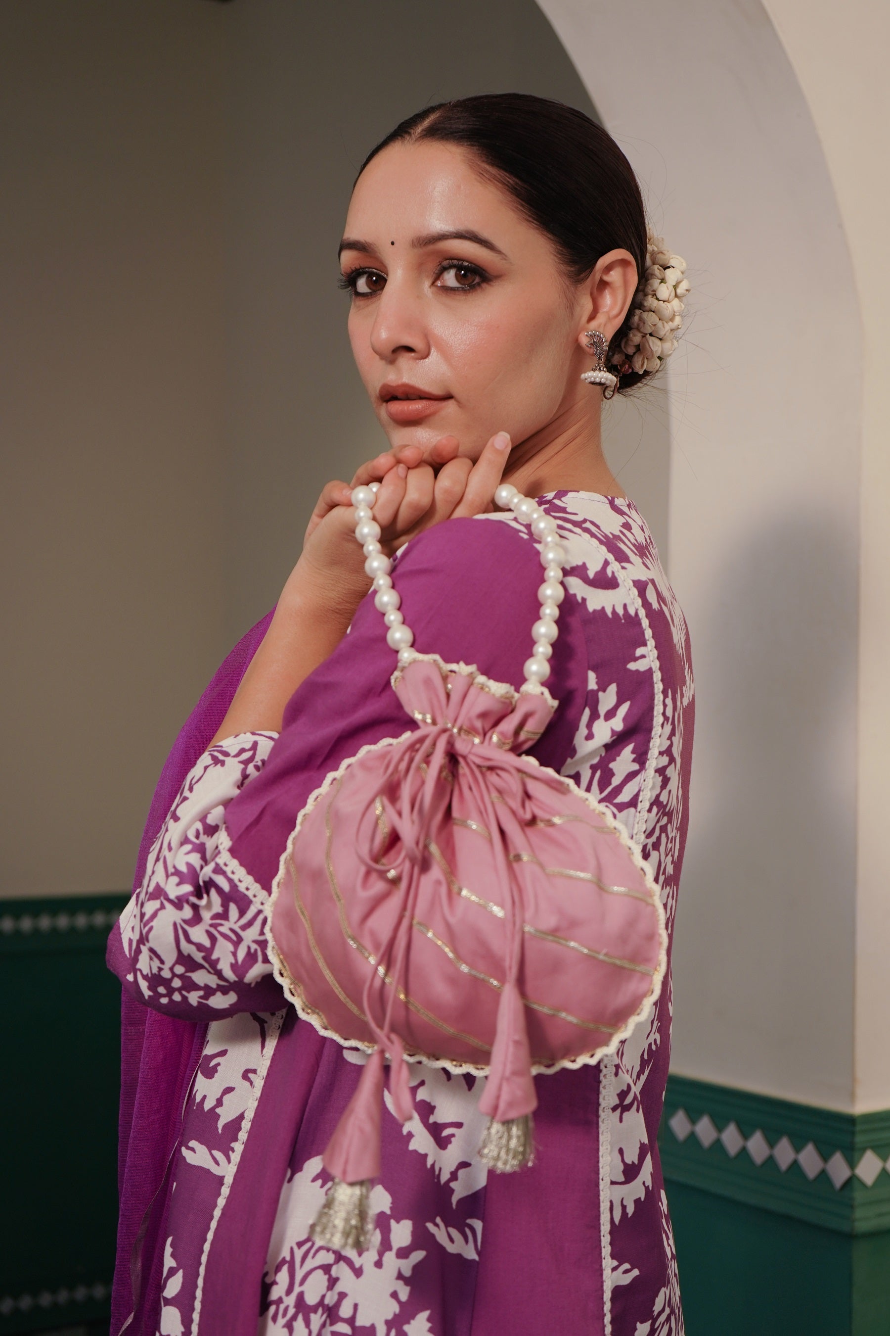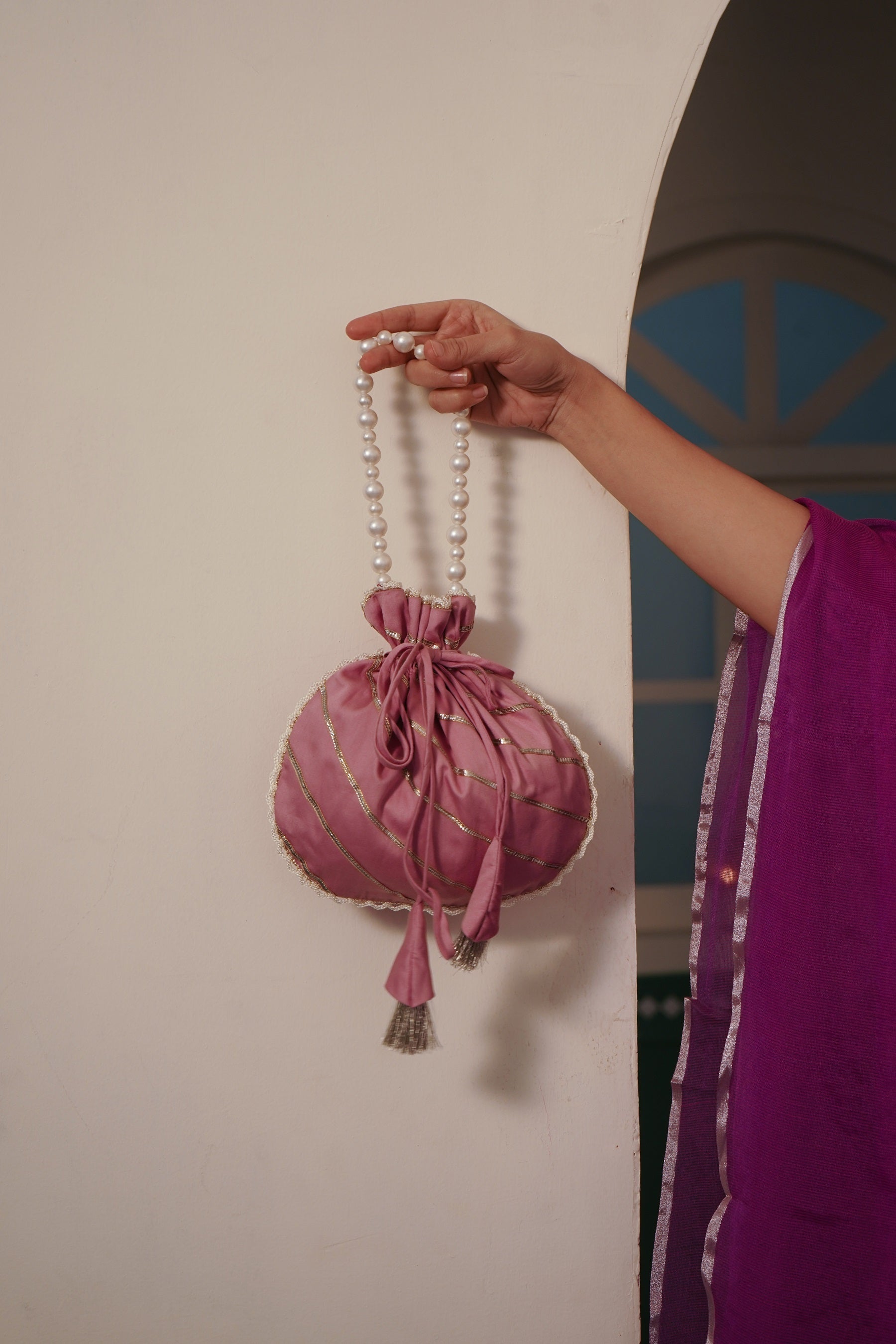 Lilac Pearl Potli Bag with gota work and zari tassels for women