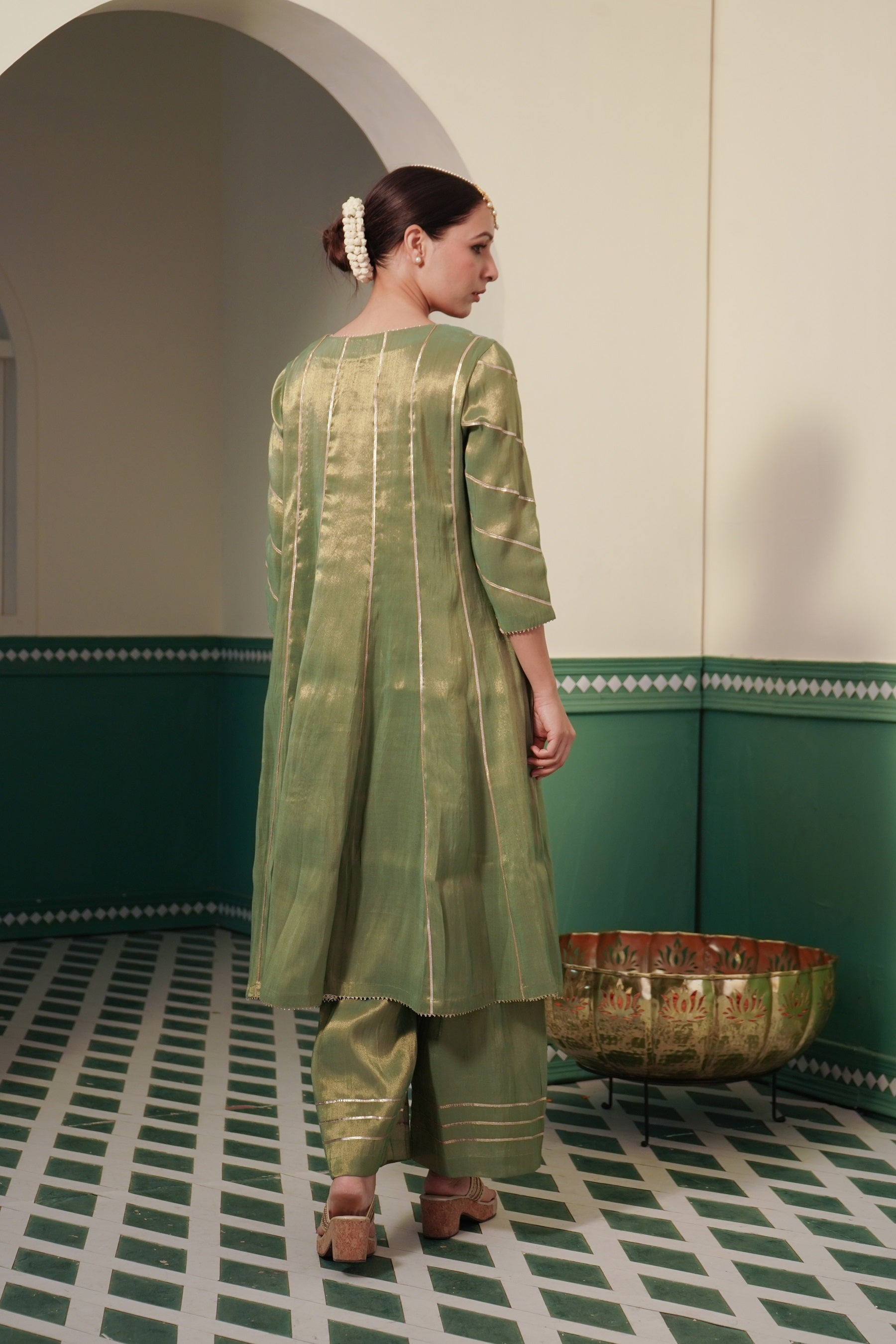 -Anarkali Kurta in Moss Green Tissue Fabric with multiple panels.