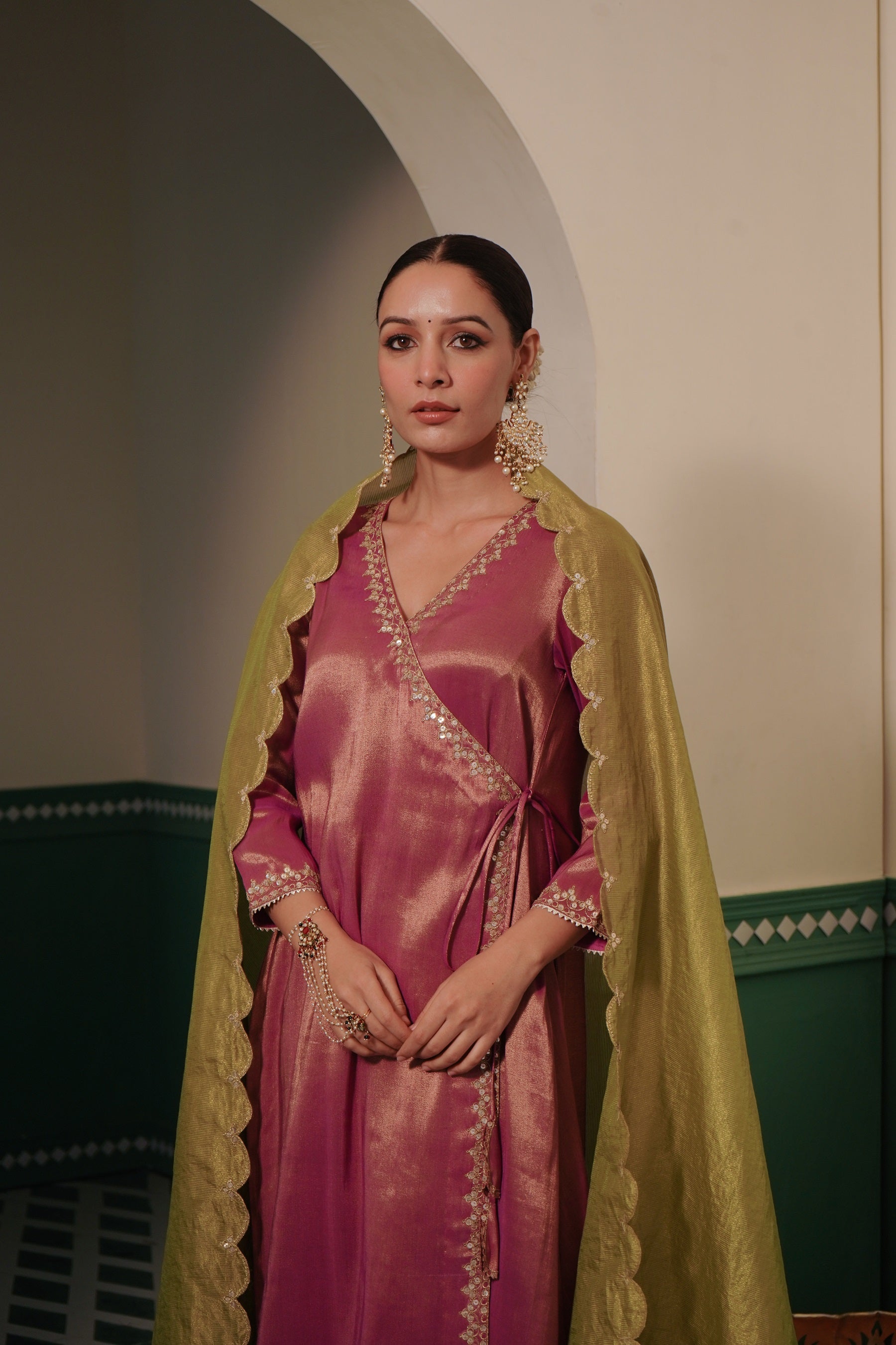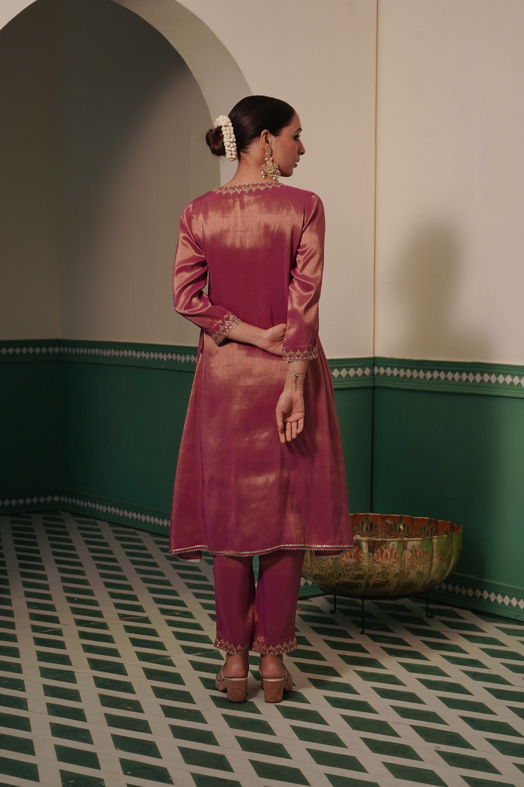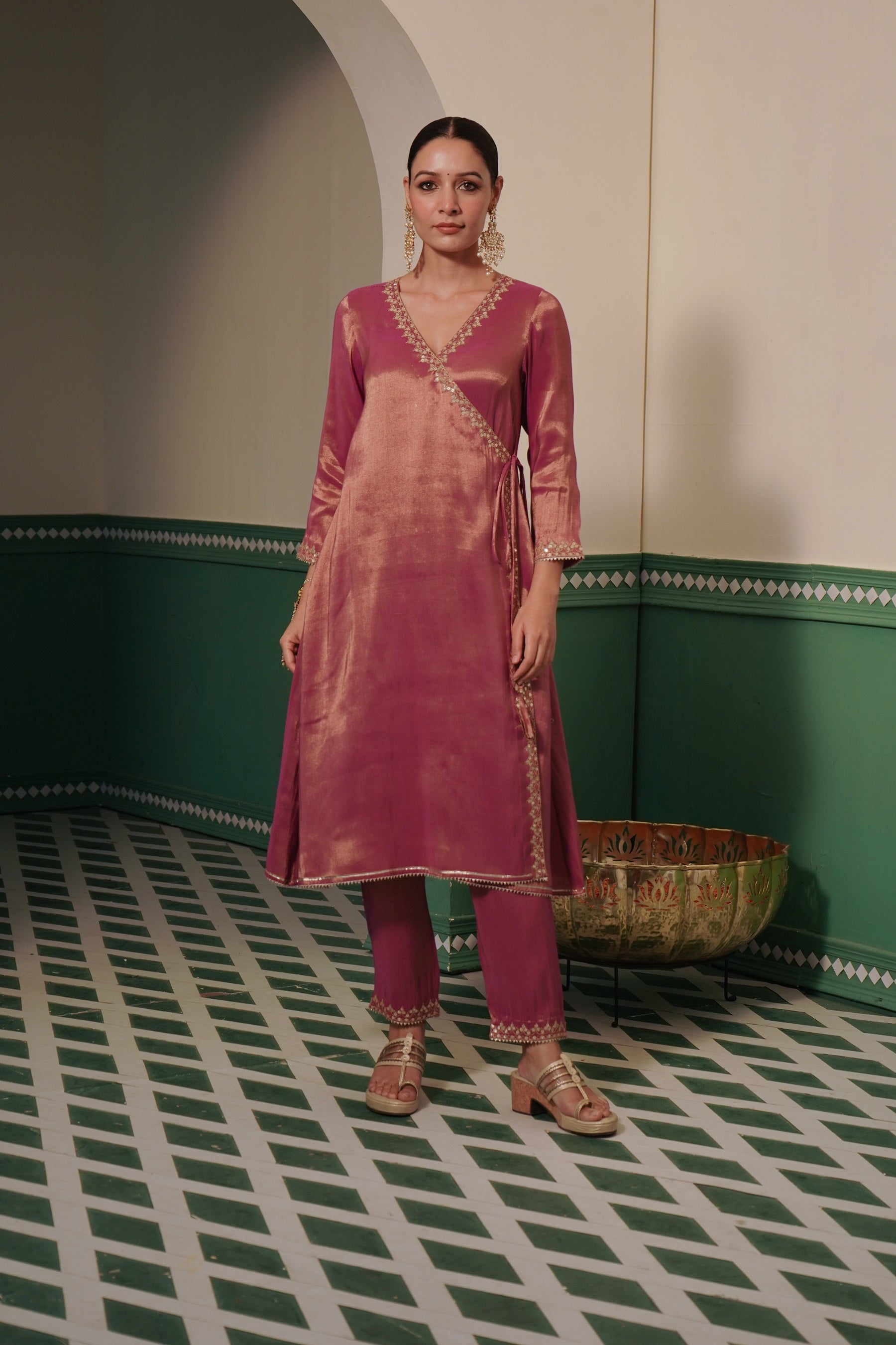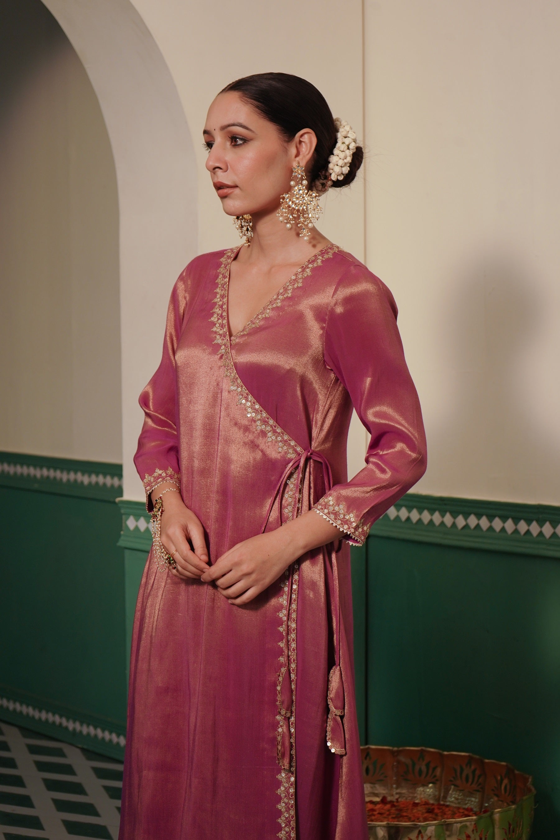 -Angrakha Kurta in Purple Tissue Fabric with side tie up to adjust the waist.