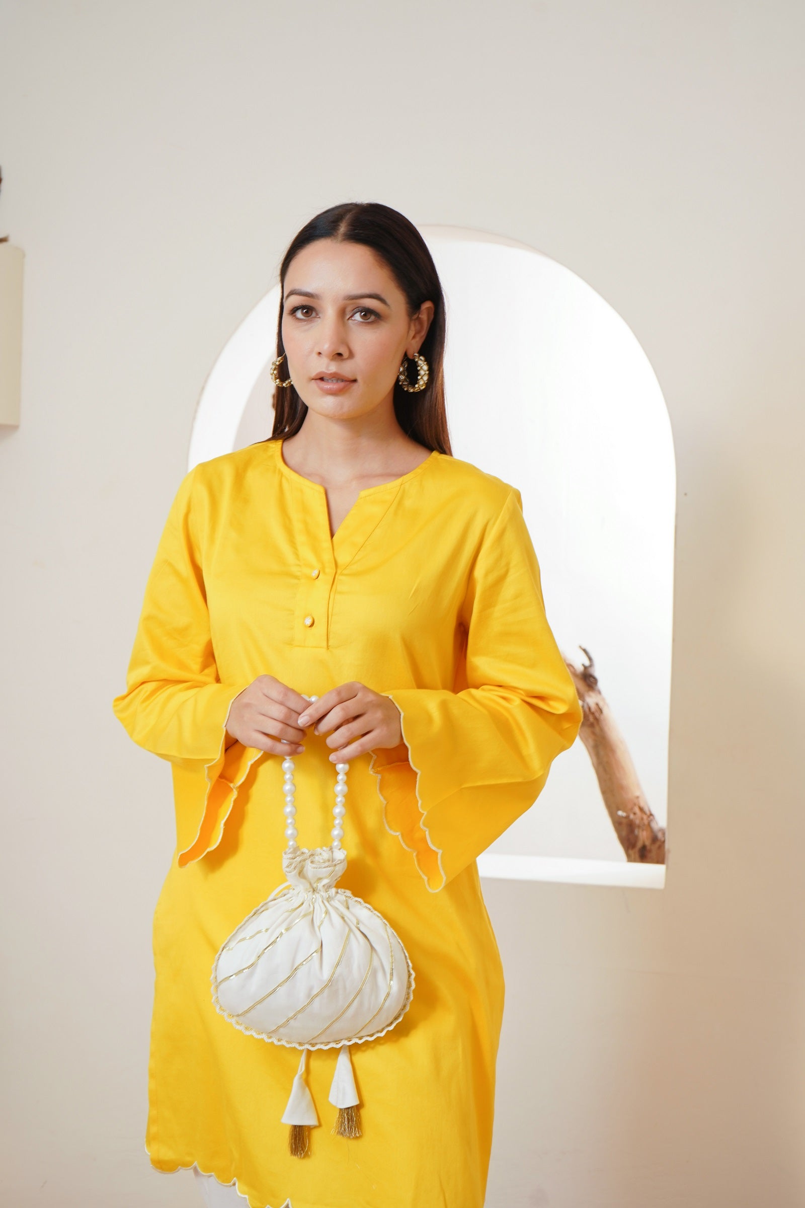 -Kurta in Tulip Yellow Silky Modal Fabric with a long yoke and slits which adds movement.