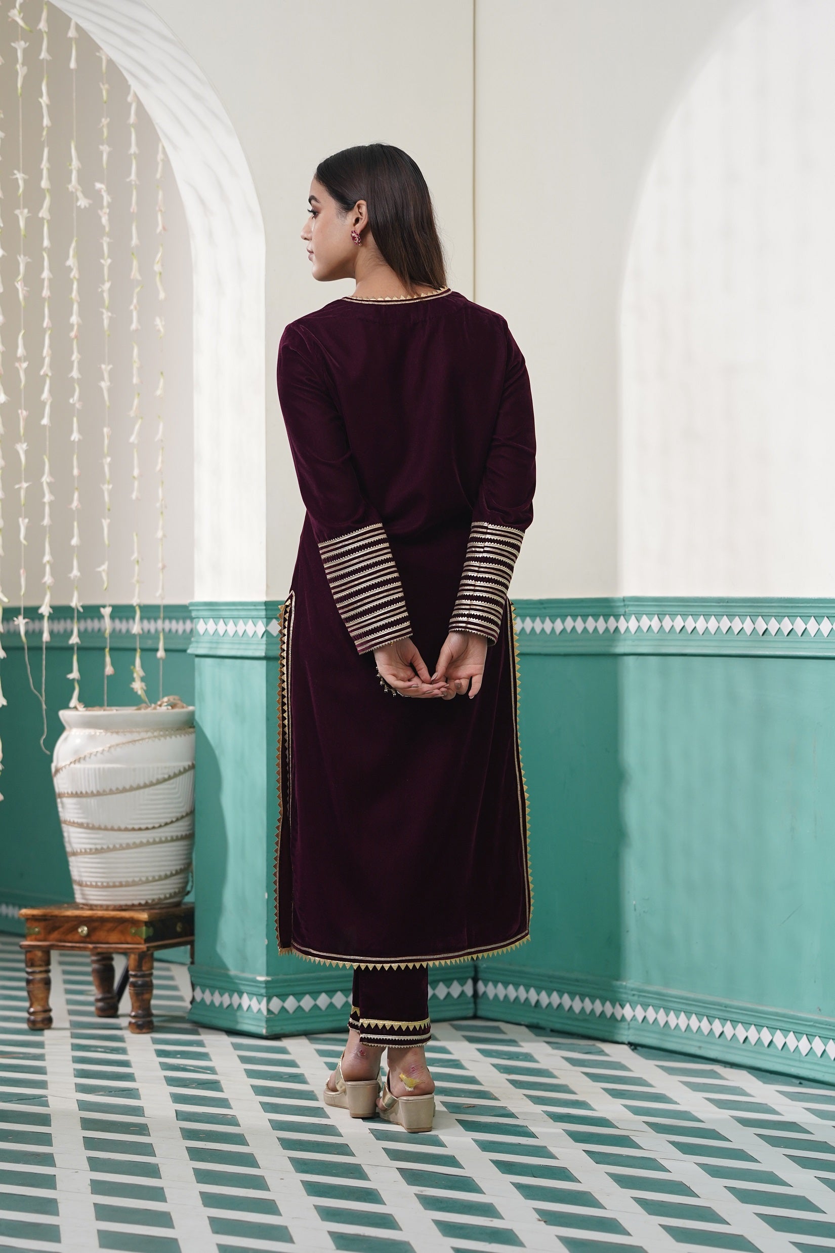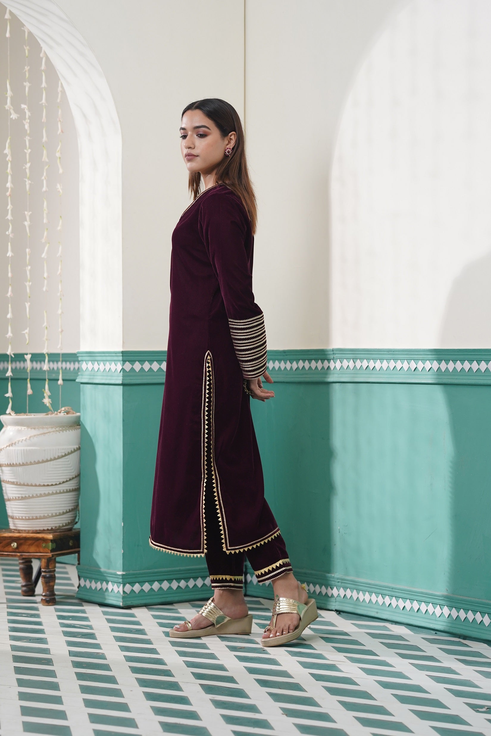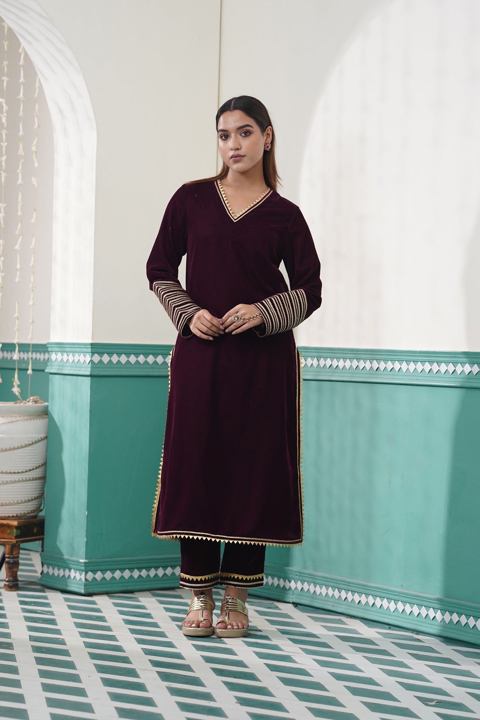 -Kurta in Purple Wine Velvet Fabric with slits adding movement.
