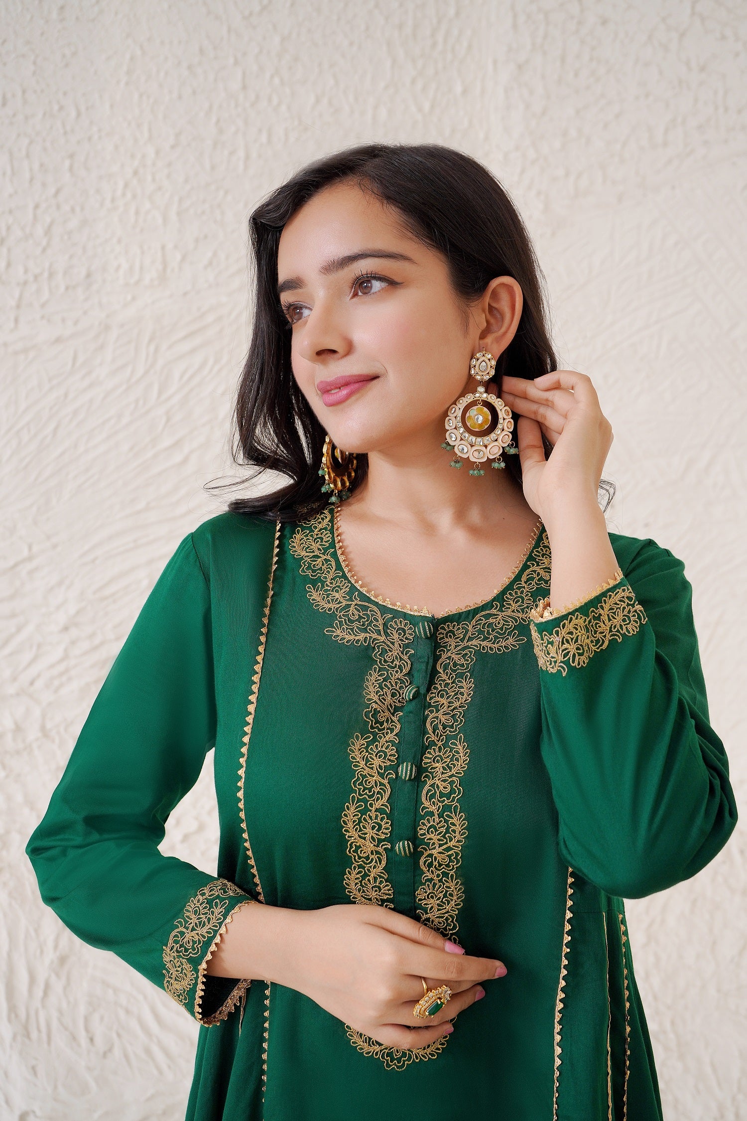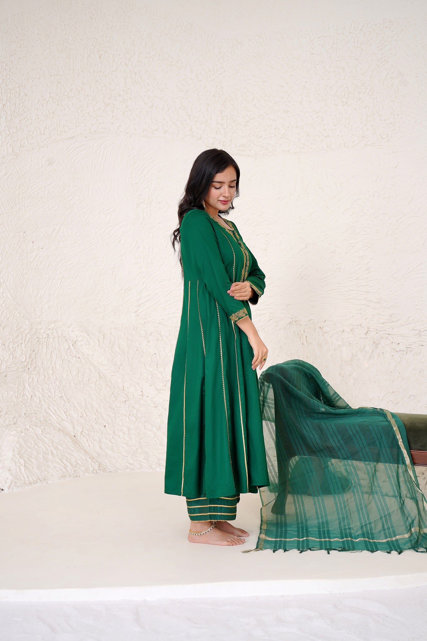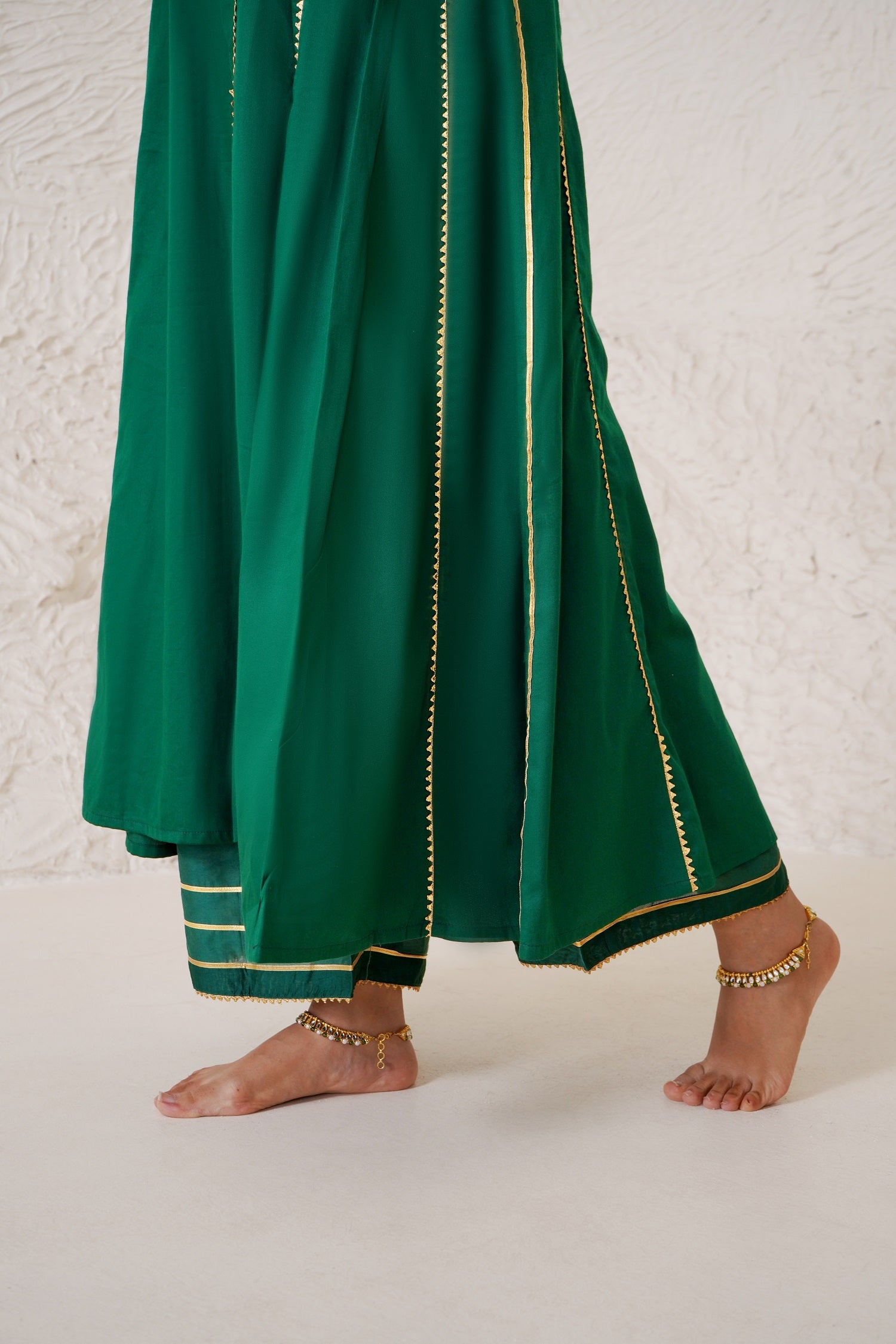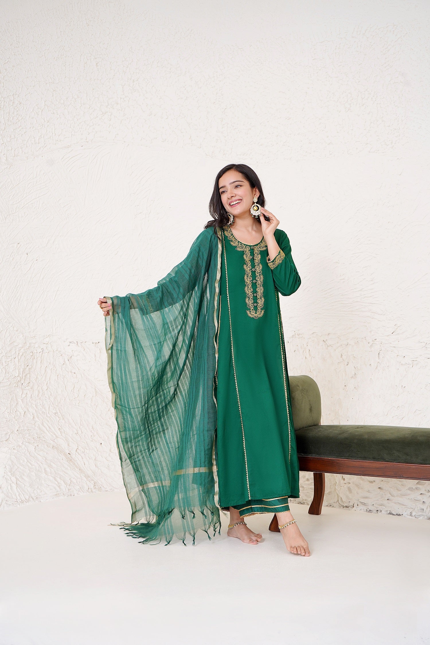 Emerald green cotton satin kurta & chanderi pant with dupatta