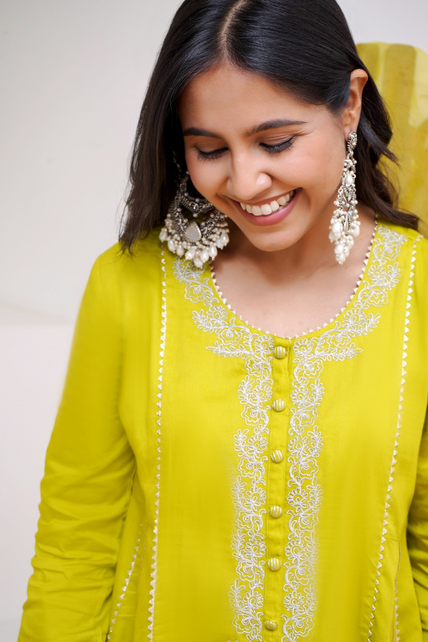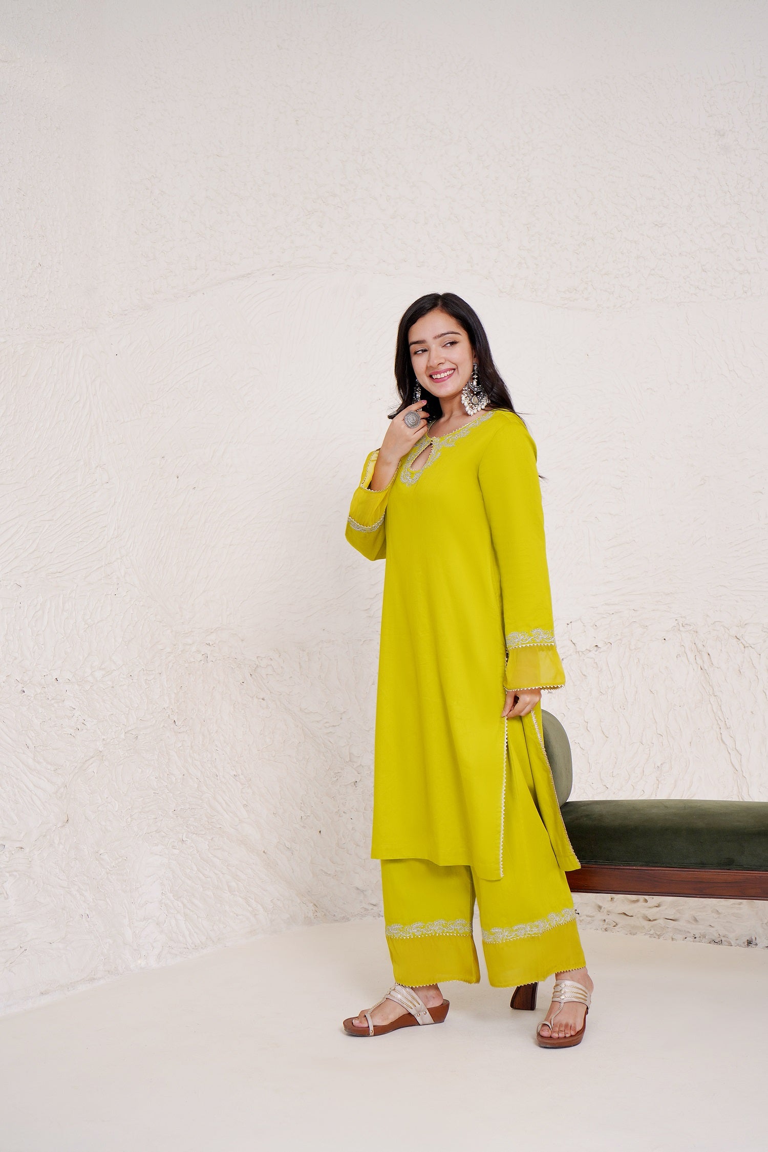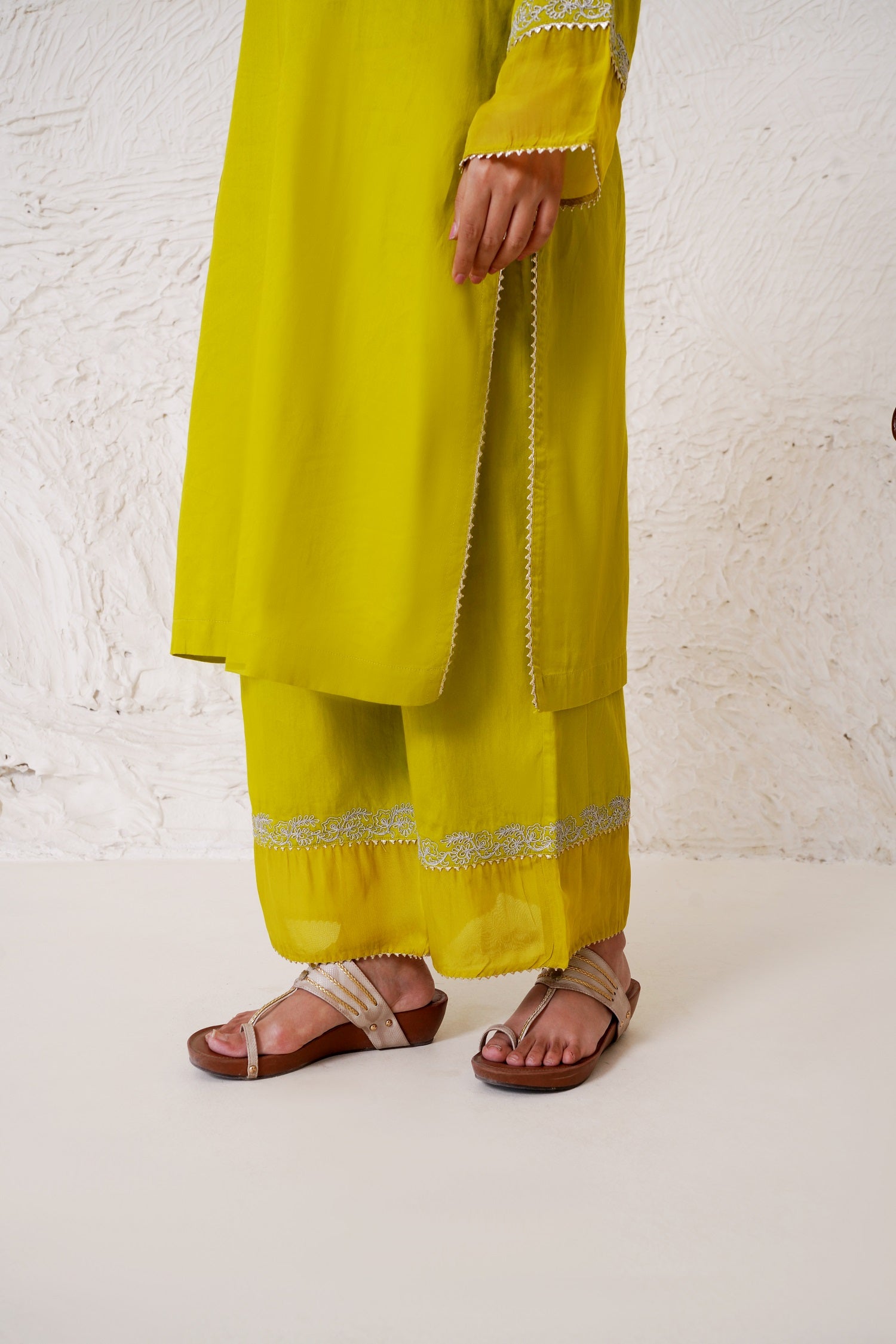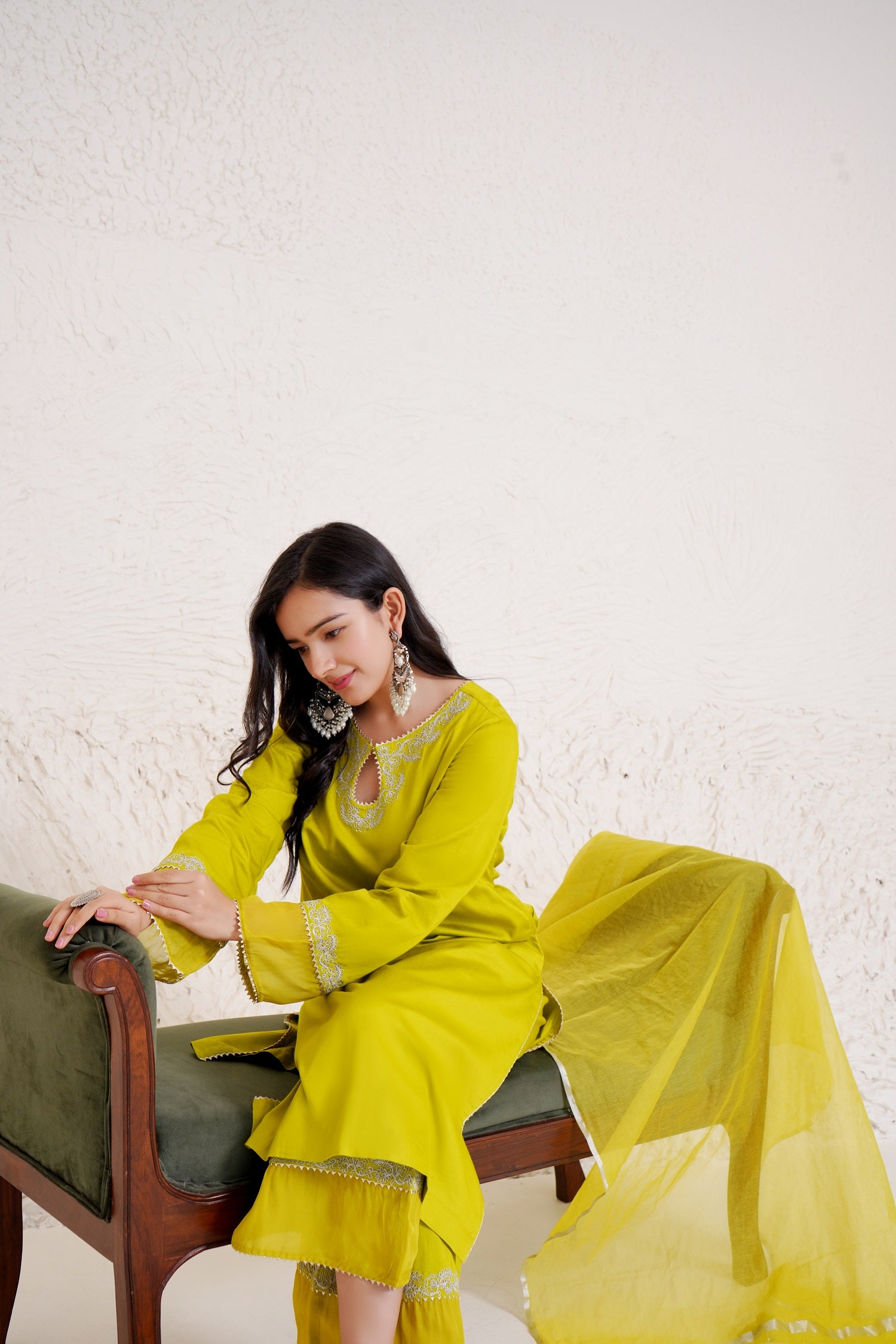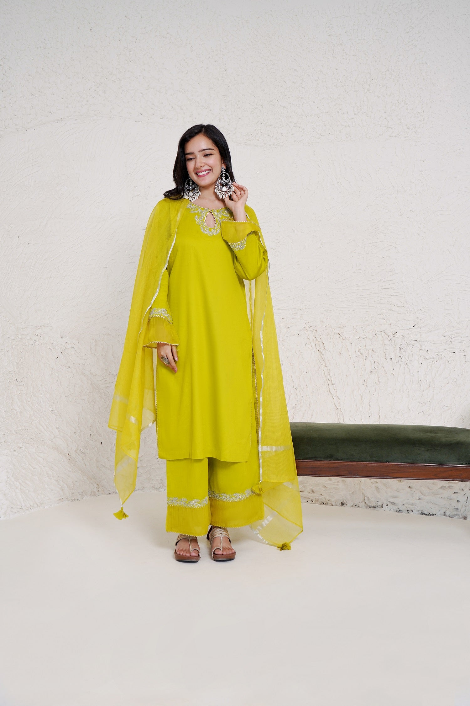 Olive lime cotton satin kurta & chanderi pant with dupatta