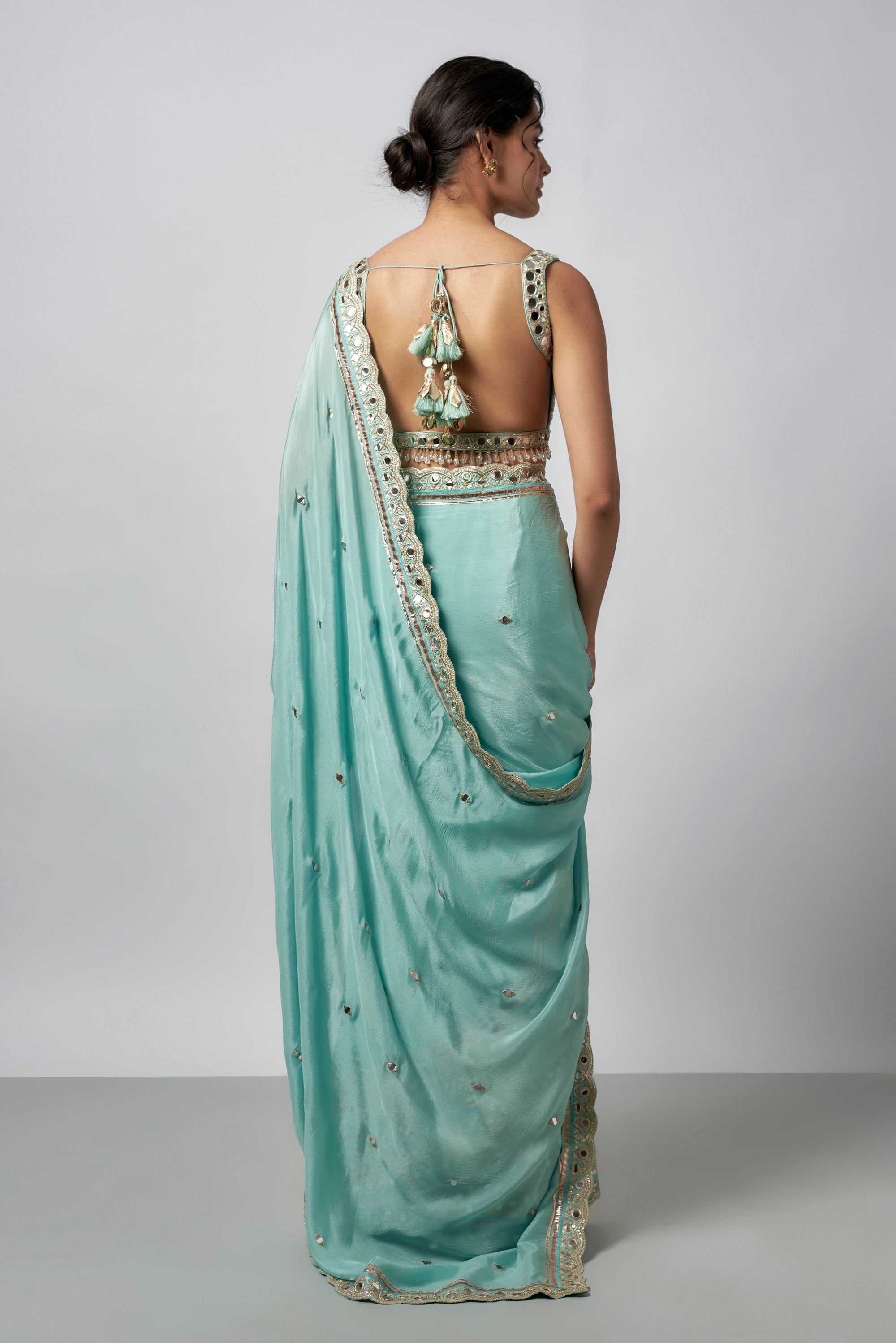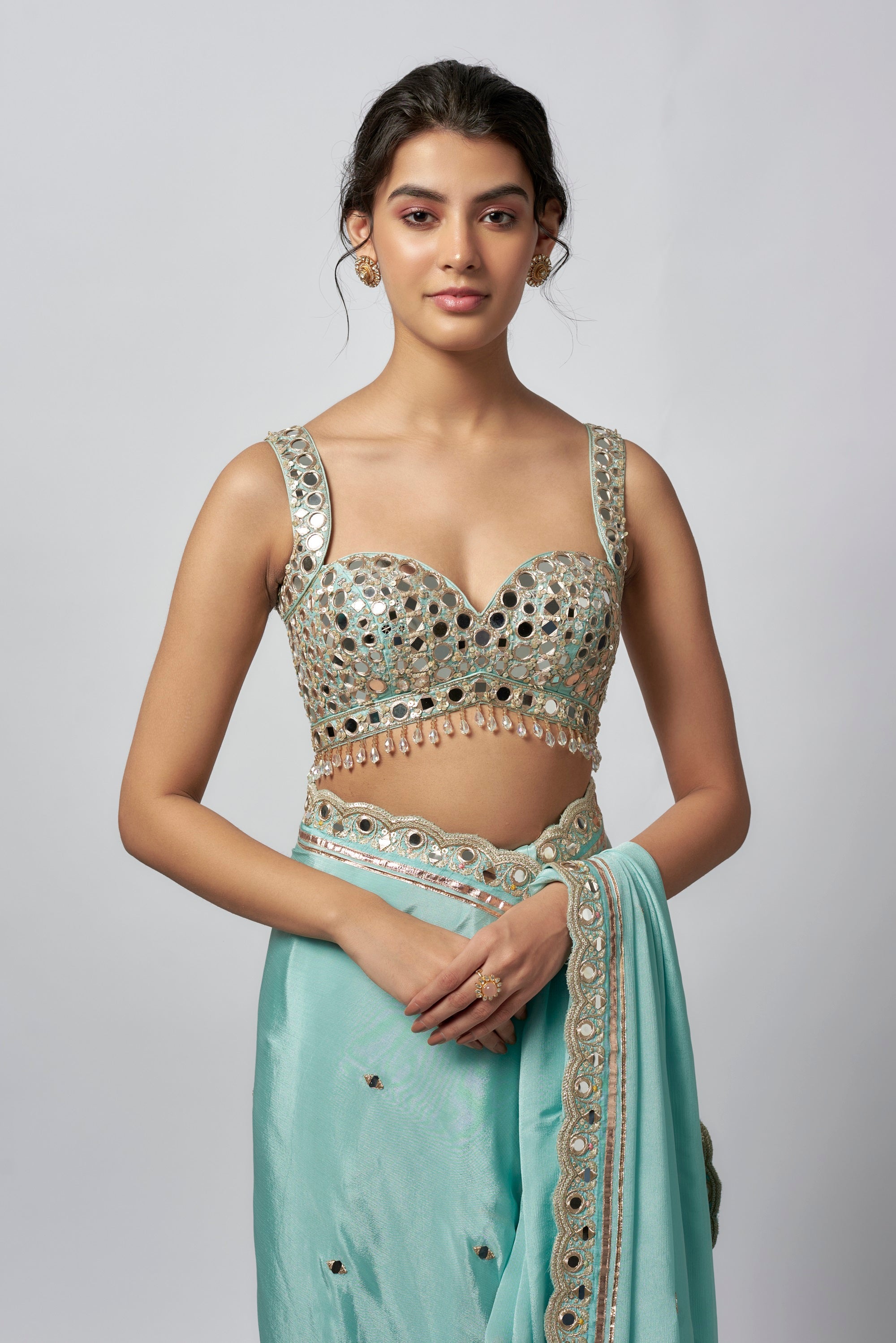 This Pre Pleated Saree Features Intricate Mirror Work And Delicate Embroidery Adorning The Borders. Paired With A Hand Embroidered Blouse With Mirror Work And A Flattering Neckline. The Pleats Of The Saree Are Structured With Layered Detailing, Creating A Contemporary Vibe.