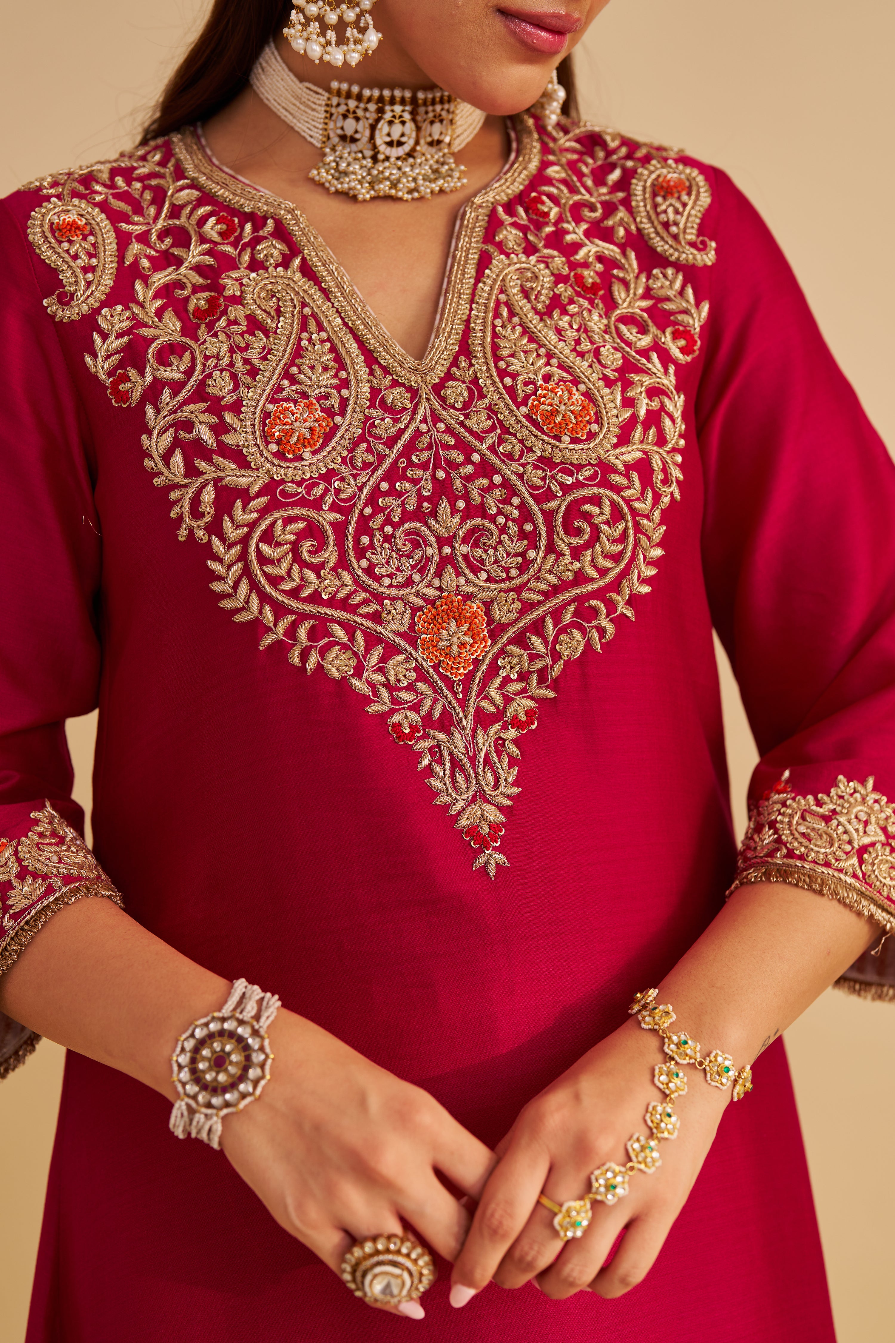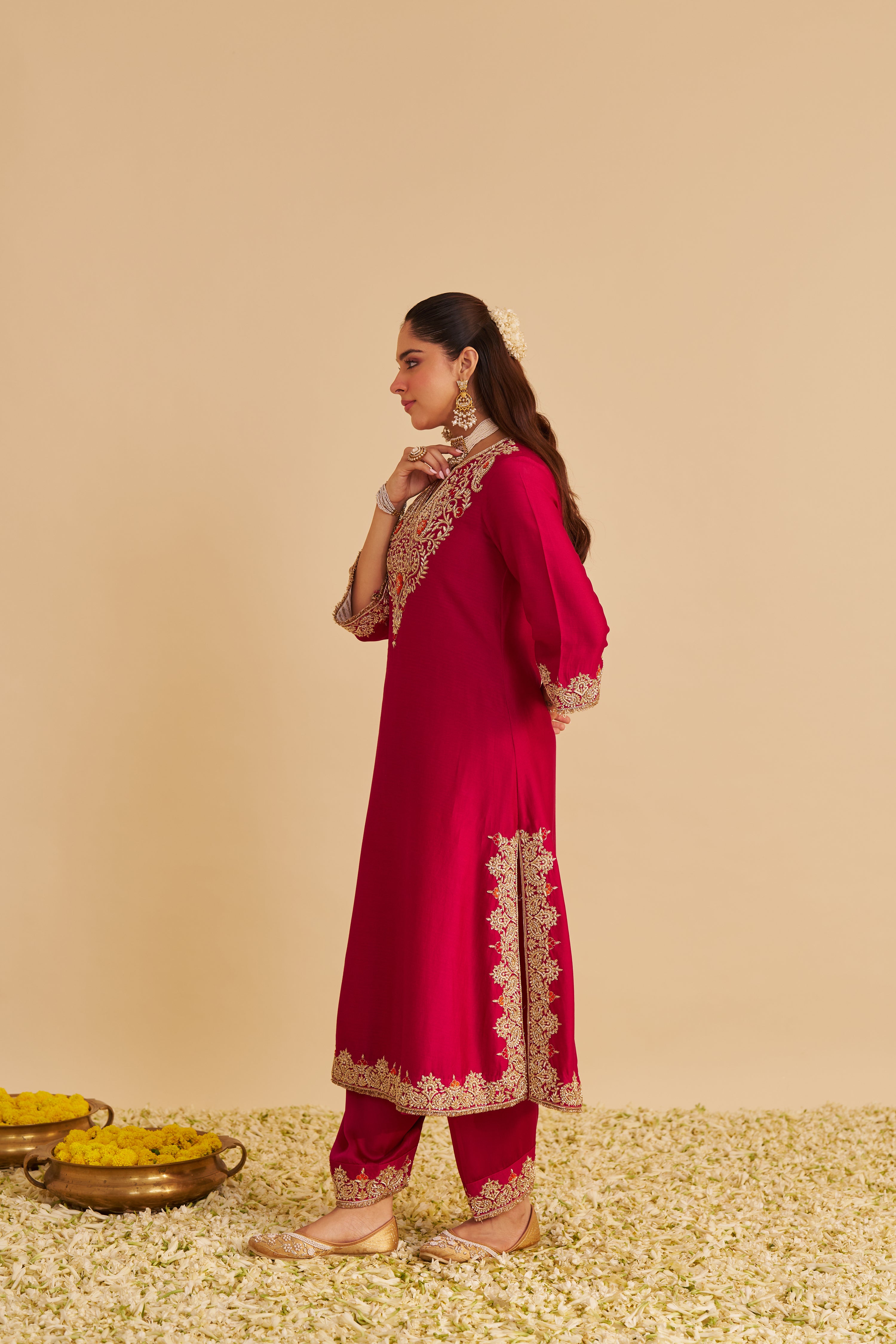 "This long A-line kurta is a perfect blend of traditional craftsmanship and contemporary style. Crafted with a sleek zero neckline featuring a subtle slit and three-quarter sleeves, the kurta is beautifully adorned with intricate dabka zardozi embroidery, adding a touch of opulence and texture. Paired with a classic Dogri salwar, this ensemble offers both comfort and elegance, making it ideal for festive occasions or casual celebrations."