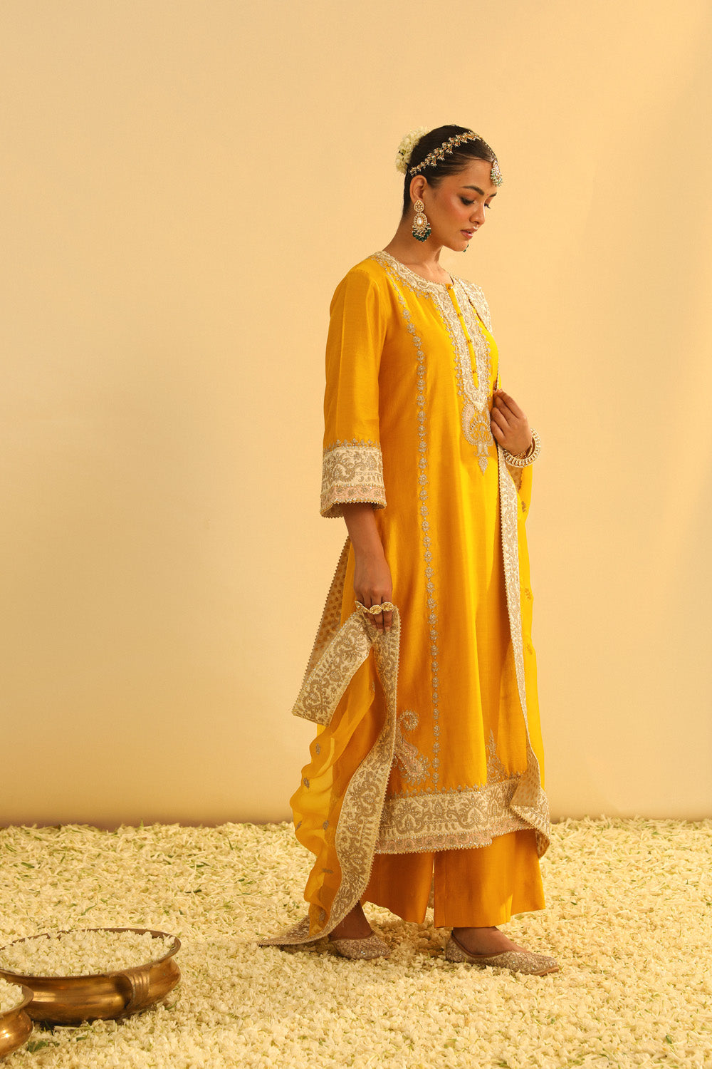 The Asmira ensemble, crafted from luxurious Silk Chanderi, features our signature heritage Kashmiri Tilla embroidery. It is meticulously adorned with Appliqué, Gota and Kundan work. It features a zero neck with placket, three quarter sleeves and is paired with a Straight palazzo and dupatta. It makes use of Chanderi Silk Banarsi fabric for the final touch.