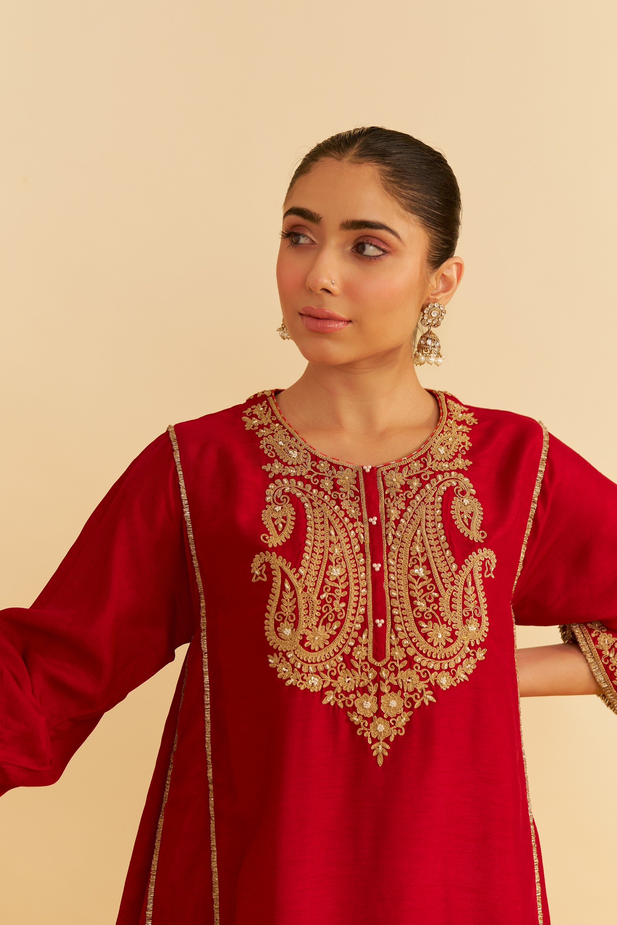 This Elegant Ayra Ensemble Is Crafted From Pure Upada Silk Fabric, Offering A Luxurious Drape And Rich Texture. The Outfit Is Beautifully Adorned With Intricate Kirandori Embroidery And Delicate Basra Moti Embellishments, Lending A Timeless Charm To The Piece. Designed With A Zero Neckline Featuring A Subtle Placket, The Kurta Showcases Three-Quarter Bell Sleeves For A Graceful Silhouette. The Kali Panels Are Finished With Traditional Kiran Detailing, Enhancing The Overall Aesthetic. Paired With A Classic Dogri Salwar, The Ensemble Is Completed With A Contrasting Banarasi Fabric Finish, Adding A Regal Touch To This Exquisite Outfit — Perfect For Festive Occasions Or Elegant Celebrations.