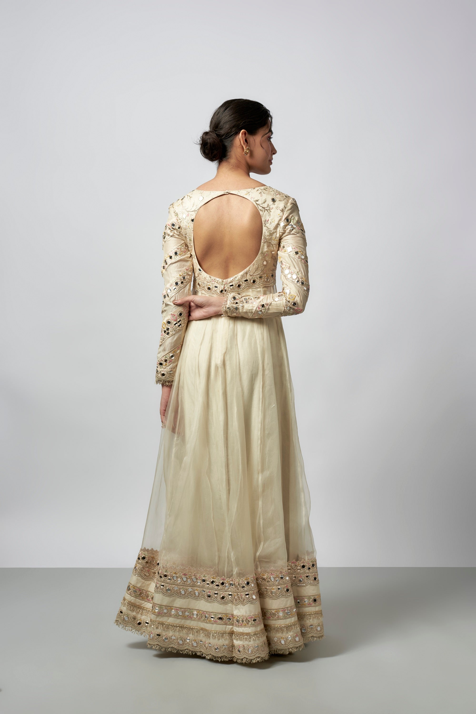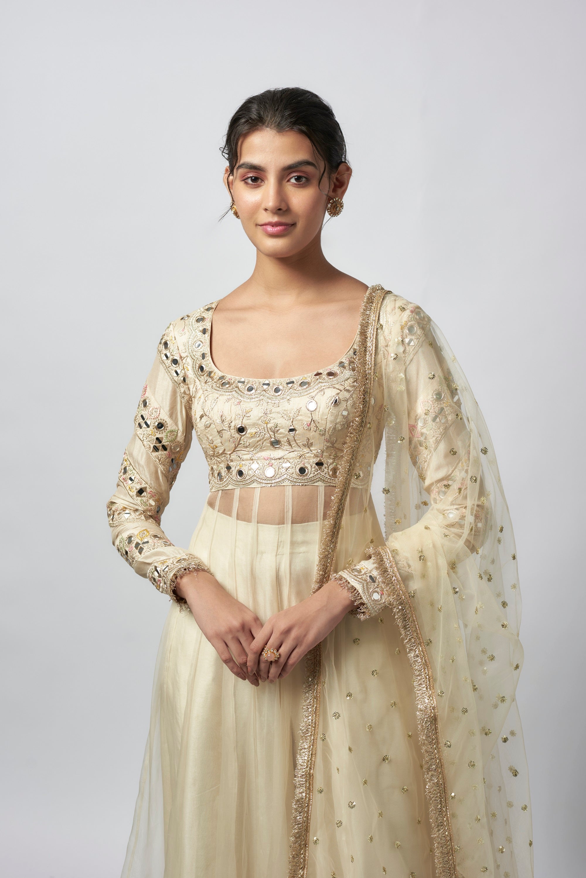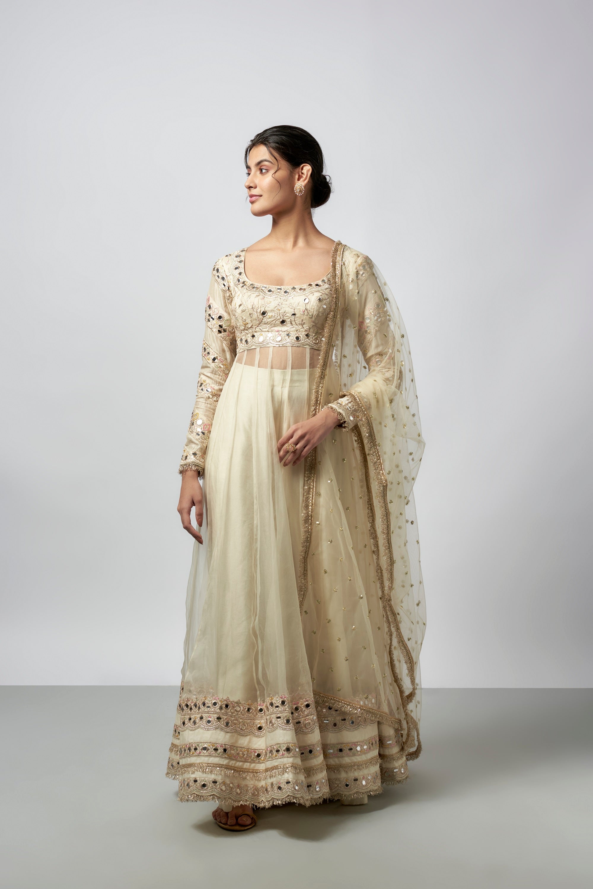 This Elegant Anarkali Features Intricate Embroidery With Mirror Detailing And Delicate Patterns. The Long Sleeves Mirror The Embroidery On The Bodice. A Matching Net Dupatta With Subtle Sequins  Drapes Gracefully Over The Shoulder.