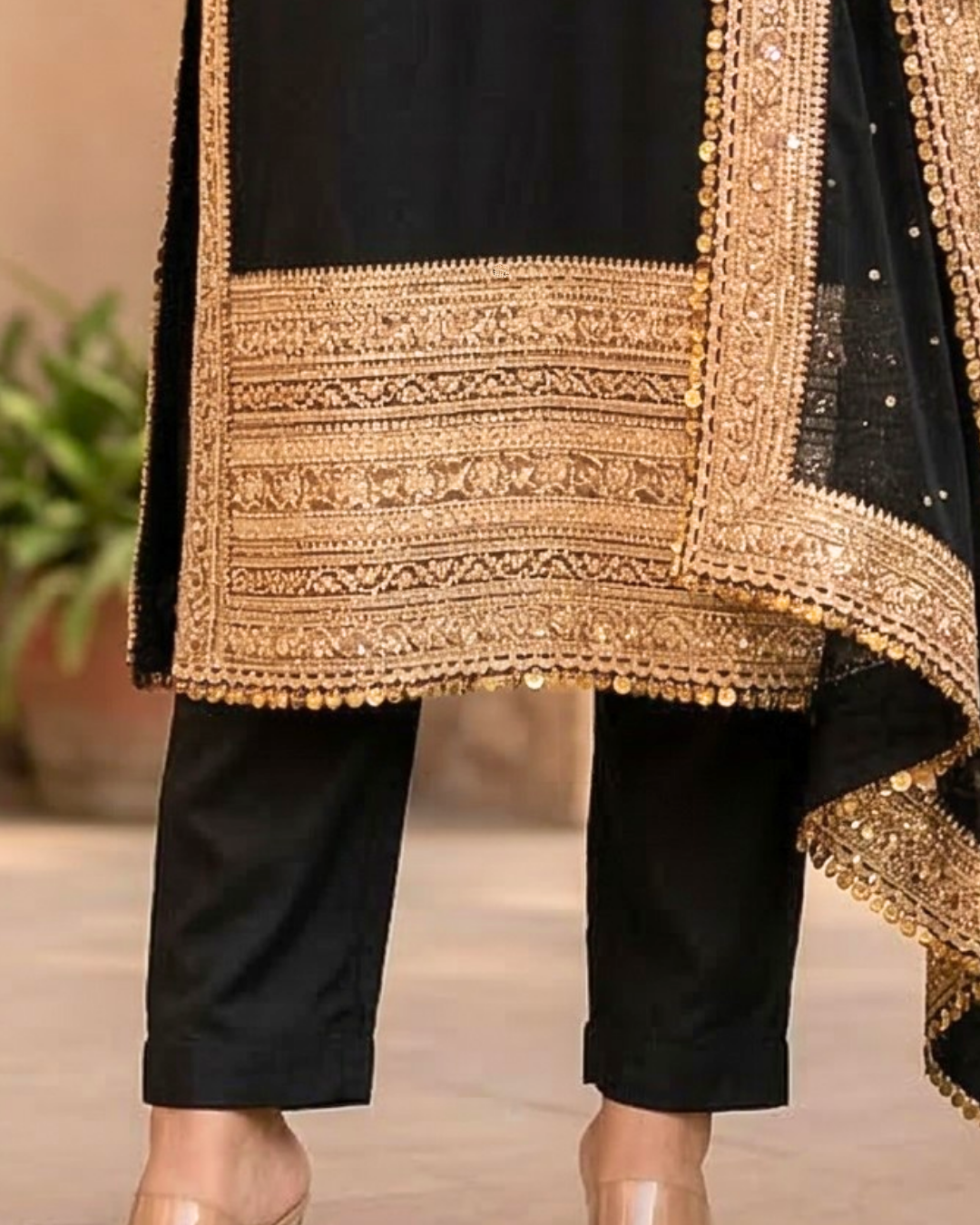A timeless black kurta set crafted in luxurious silk and adorned with intricate gold embroidery. The straight-cut kurta features elegant detailing along the neckline, sleeves, and hem, paired with tailored pants for a refined silhouette. Completed with a sheer net dupatta finished with rich embroidered borders, this ensemble is perfect for festive gatherings, evening events, and wedding celebrations. ✨