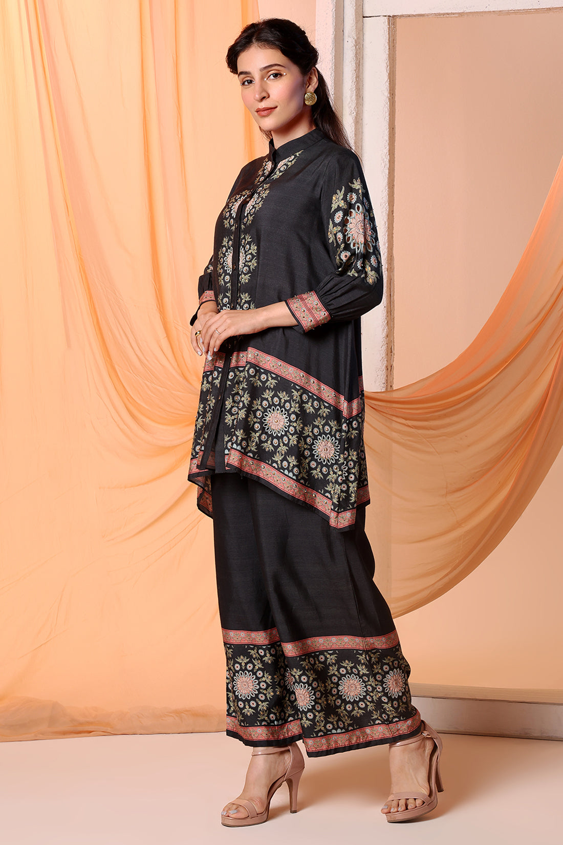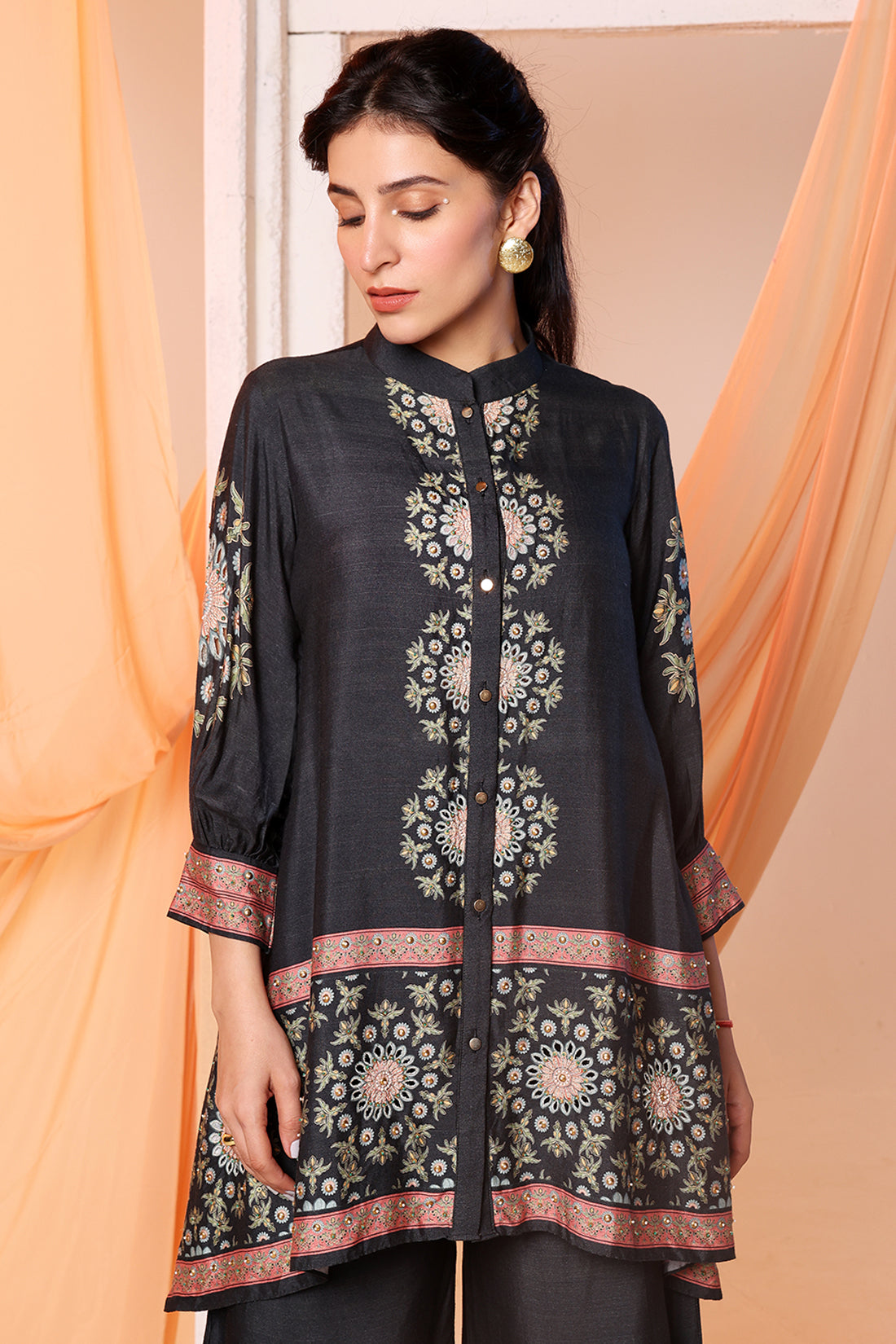 Black Eraya embellished shirt with gathered detailed sleeves, paired with pants in chanderi.