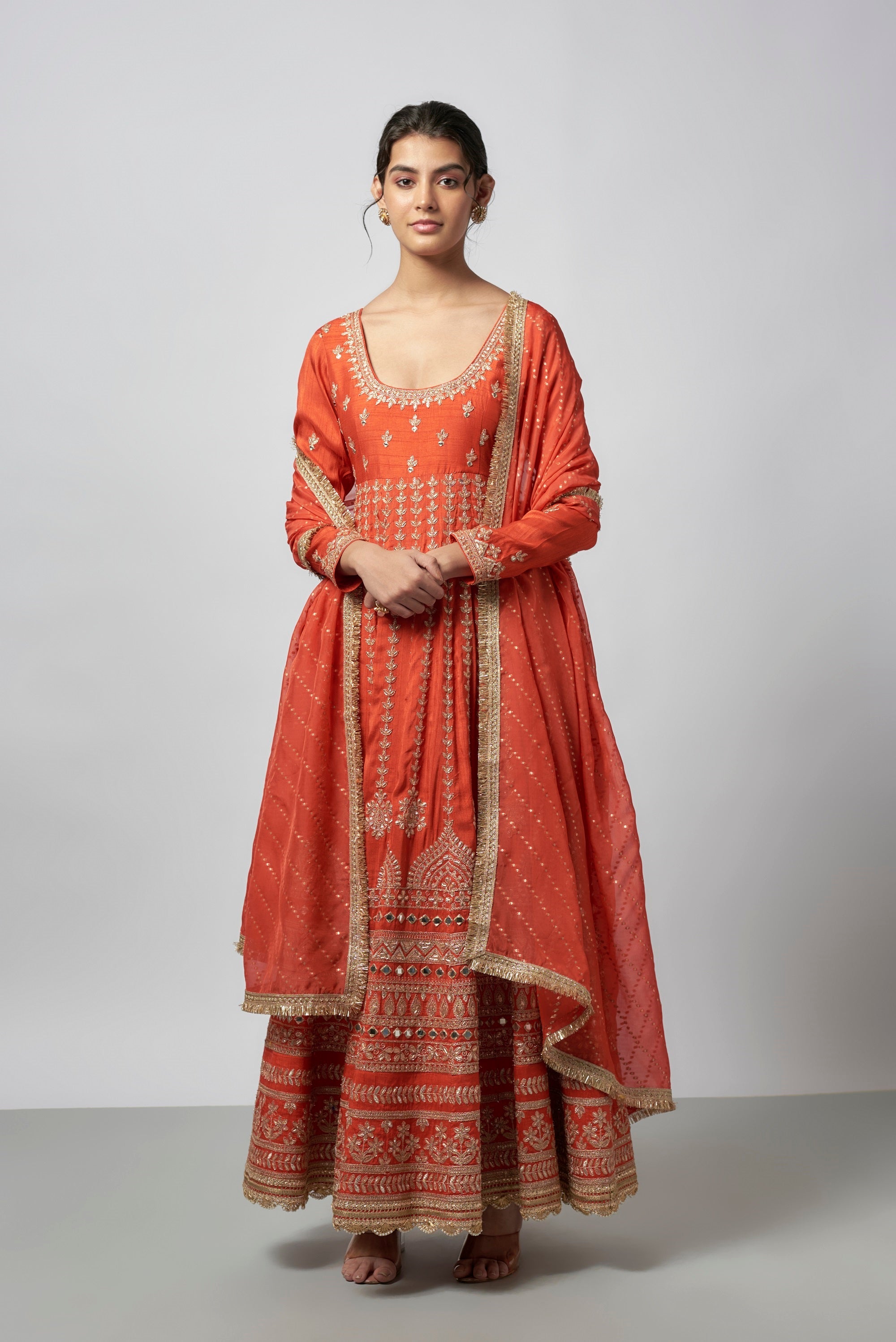 Featuring An Anarkali Set In Adorned With Intricate Embroidery And Mirror Work Paired With Churidar. Completing With An Organza Dupatta With A Gold Border, Delicately Embellished To Complement The Outfit.