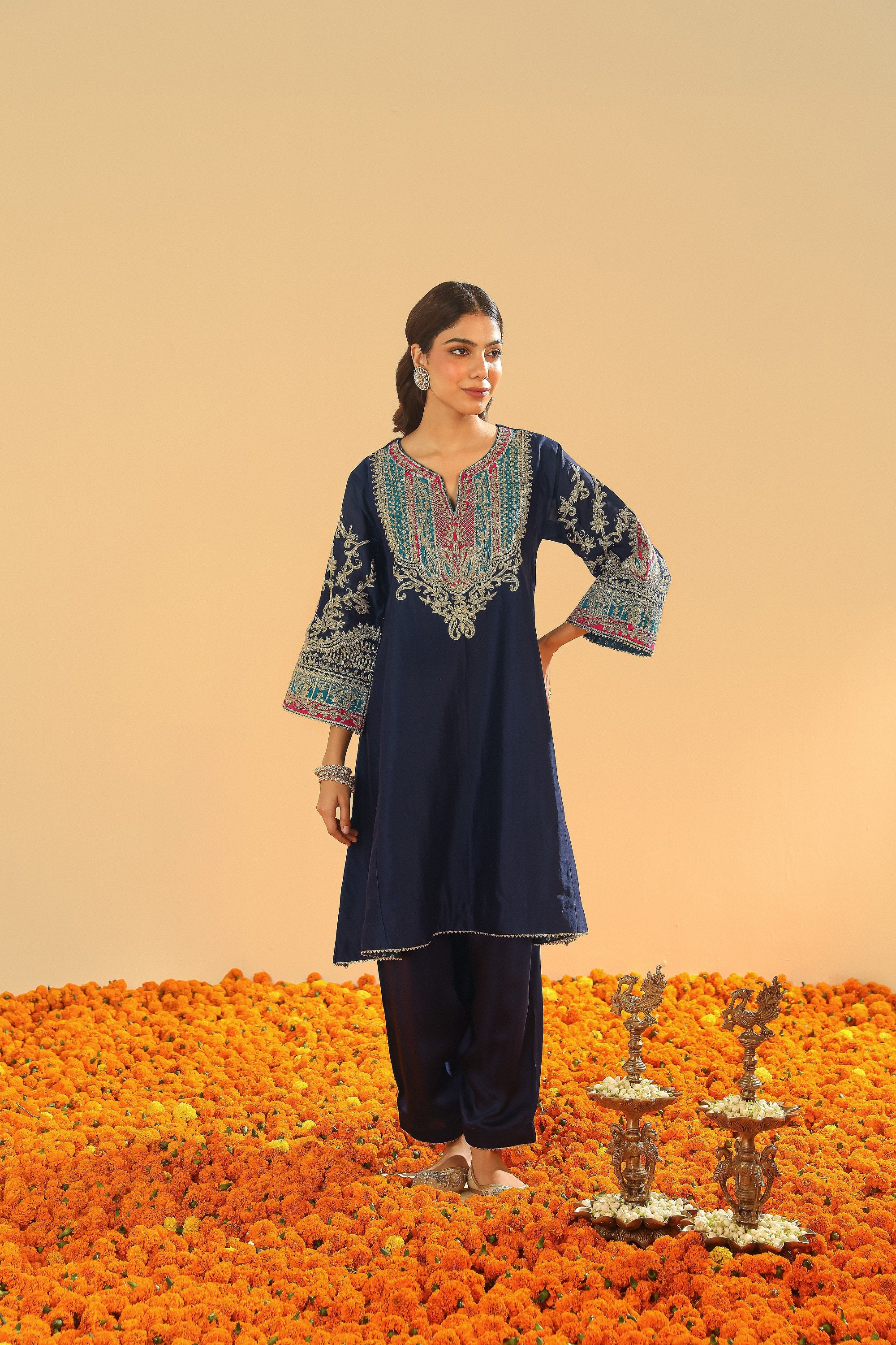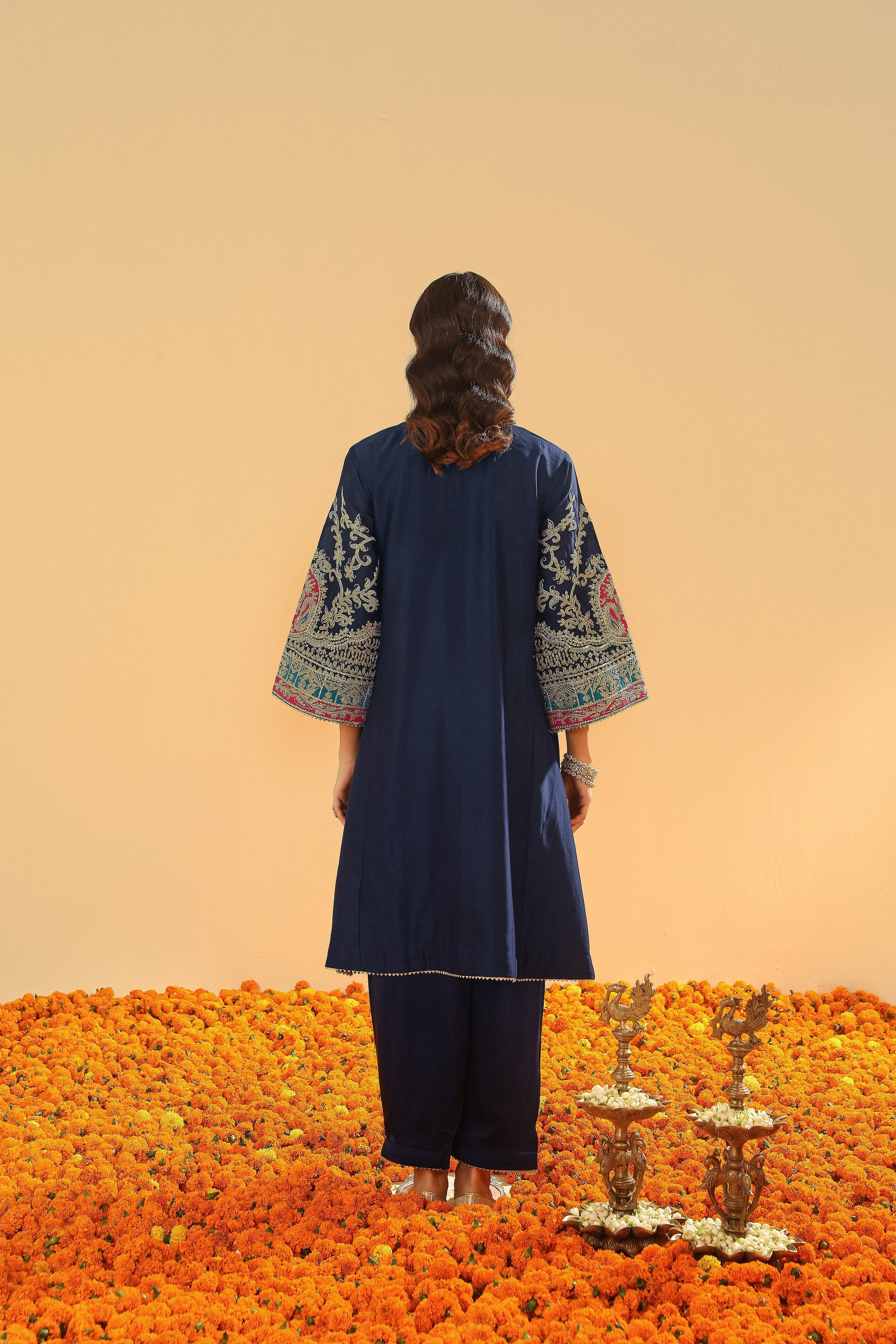 This Ensemble Is Made In Pure Silk Chanderi Fabric And Adorned With Heritage Kashmiri Tilla Embroidery. It Features A Zero Neck With Slit And Three-Quarter Bell Sleeves. The Whole Ensemble Is Highlighted With Appliqué, Gota And Is Finished Using A Chanderi Silk Banarsi Fabric.