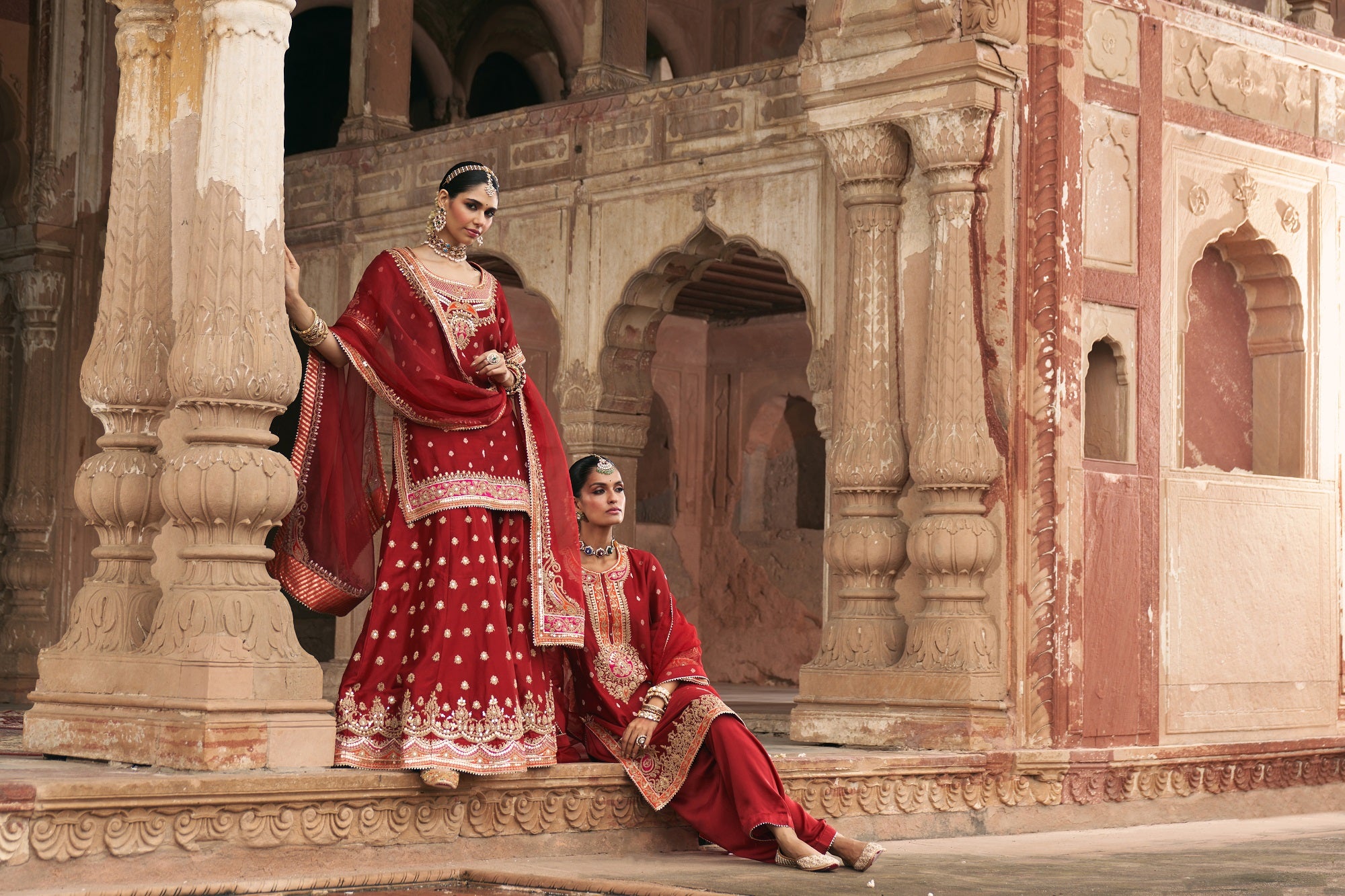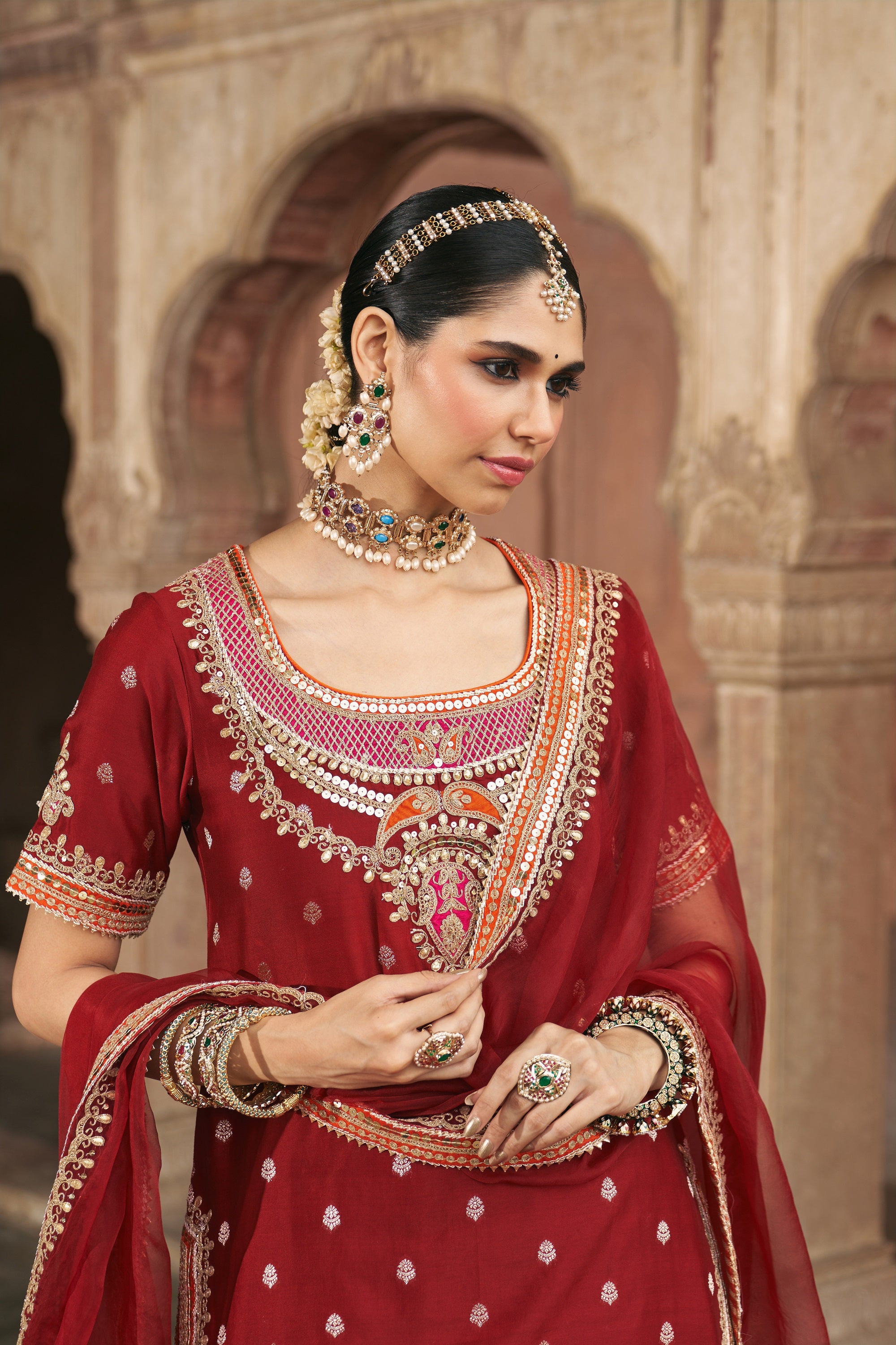 This Graceful Ensemble Features A Pure Banarasi Short Kurta With A Broad Deep Scoop Neckline, Zero Back, And Elbow Sleeves. Paired With A Sharara Adorned With A Broad Border And Embroidered Bootis, And A Silk Organza Dupatta, The Set Is Embellished With Kashmiri Tilla And Gota Patti Embroidery, Highlighted With Pearls And Sequins. Finished With Delicate Gota Detailing, This Outfit Exudes Timeless Elegance.