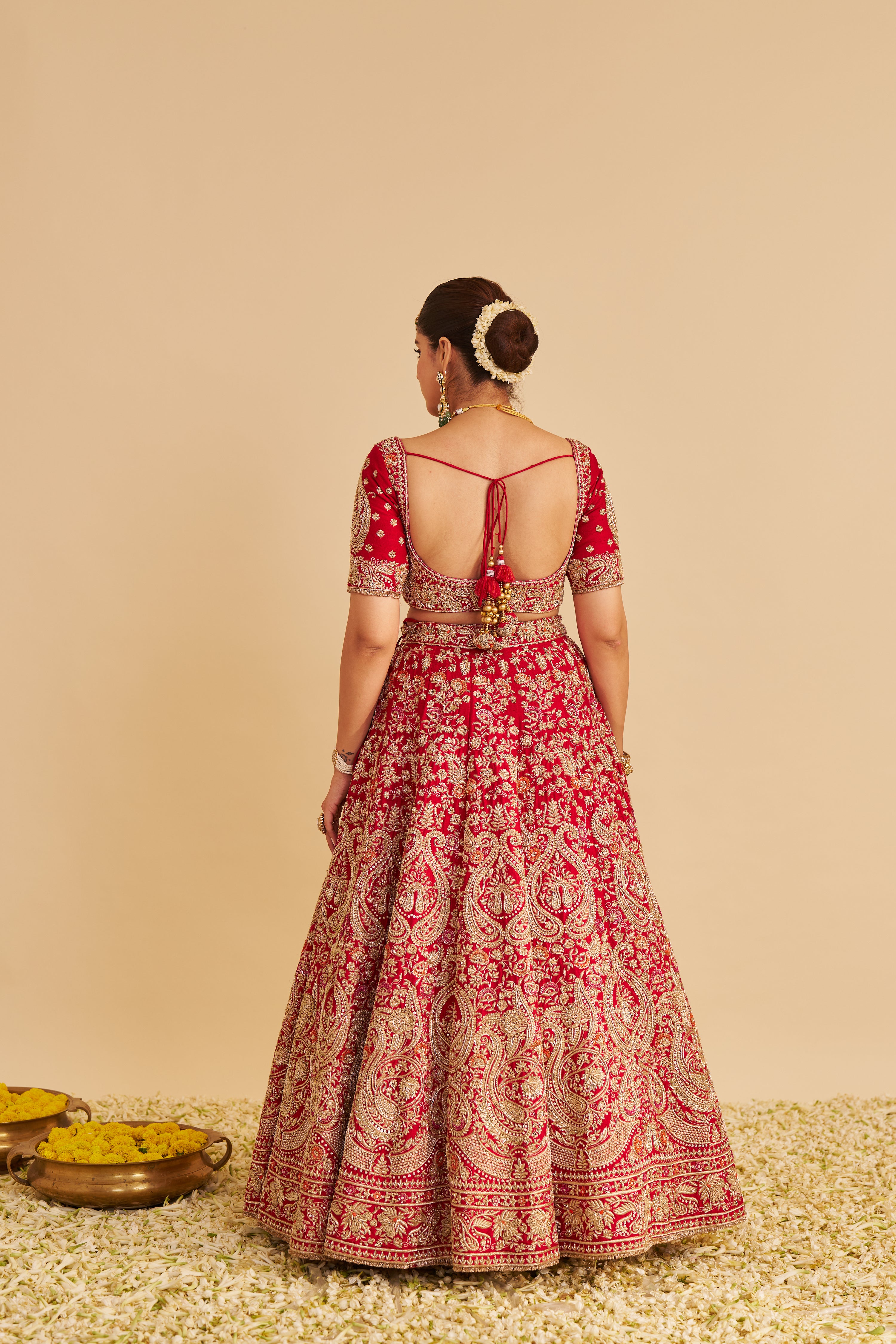 Sanaa - dabka zardozi embroidered raw silk red bridal lehenga set