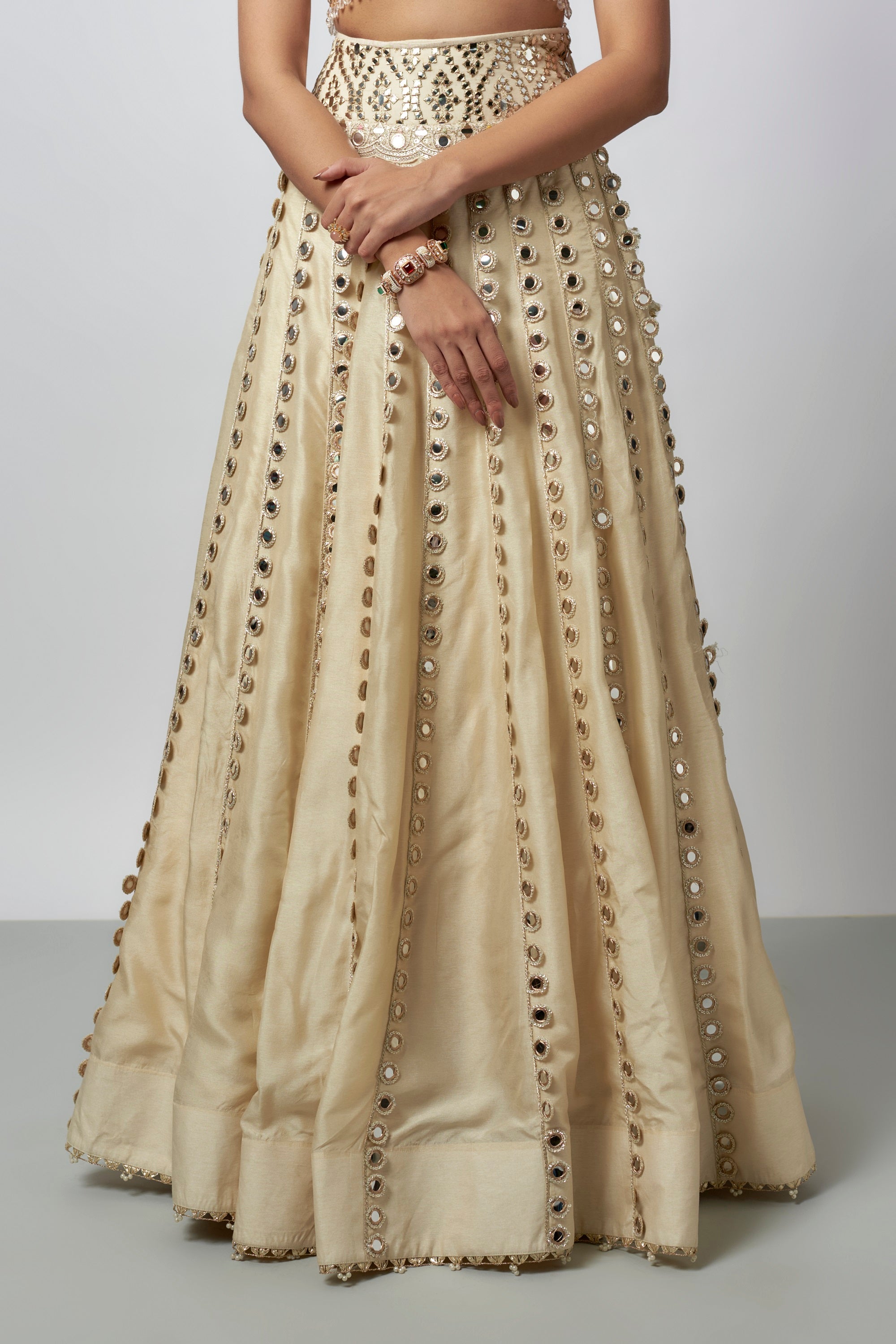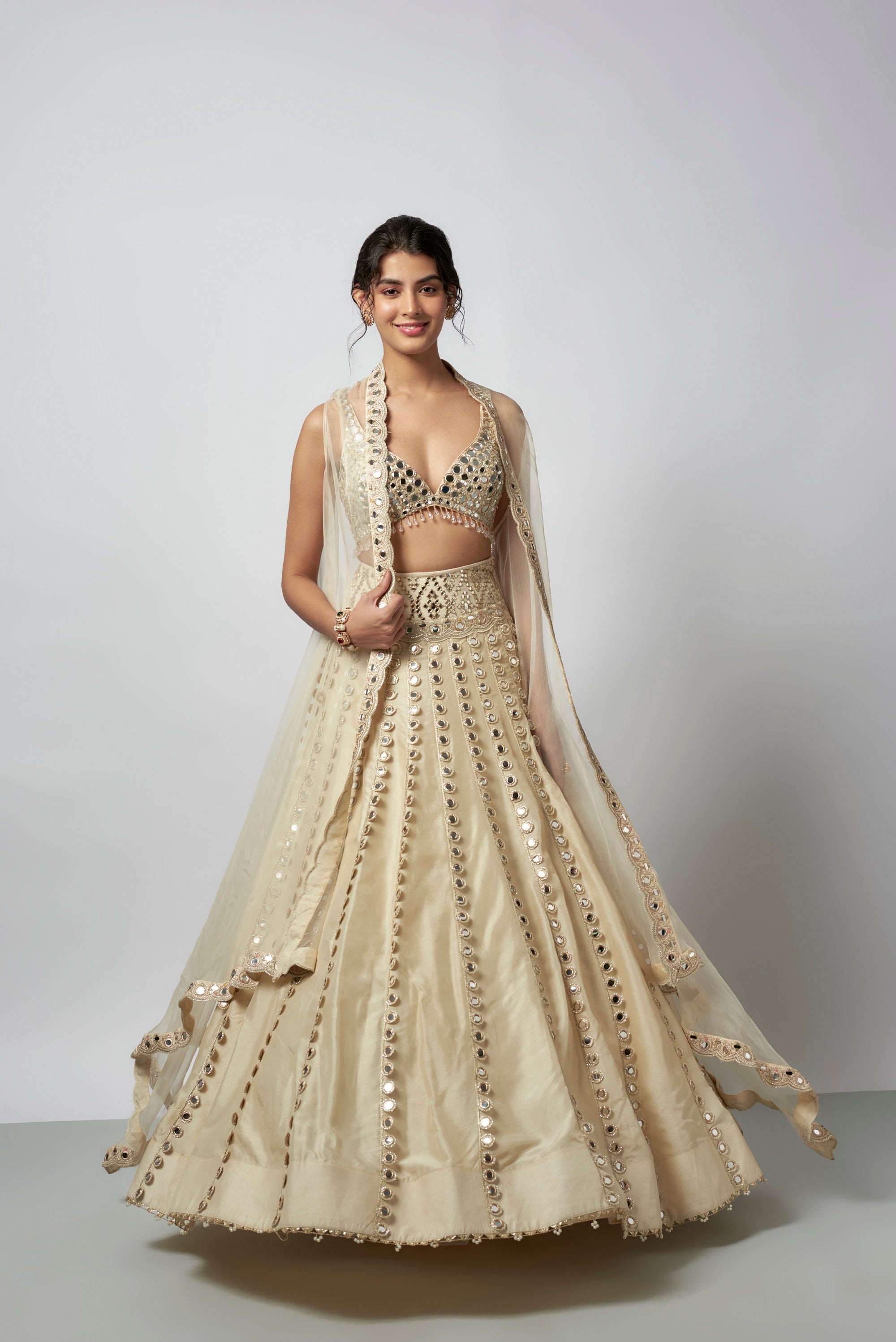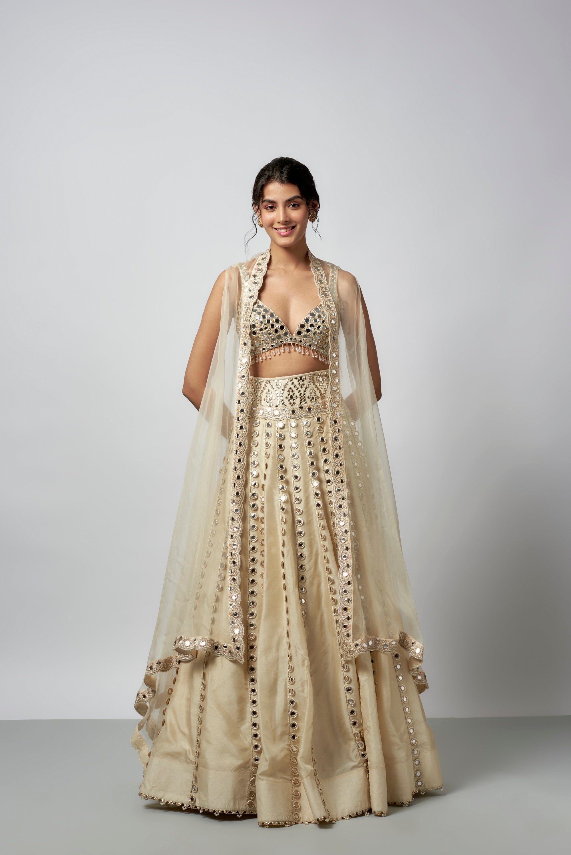This Lehenga Features Hand Embroidered Blouse With Deep V Neckline And Shimmering Mirror Detailing, Accentuated By Dangling Beads Along The Hem. The Lehenga Skirt Is Adorned With Symmetrical Mirror Patterns. A Cape With Scalloped Edges And Mirror Work Completes The Look.