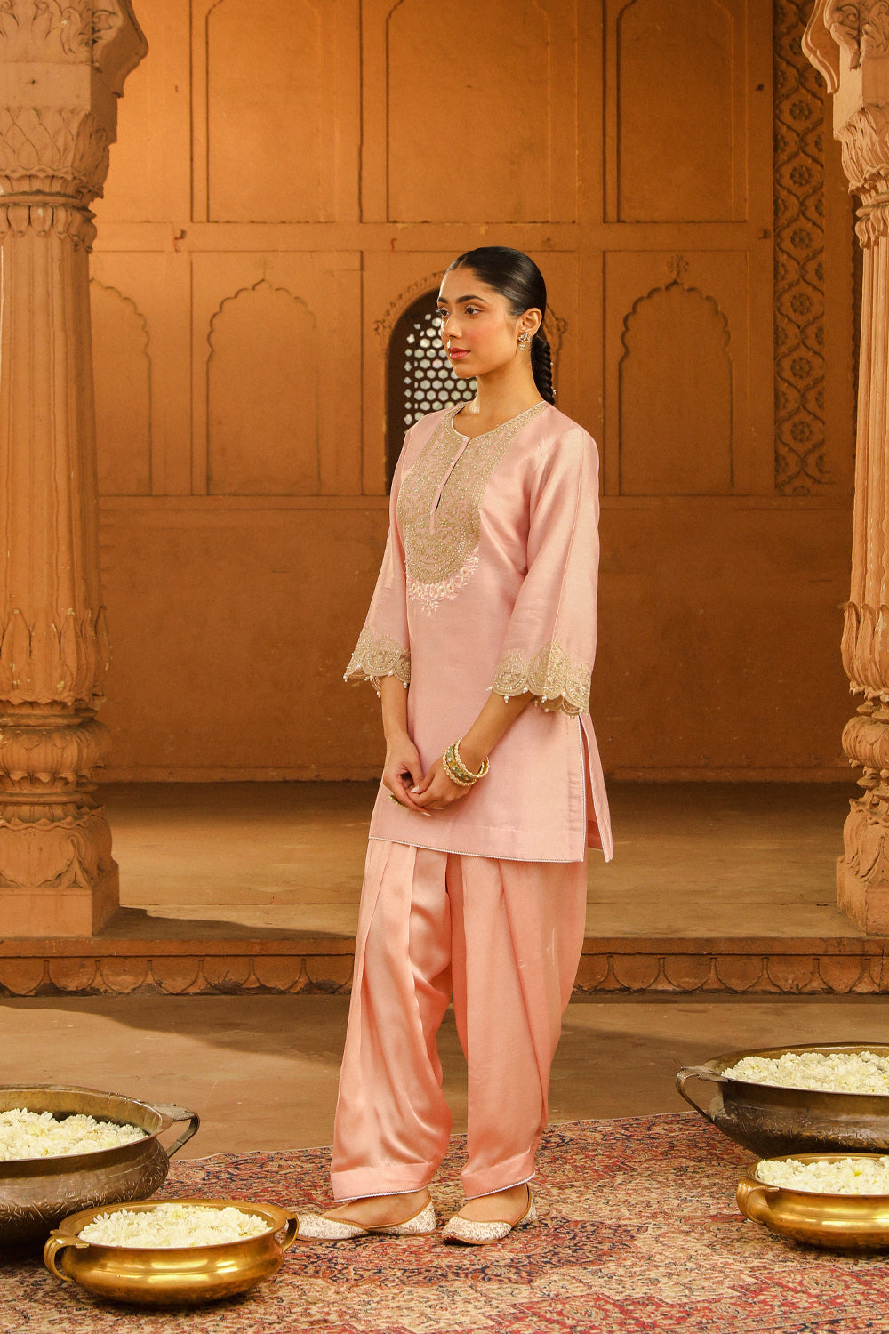 The Arisa short kurta with salwar from our Mehnoor Collection is made in silk chanderi with a dogri salwar. The kurta is having a zero neck with placket and three-quarter bell sleeves. The kurta is adorned with Kashmiri tilla and parsi gara embroidery highlighted with basra moti. The sleeves of the kurta is a having an organza detailing. The outfit is finished with scallop detailing.