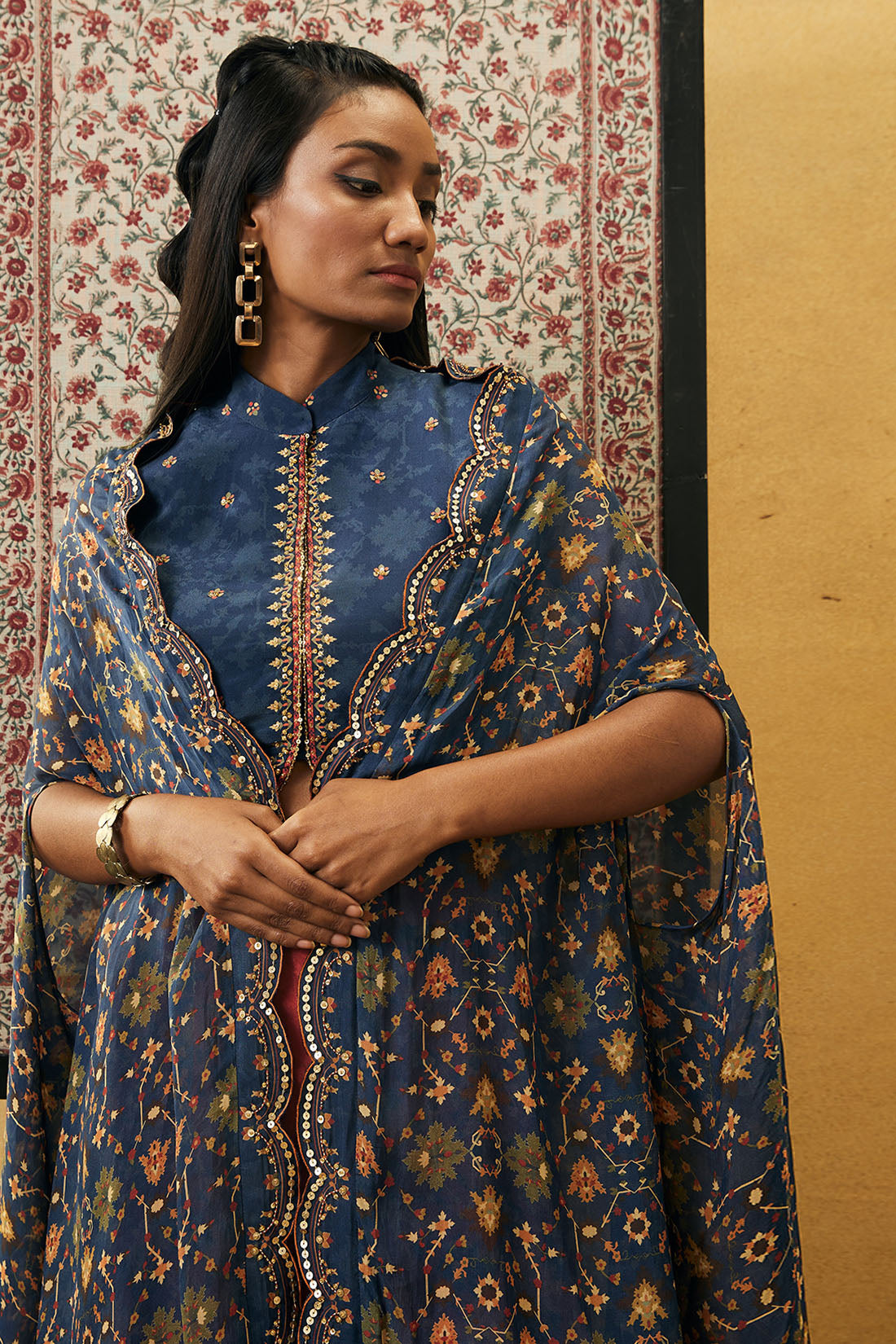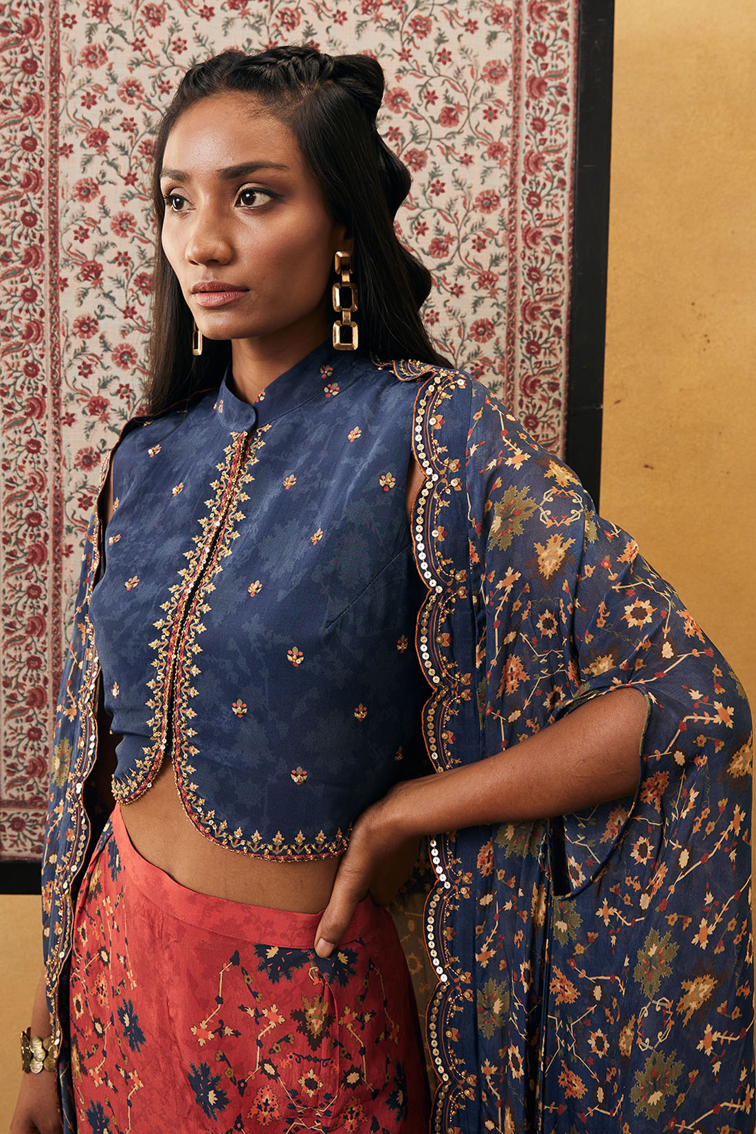 Turn Heads With The Zahra Embroidered Co-Ord Set With Cape In A Stunning Blend Of Blue And Red. Crafted From A Luxurious Mix Of Chiffon And Crepe, This Ensemble Features Intricate Embroidery That Adds Elegance And Texture To Its Contemporary Silhouette. The Flowing Cape Adds A Dramatic Flair, Making It Perfect For Festive Occasions, Cocktail Parties, Or Statement-Making Celebrations. Light, Graceful, And Fashion-Forward, It’s Designed For The Modern Woman With A Love For Tradition And Trend.