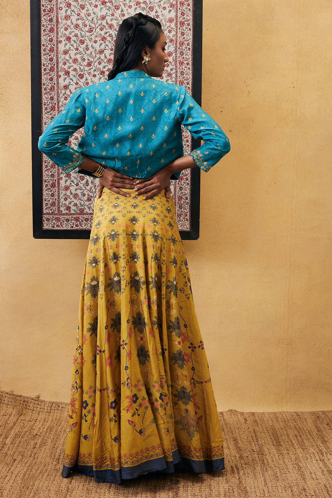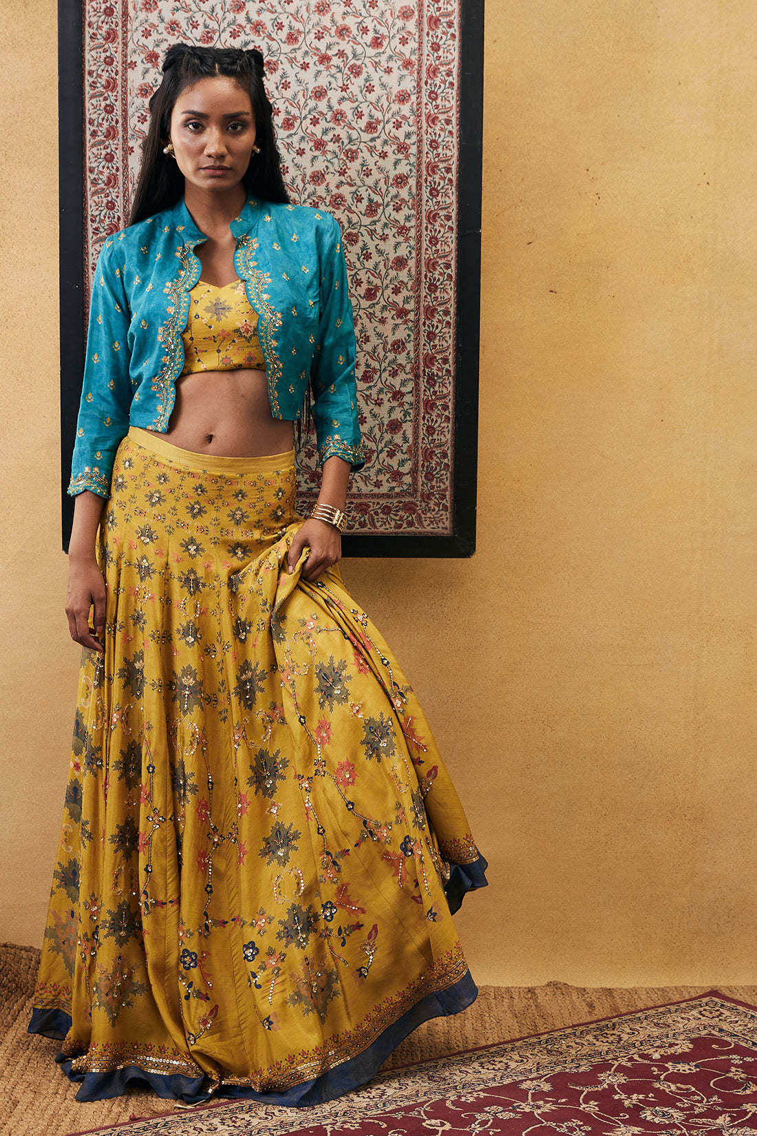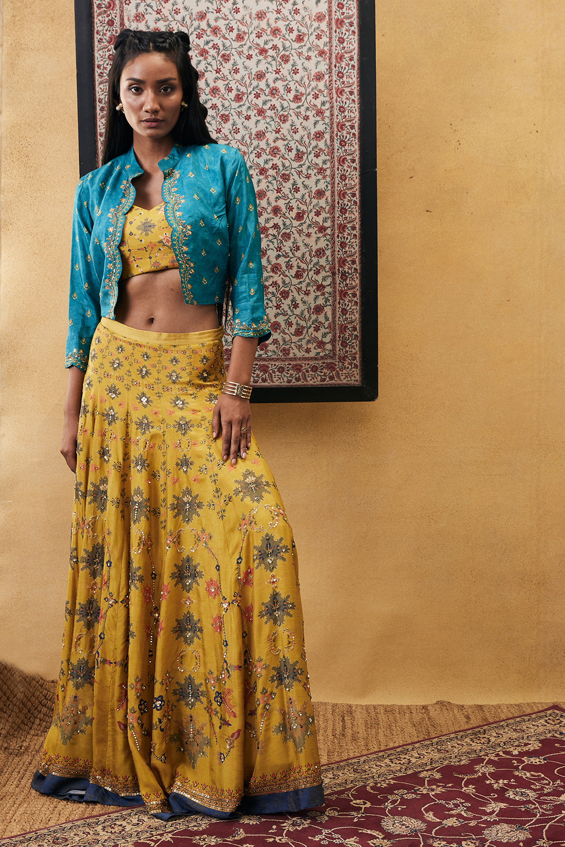 Radiate Festive Charm With The Zahra Embroidered Lehenga Set With Jacket In A Vibrant Yellow Hue. Crafted From Luxurious Malaysian Silk, This Ensemble Features Intricate Embroidery That Adds Richness And Detail To Its Traditional Silhouette. The Flowing Lehenga Is Paired With A Beautifully Tailored Jacket, Offering A Modern Twist To Classic Elegance. Perfect For Weddings, Sangeets Or Special Celebrations, This Set Is Designed To Make A Graceful And Memorable Statement.
