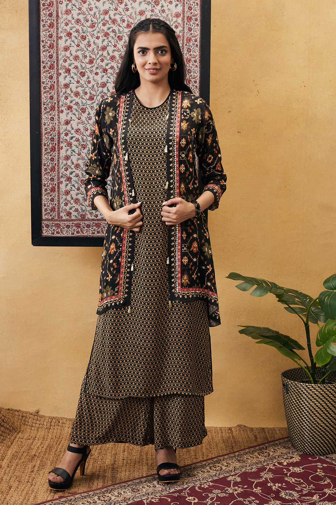 Make a bold yet elegant statement with the Zahra printed kurta set with jacket in classic black. Crafted from lightweight crepe, this ensemble features striking prints that add depth and visual interest, while the coordinated jacket enhances the look with a touch of sophistication. Perfect for festive gatherings, evening events, or contemporary ethnic wear, this set effortlessly blends comfort, style, and grace.