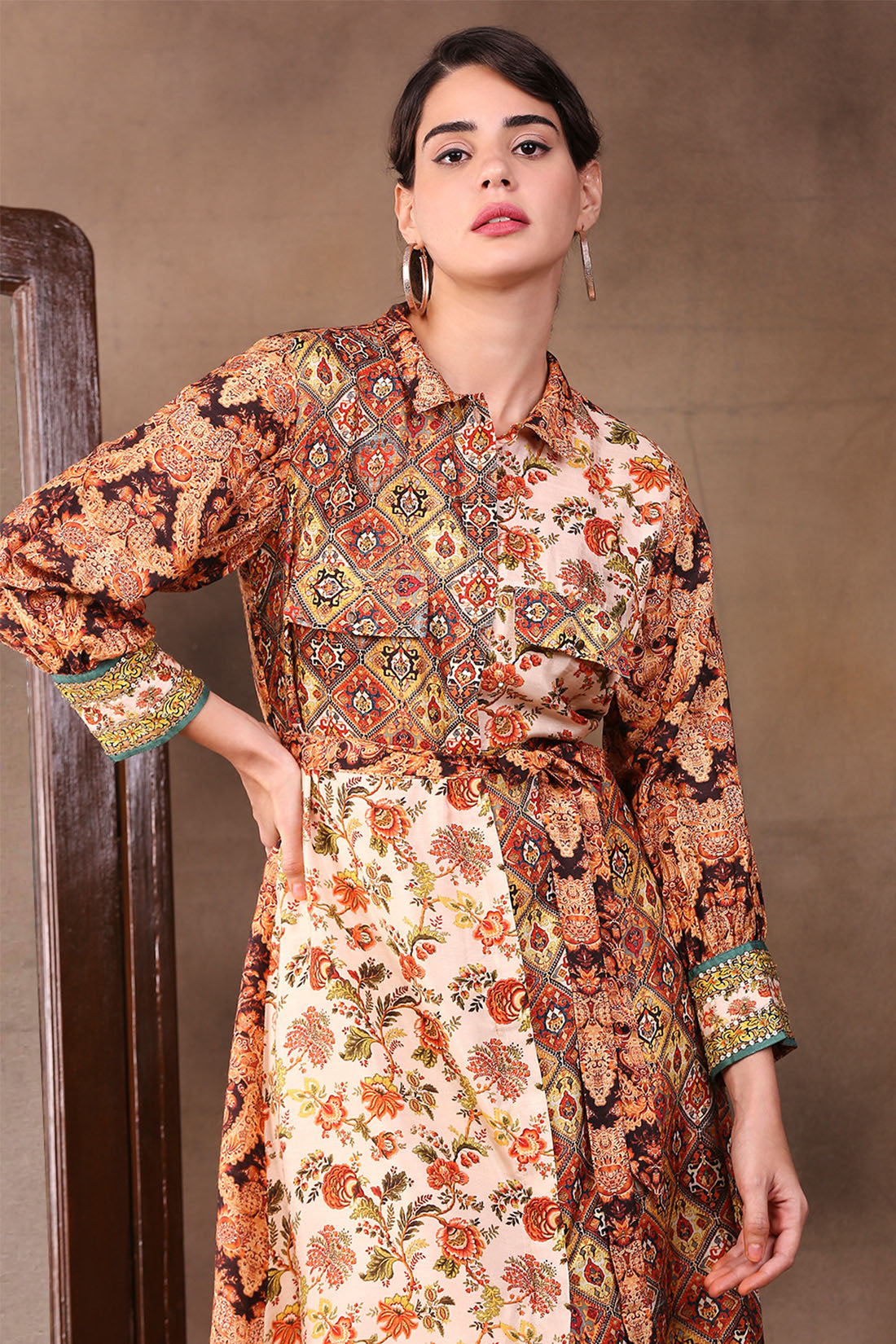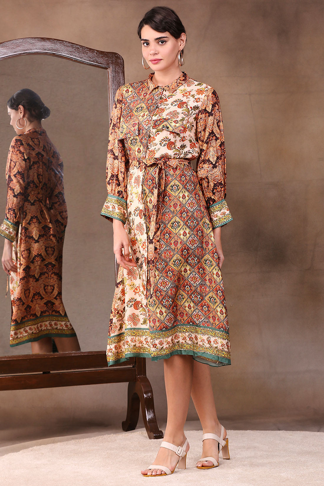 The Ethnic Folklore Printed Shirt Dress With Waist Tie-Up Is A Captivating Fusion Of Contemporary Style And Traditional Charm, Crafted From Luxurious Malaysian Silk. This Dress Offers An Ultra-Soft Feel With A Natural Sheen, Making It Perfect For Both Casual And Semi-Formal Occasions. The Dress Features Intricate Ethnic Folklore Prints, Showcasing Vibrant, Cultural Patterns That Evoke A Timeless Appeal. The Shirt Dress Design Is Both Chic And Versatile, With A Button-Down Front And A Flattering Silhouette That Enhances The Feminine Shape. The Addition Of The Waist Tie-Up Adds Definition, Allowing You To Cinch In The Waist For A More Tailored Fit Or Wear It Loosely For A Relaxed, Effortless Look.
