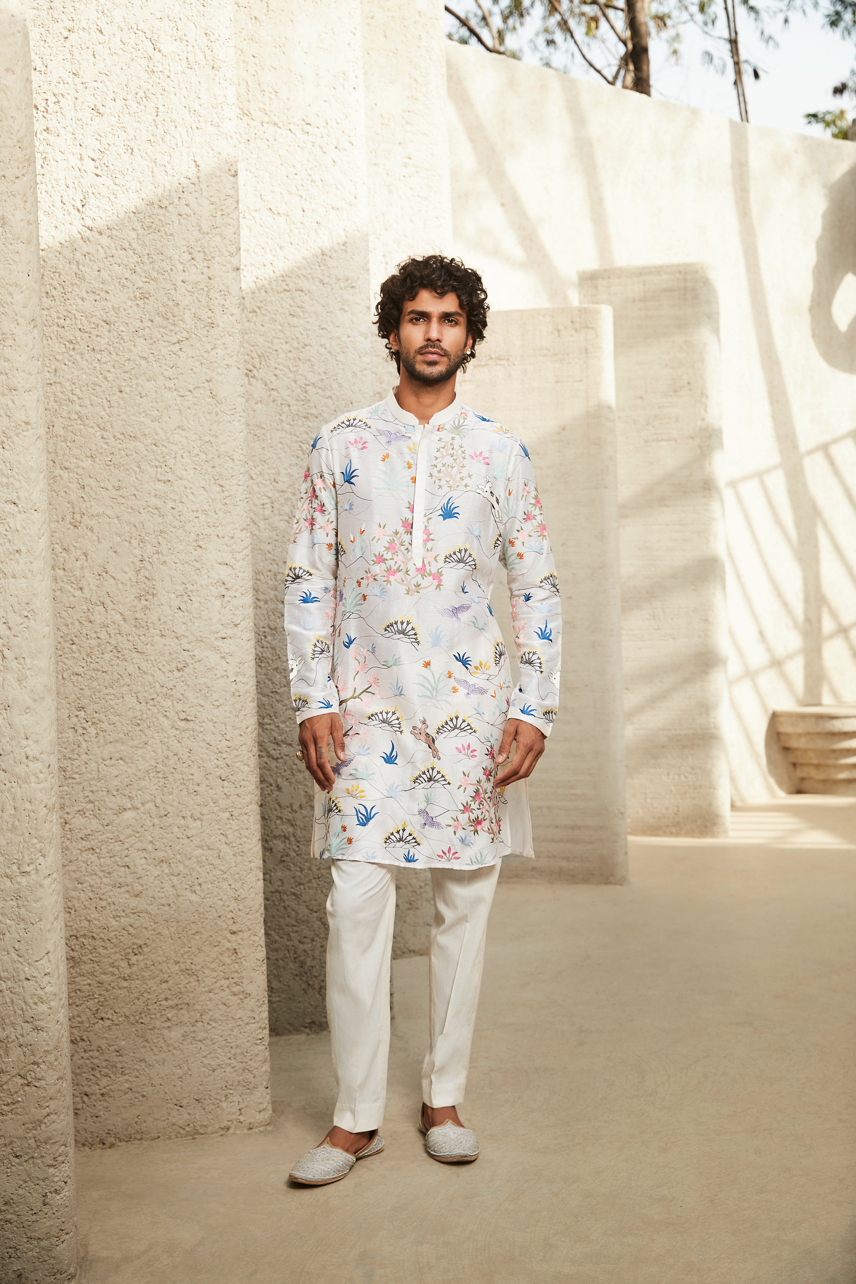 Bursts of colour adorn a pared-down ivory-hued base in this pure chanderi kurta set, a part of Matsya's Heritage Pret '23 line. Bringing the meticulous motifs to life is the multicolour aari resham threadwork, inspired by the vivaciousness of longstanding Indian culture. Inspired by one of Utkarsh's moms shawls the kurta is an ode to the craft of Matsya.