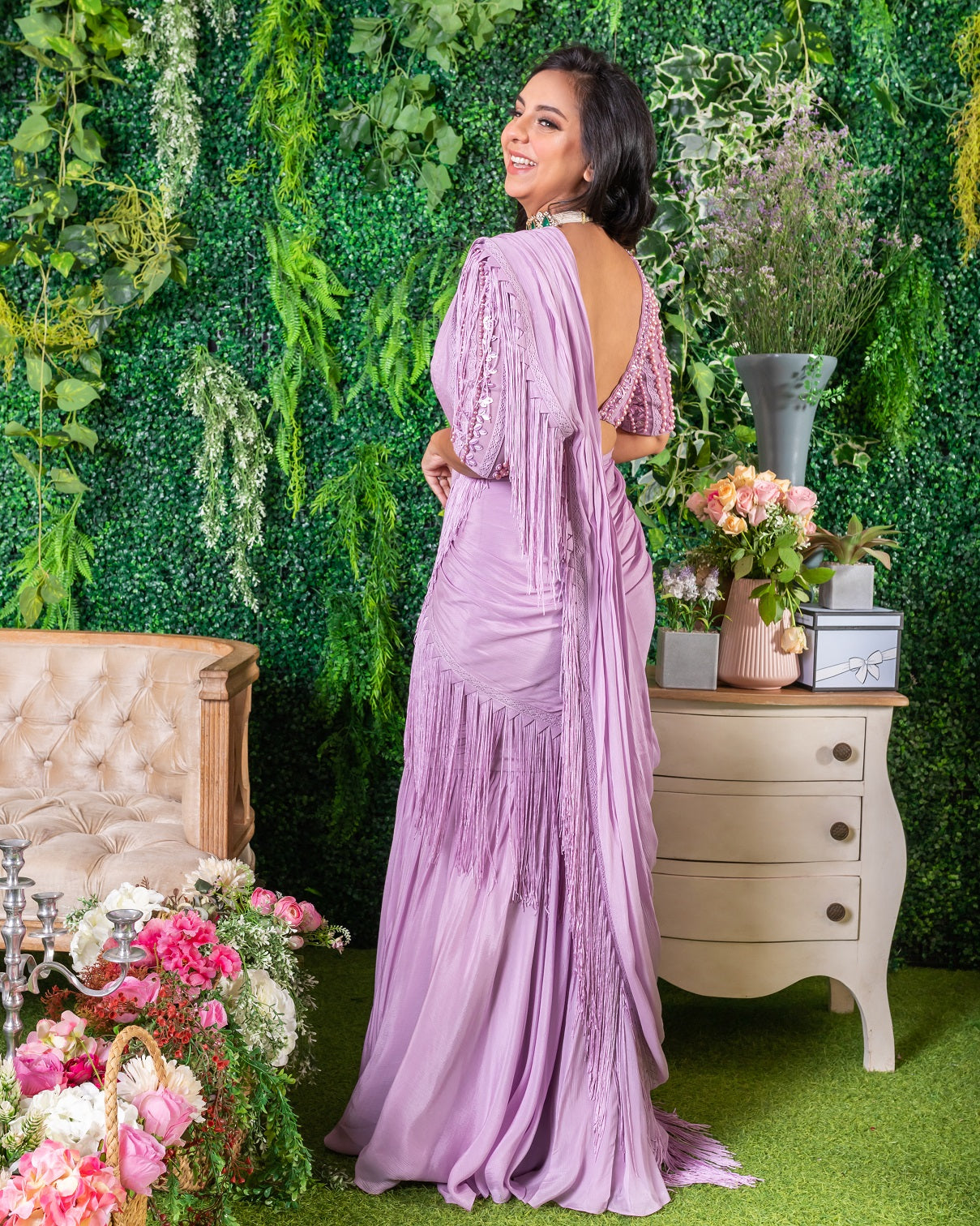 Featuring a grape saree in chiffon and tulle base with fringe, lace, samoosa patti and pearl hand work. It is paired with a matching blouse