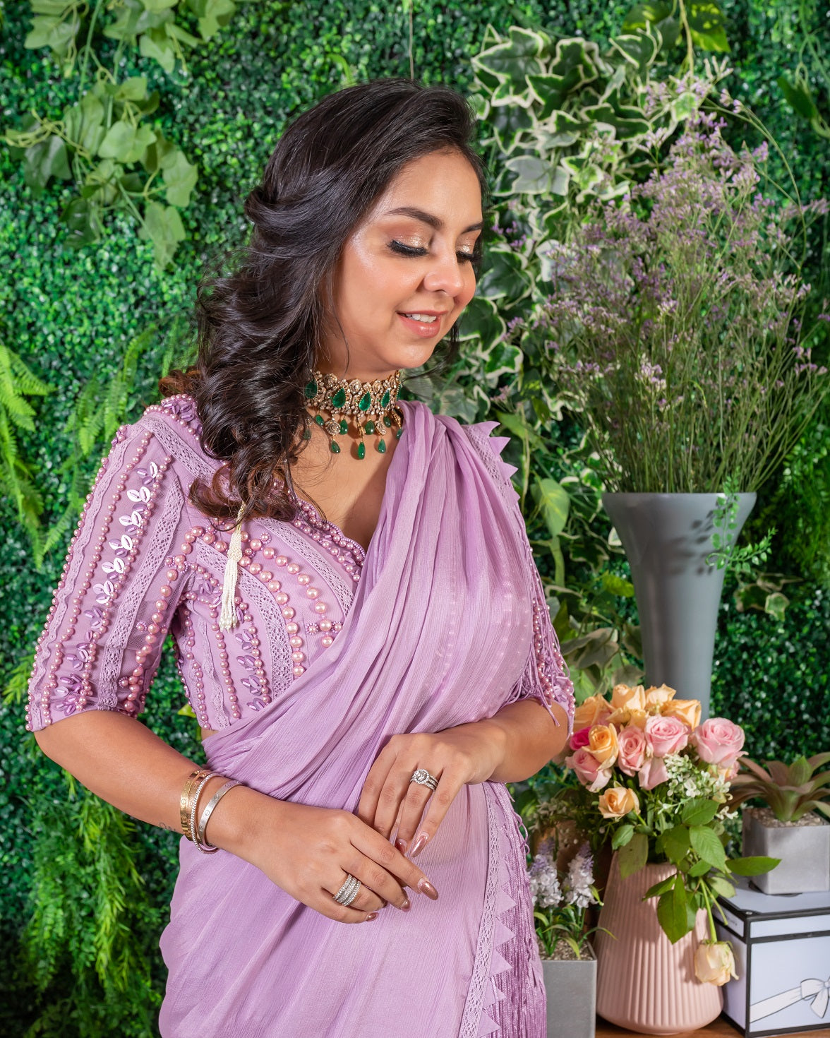 Choose accessories that complement the shade of pink in your saree. Silver or gold jewelry can both work well depending on the undertone of the pink. Consider statement earrings, bangles, or a necklace to enhance your look