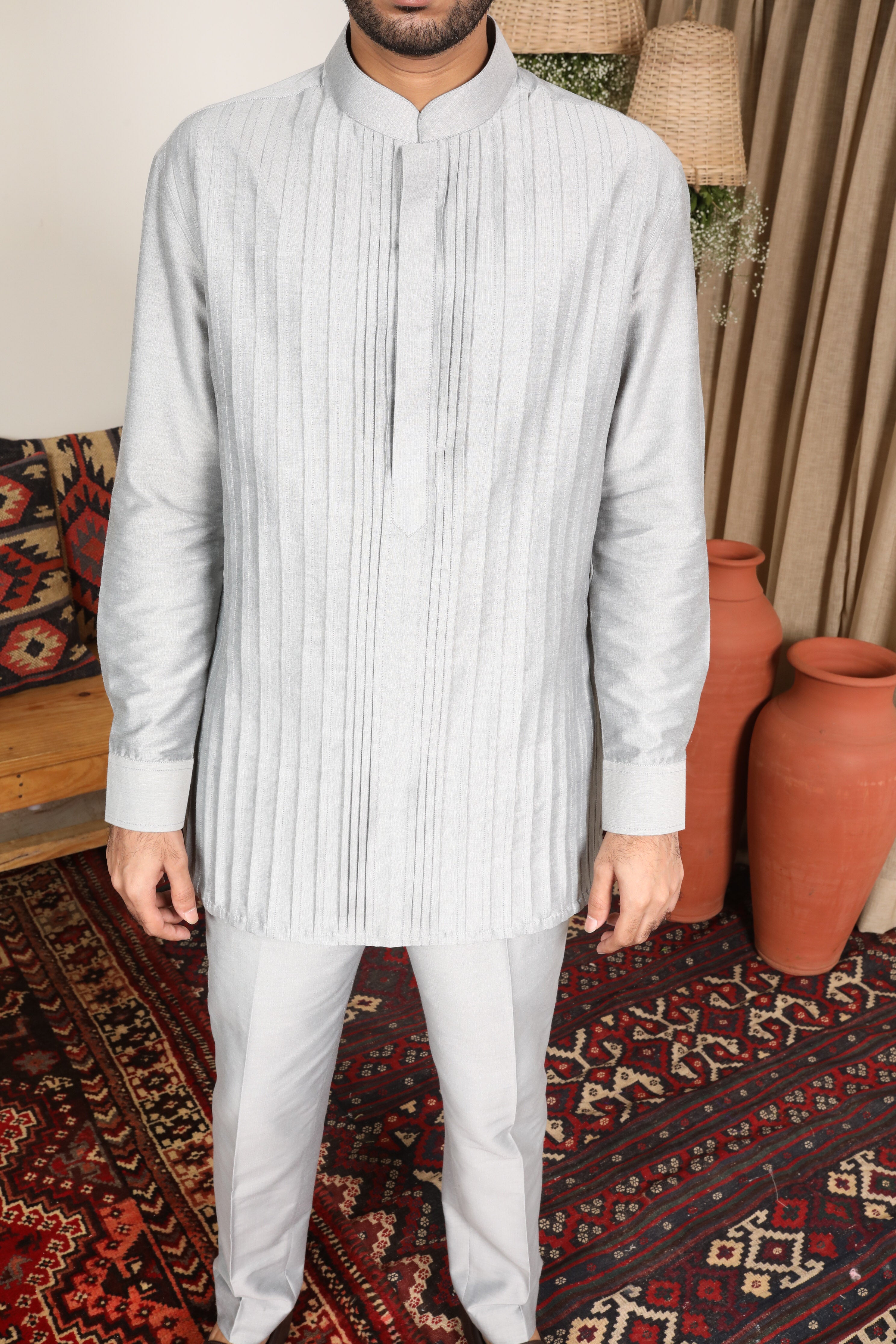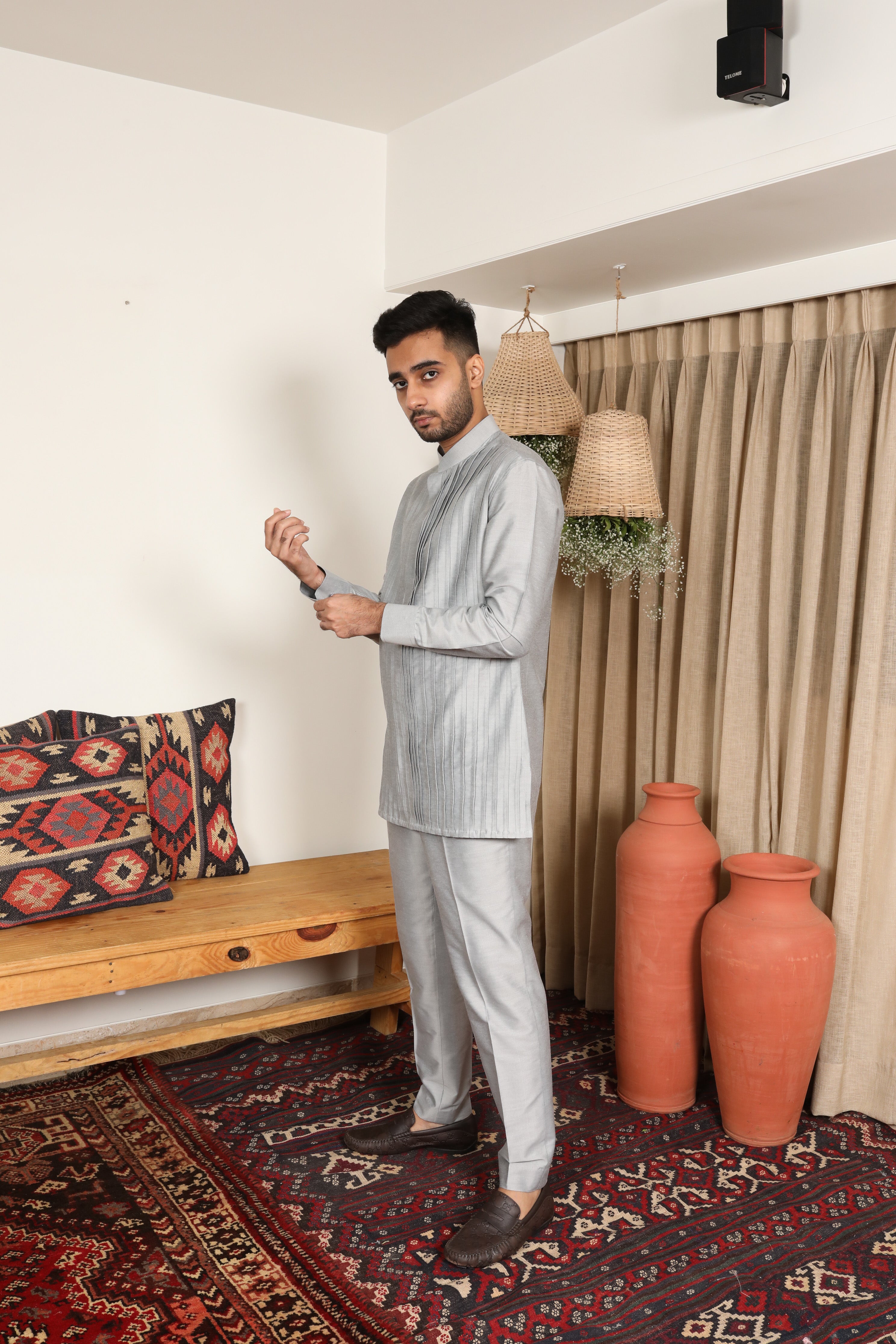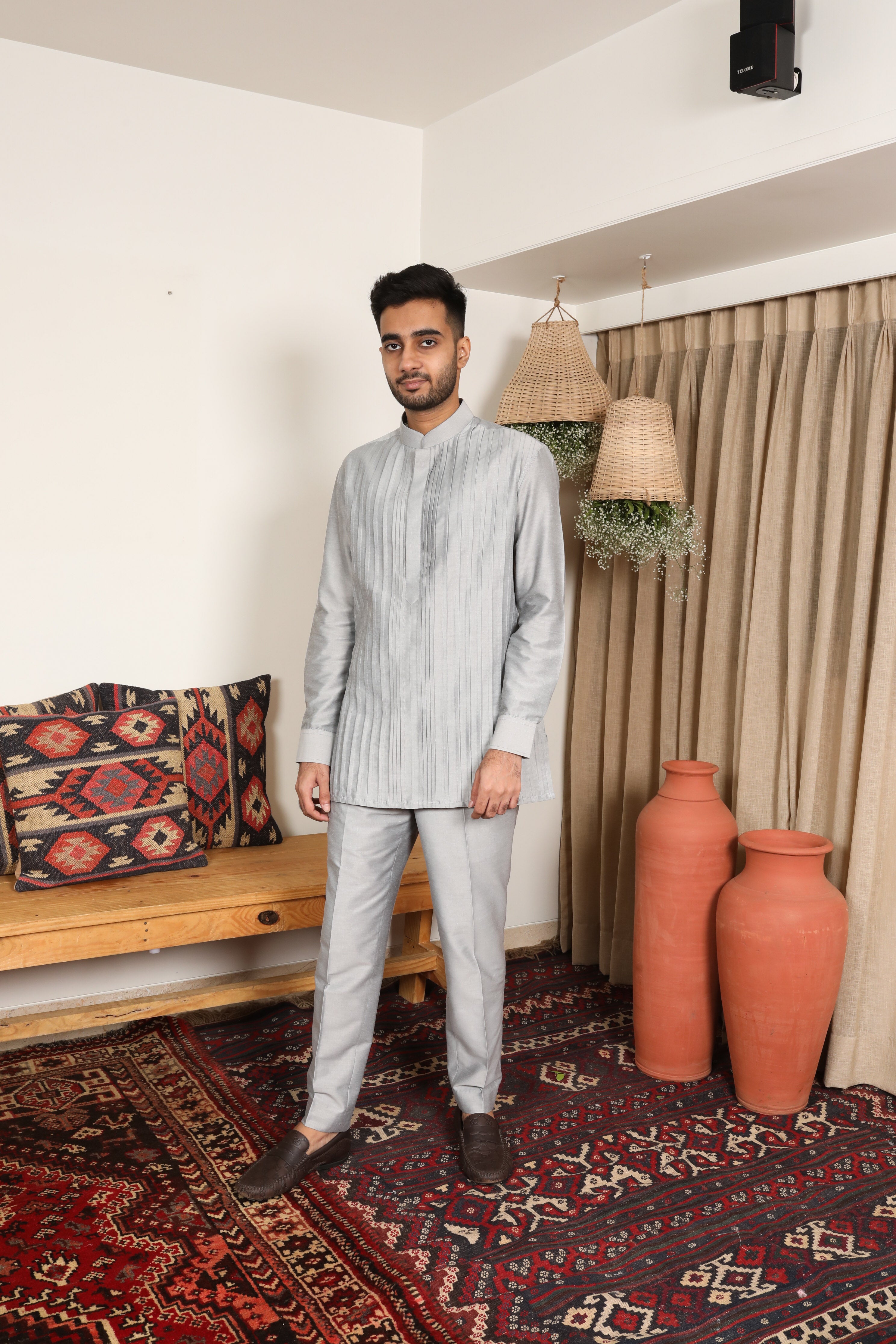 Featuring a grey kurta and pant set. It has a textured pleated fabric.