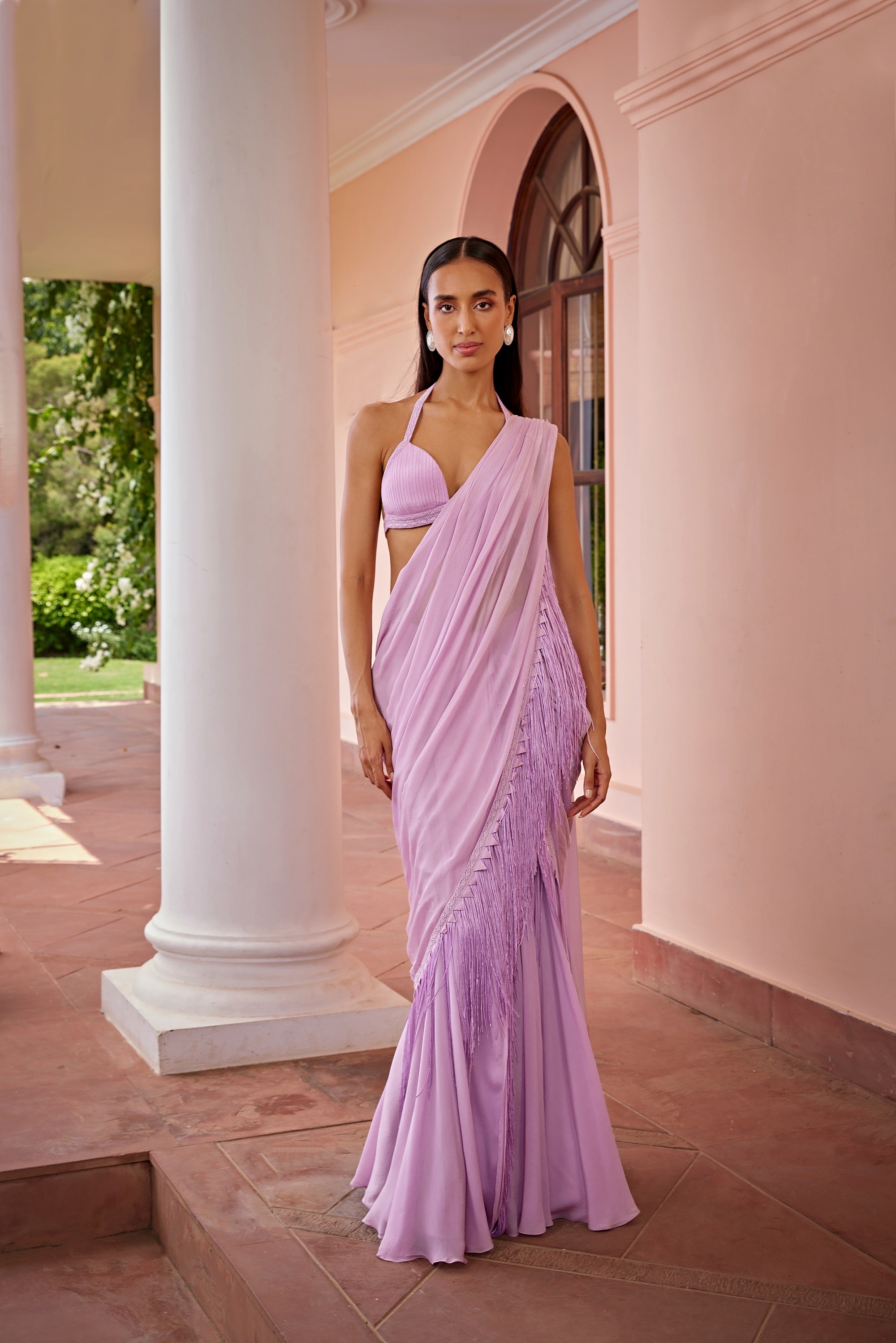 FEATURING PRE DRAPED CHIFFON SARI WITH FRINGES PAIRED WITH HALTER NECK BLOUSE