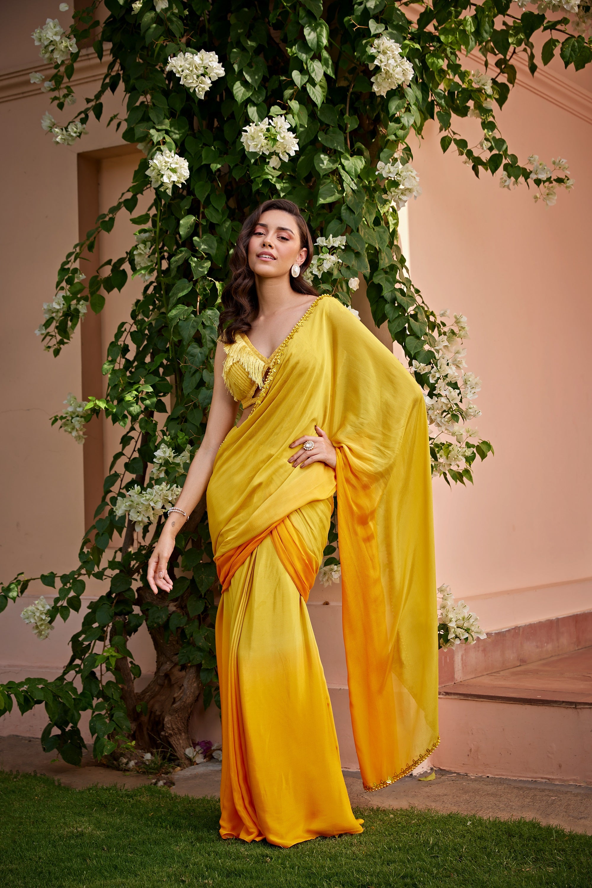 FEATURING PRE DRAPED TWO TONE SARI PAIRED WITH FRINGE AND PEARL EMBELLISHMENT ON THE BLOUSE