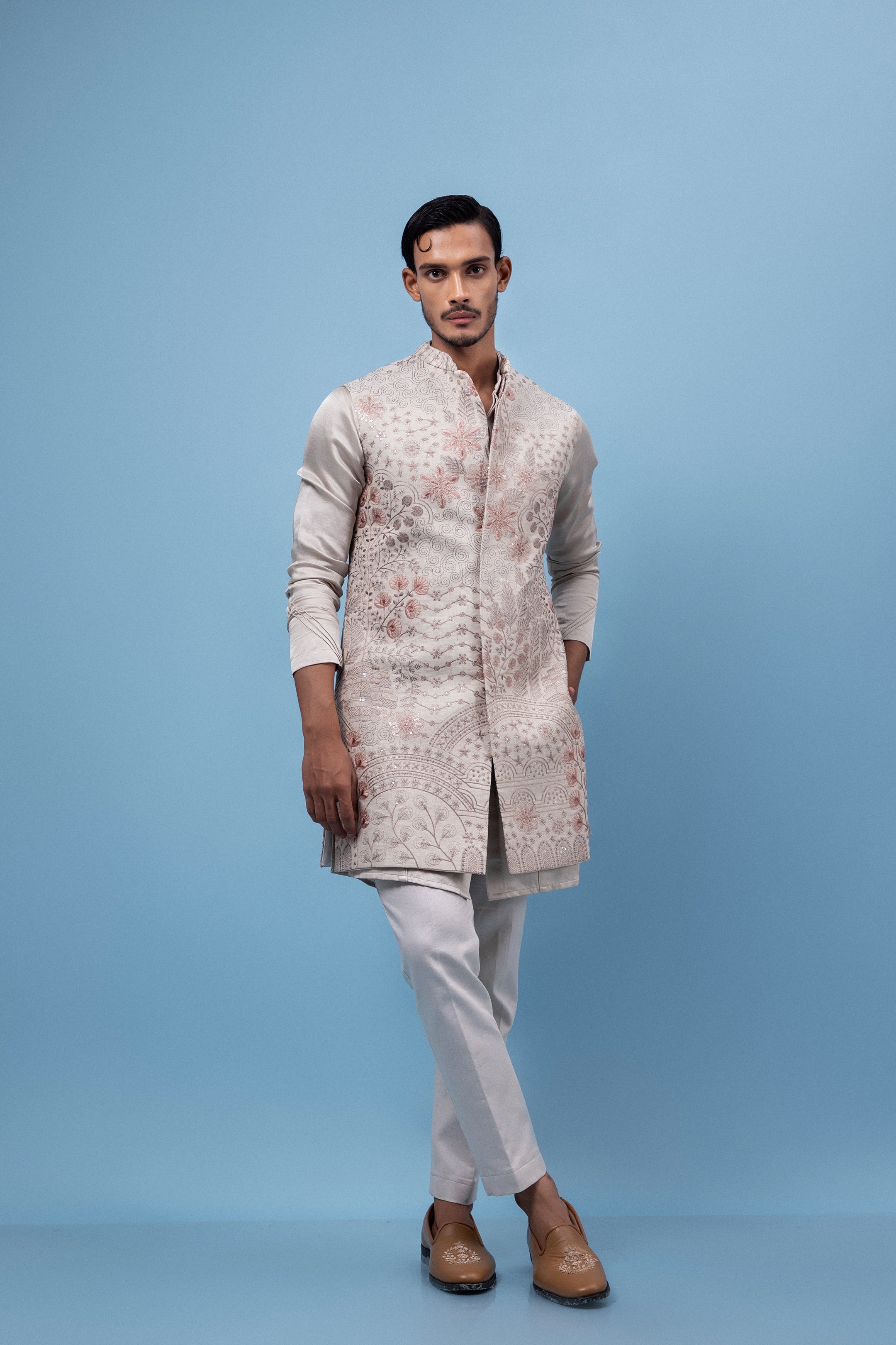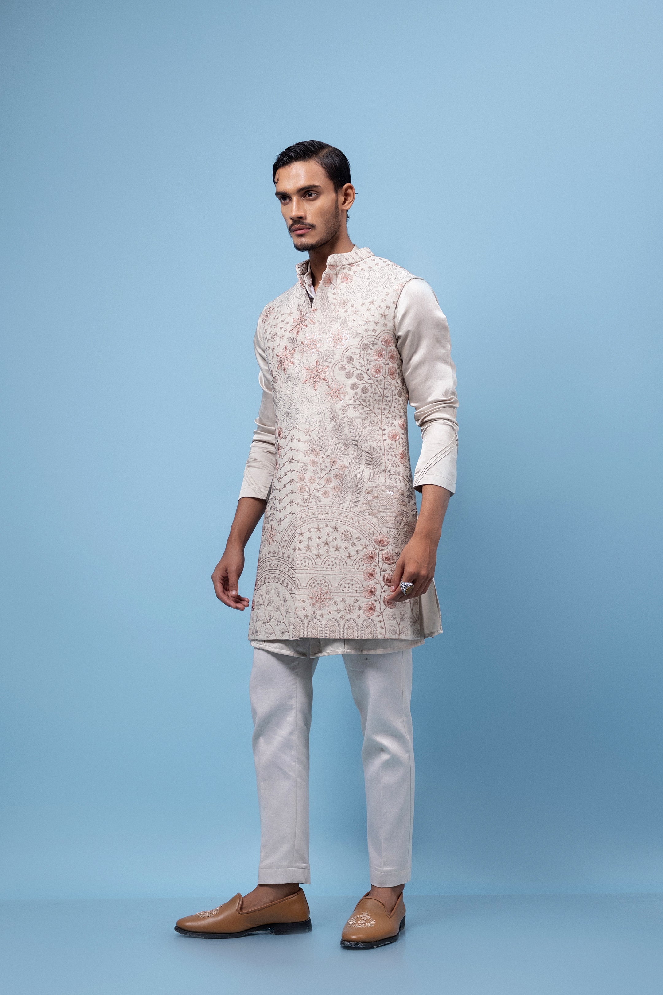 A beige linen long Nehru jacket adorned with vibrant multicolor floral threadwork, blending natural elegance with artistic flair.