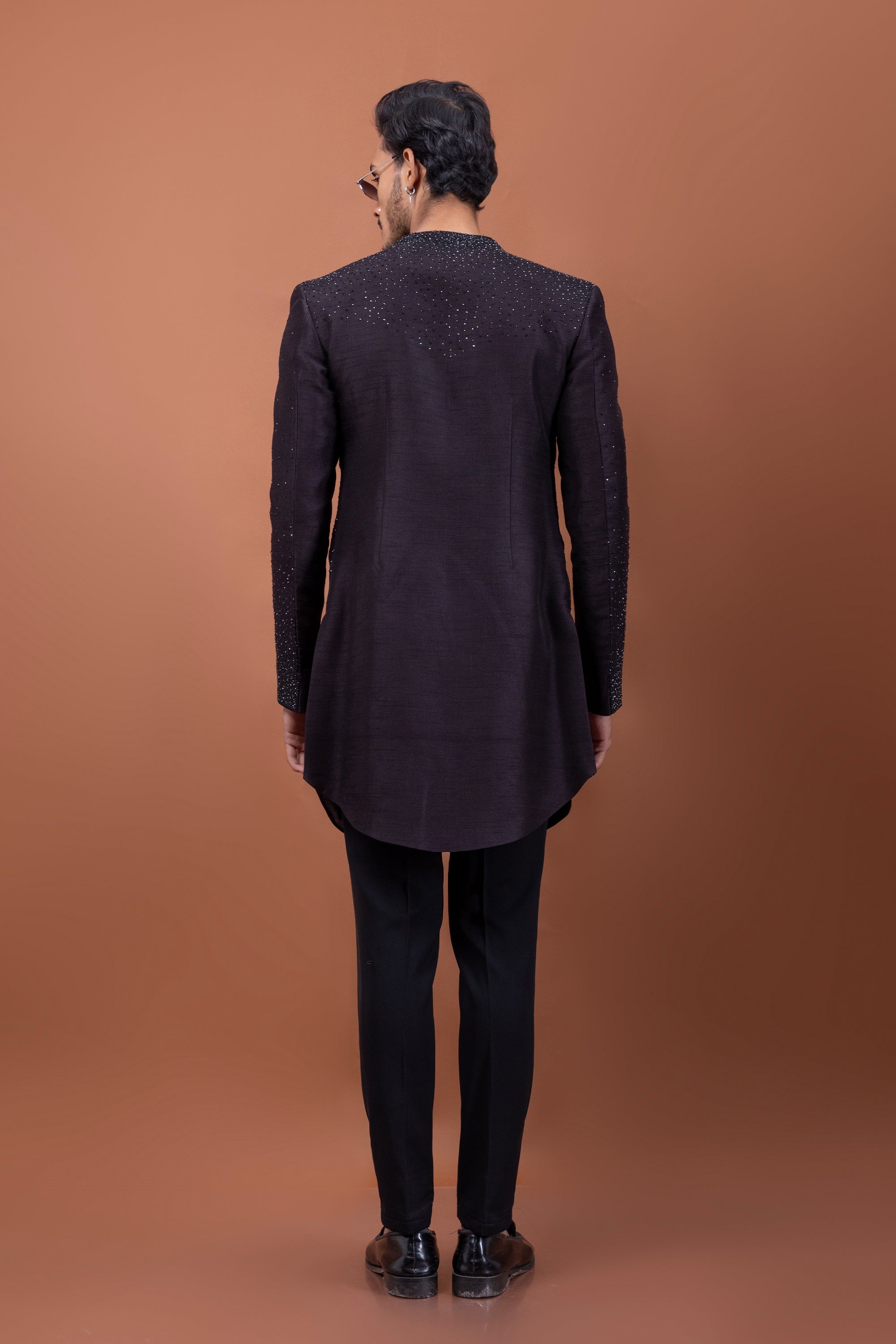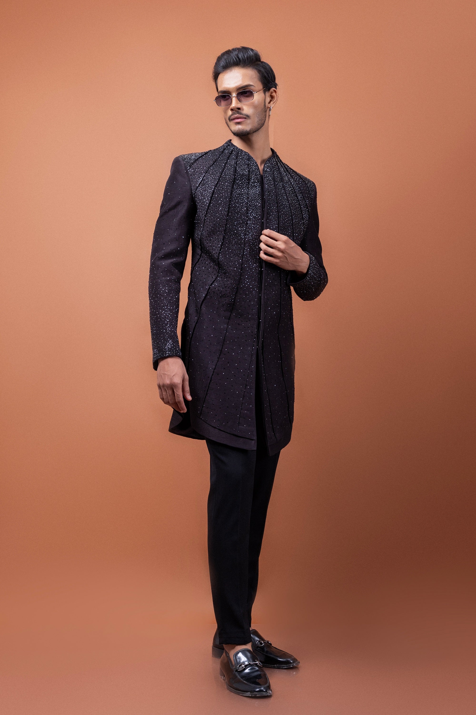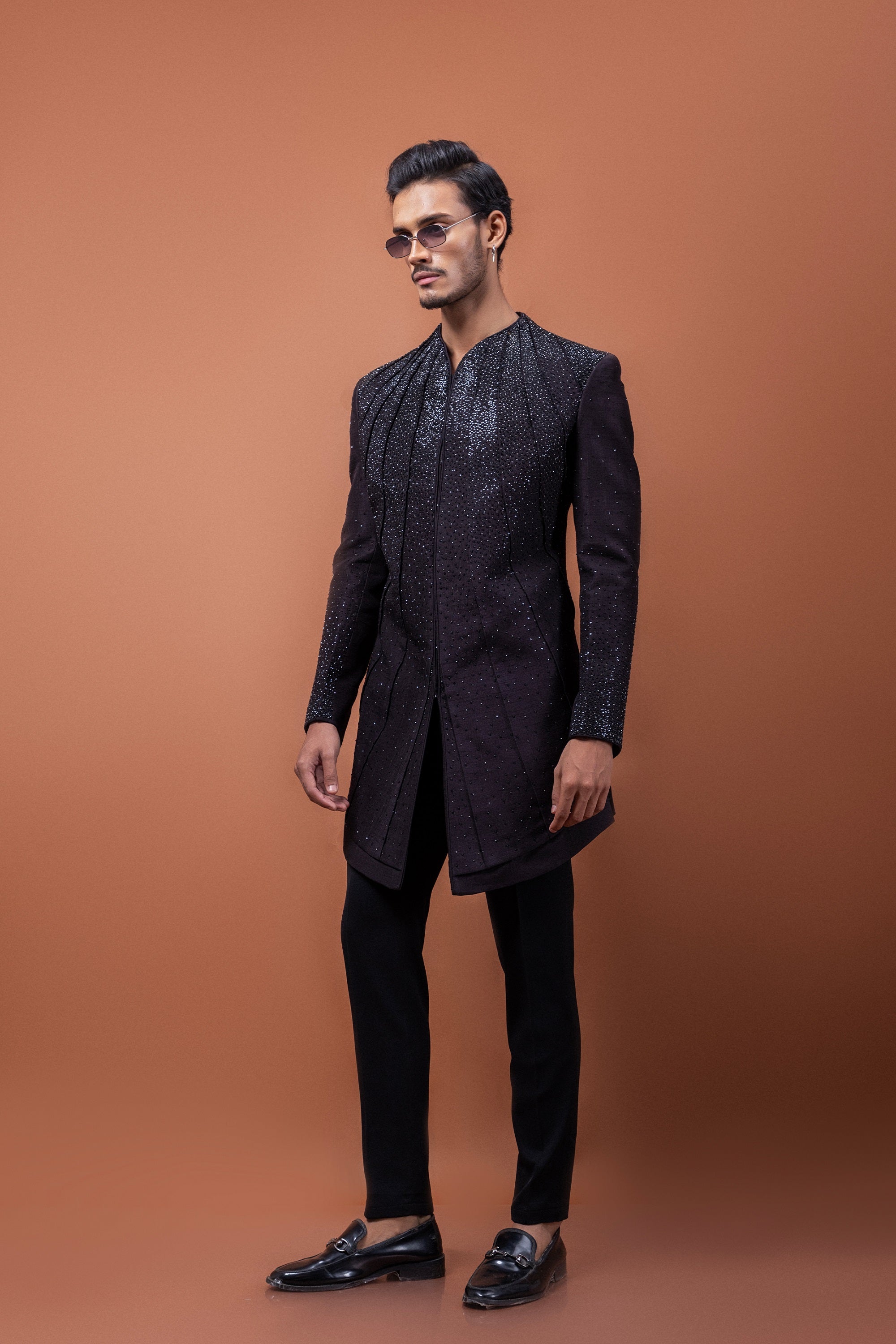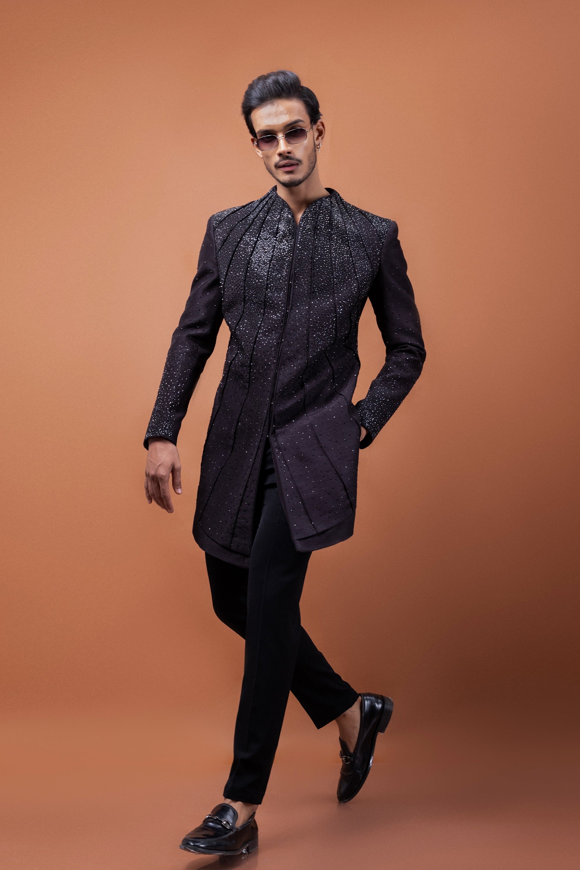 A harmonious blend of tradition and contemporary flair, this Oreo Brown Achkan is designed for the modern gentleman who values elegance with an edge. The refined pleated construction adds depth and movement, while intricate hand-embroidered stonework elevates the ensemble with a subtle shimmer.