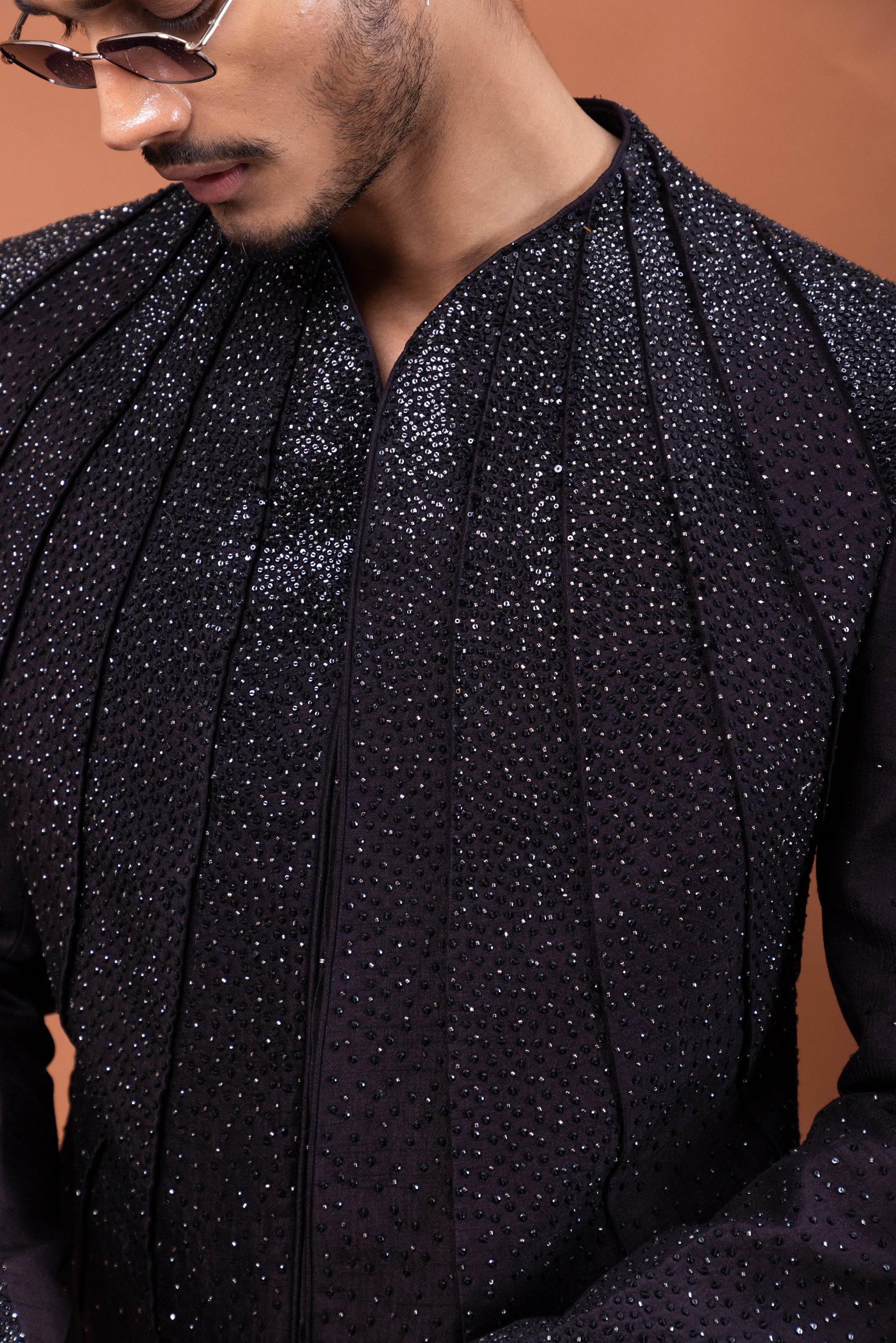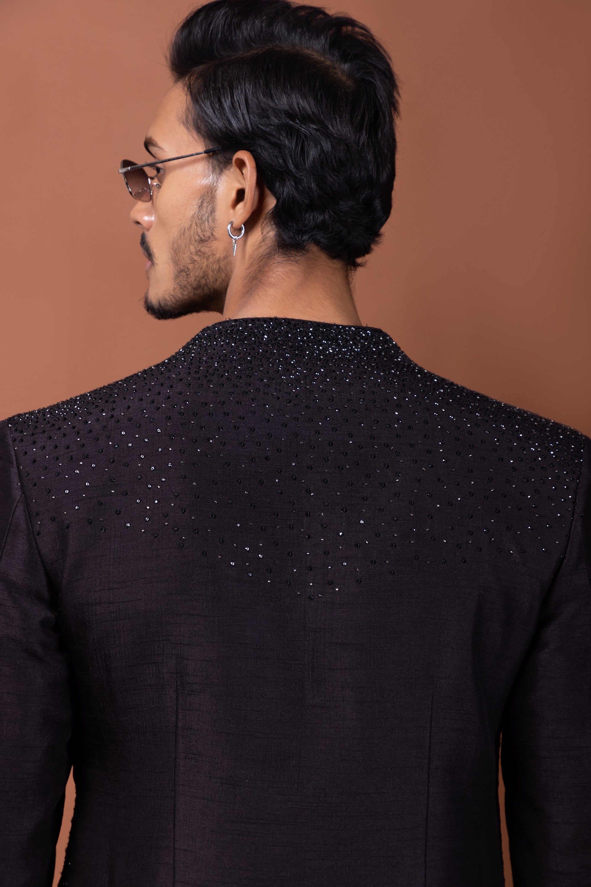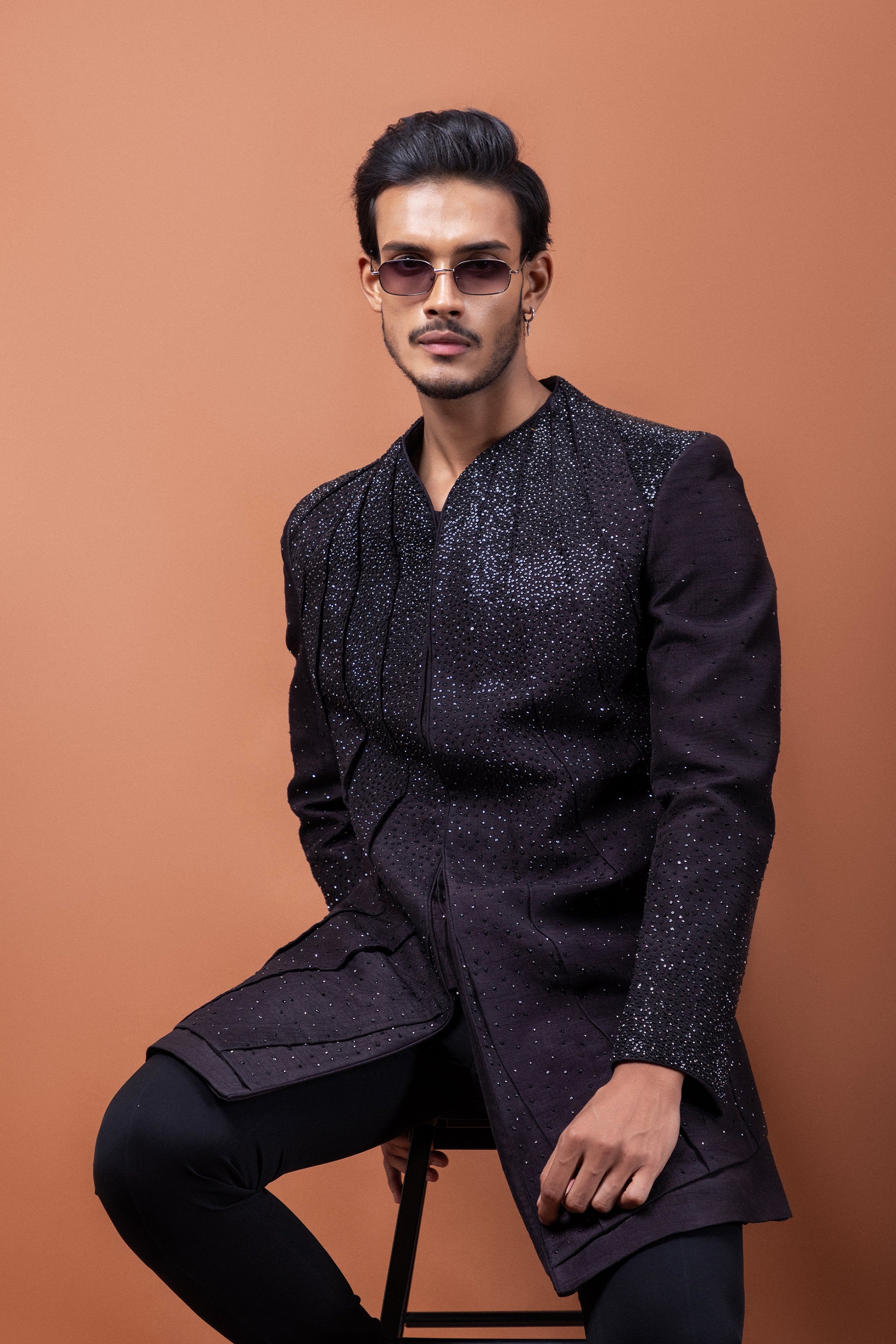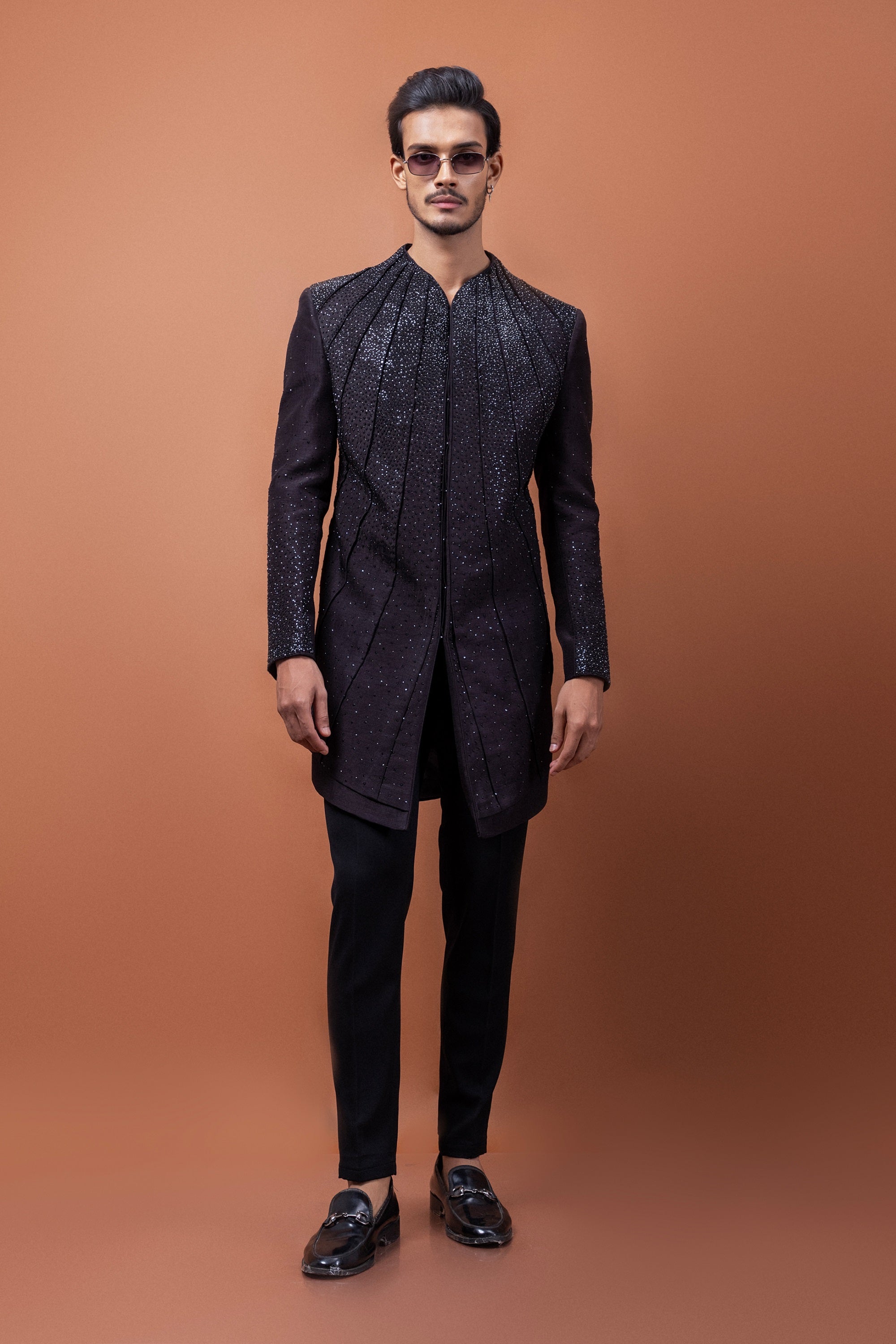 A harmonious blend of tradition and contemporary flair, this Oreo Brown Achkan is designed for the modern gentleman who values elegance with an edge. The refined pleated construction adds depth and movement, while intricate hand-embroidered stonework elevates the ensemble with a subtle shimmer.