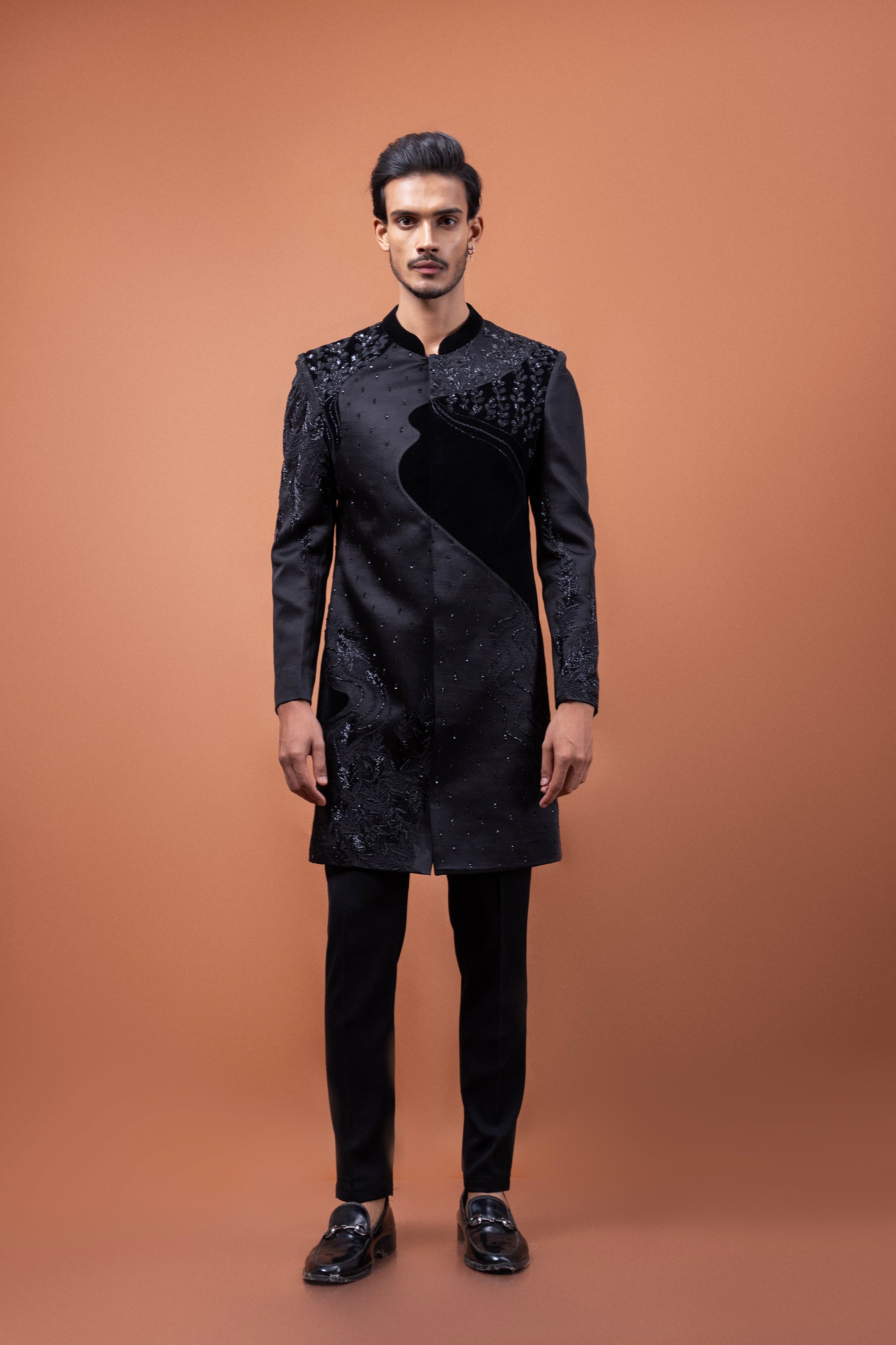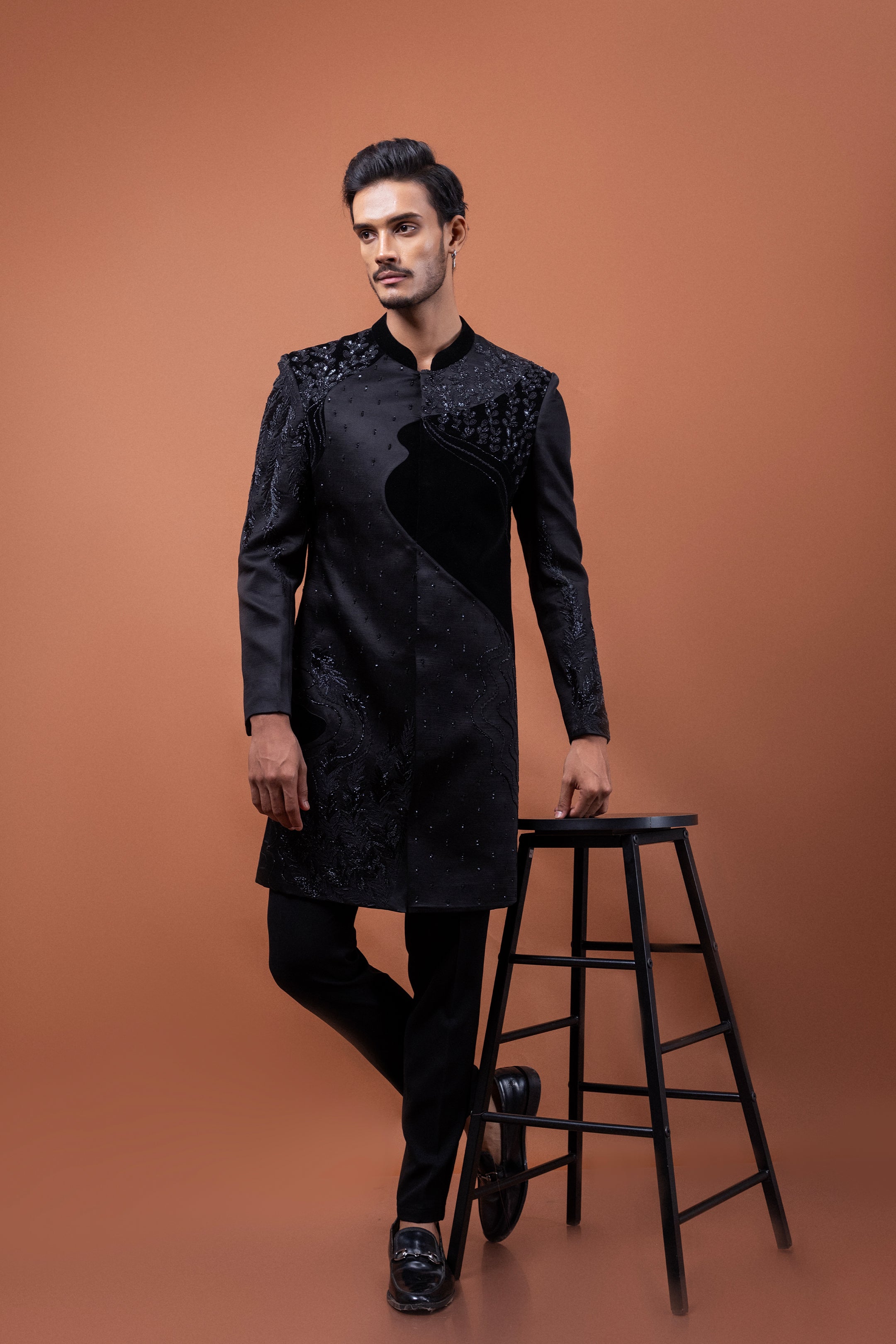 Intricate leaf motif embroidery delicately graces the silhouette, hand-worked in traditional techniques of kathdana, dabka, and kora, creating a luxe interplay of shimmer and shadow. Each element of embroidery is meticulously placed, echoing the elegance of nature in a regal black canvas.