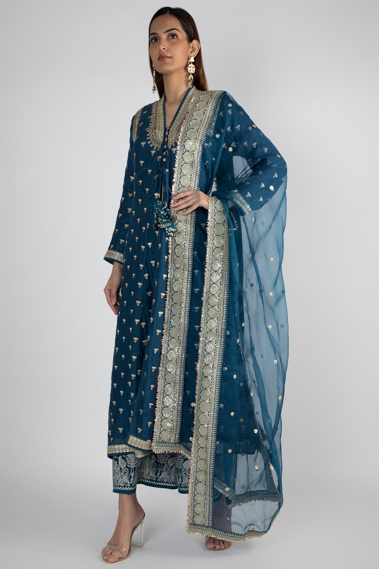 Delicate lotus buttis on chanderi silk. This flattering, front open jacket style tunic is paired with a cotton embroidered palazzo and a stunningly embellished pure organza dupatta. The neckline is enhanced with dori and sequins zardosi embroidery.